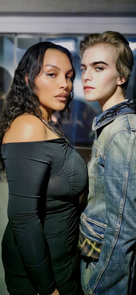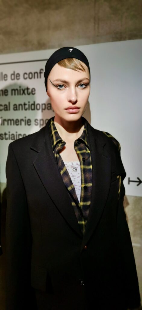 Pour accompagner cette vision, Pat McGrath imagine un maquillage où minimalisme rétro et éclats cybernétiques se rencontrent, créant une esthétique hybride entre glamour digital et grunge sophistiqué.