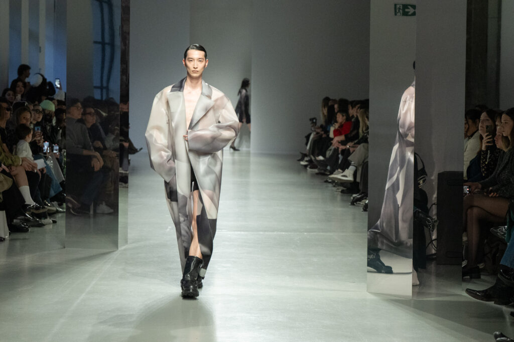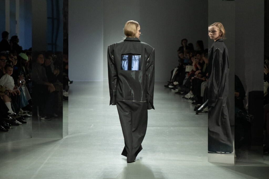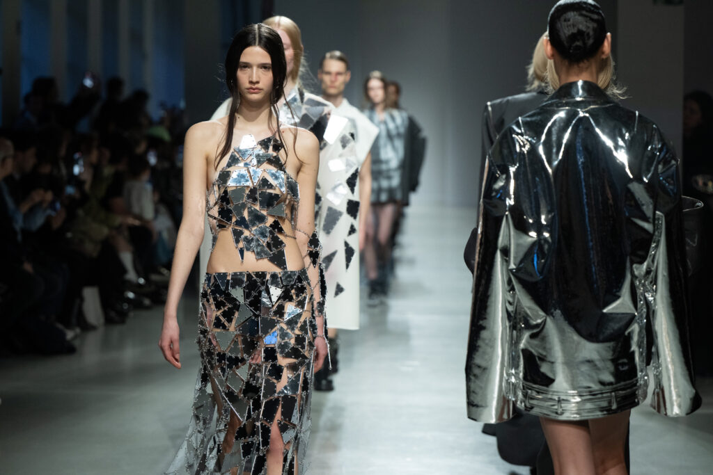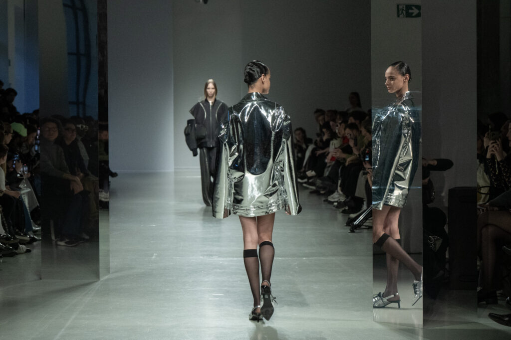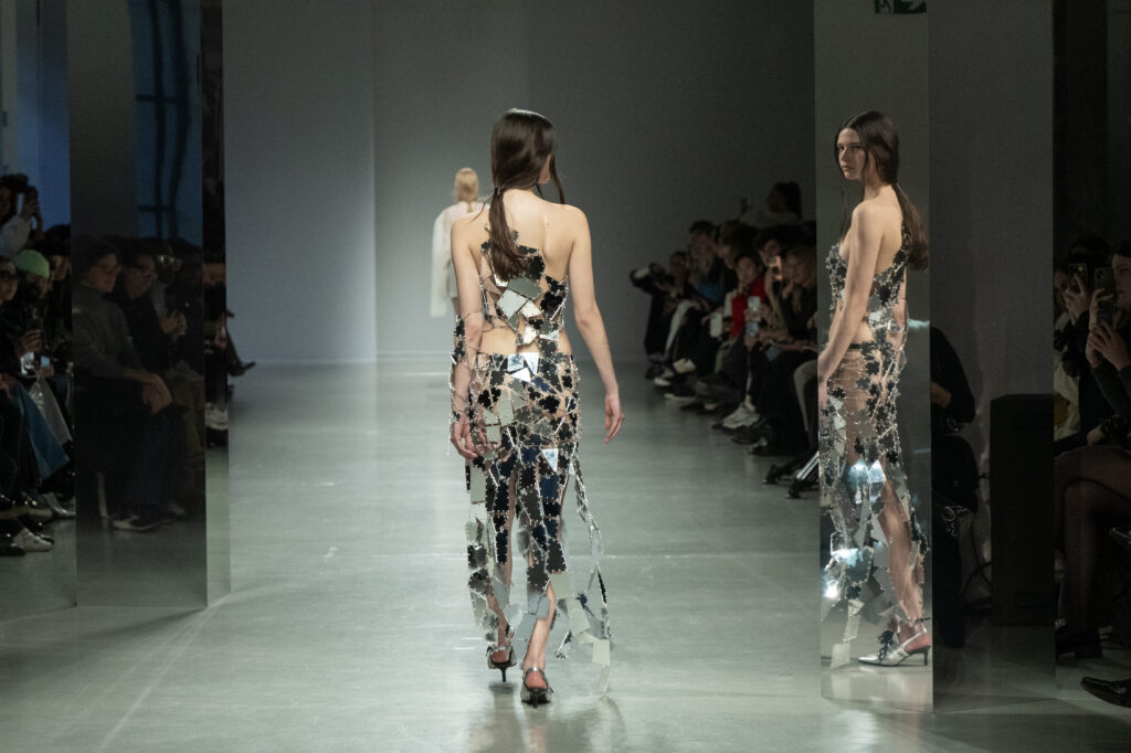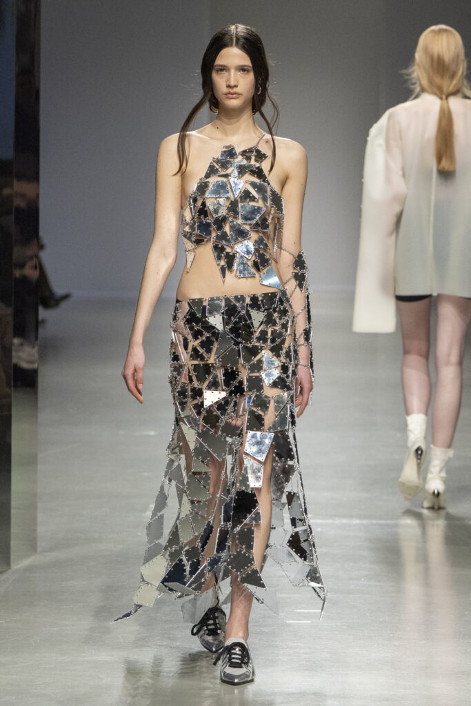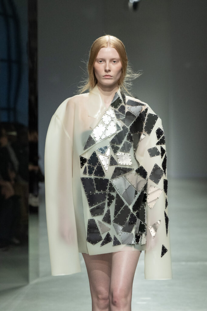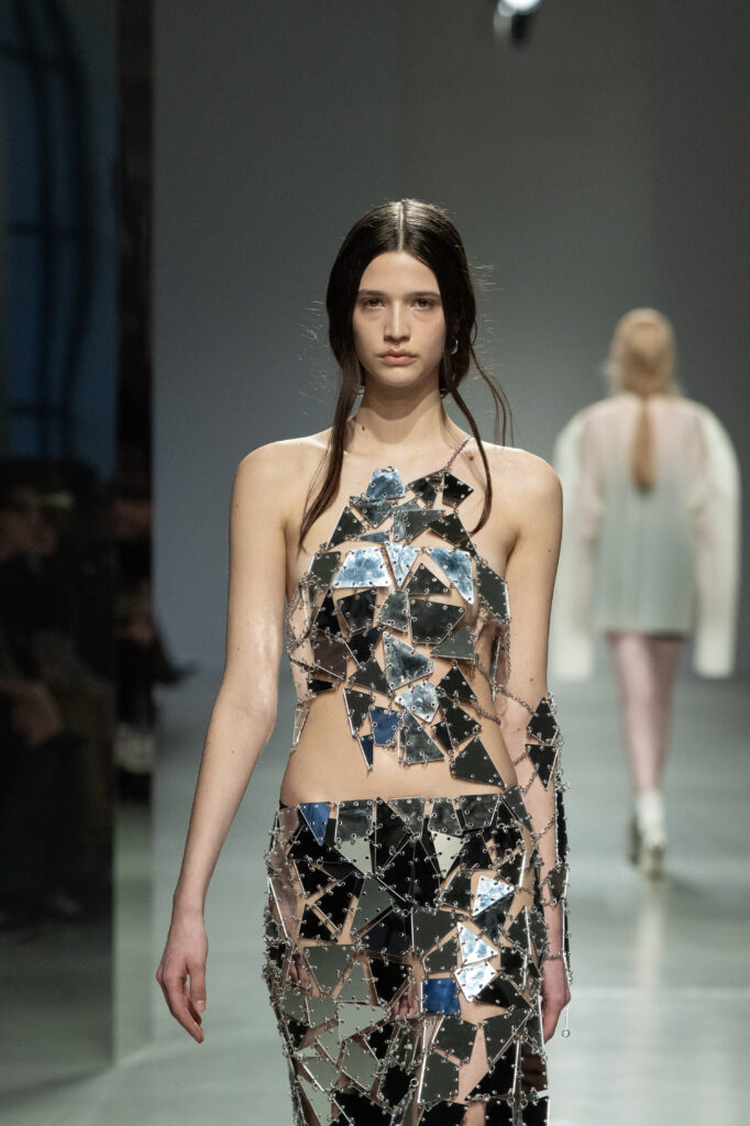 Les coupes, précises et architecturées, jouent sur les contrastes entre rigidité et fluidité, avec des structures rigides en opposition à des drapés aériens. Les effets miroir ne sont pas seulement esthétiques : ils questionnent la mode comme un outil de transformation, une interface entre soi et le monde.