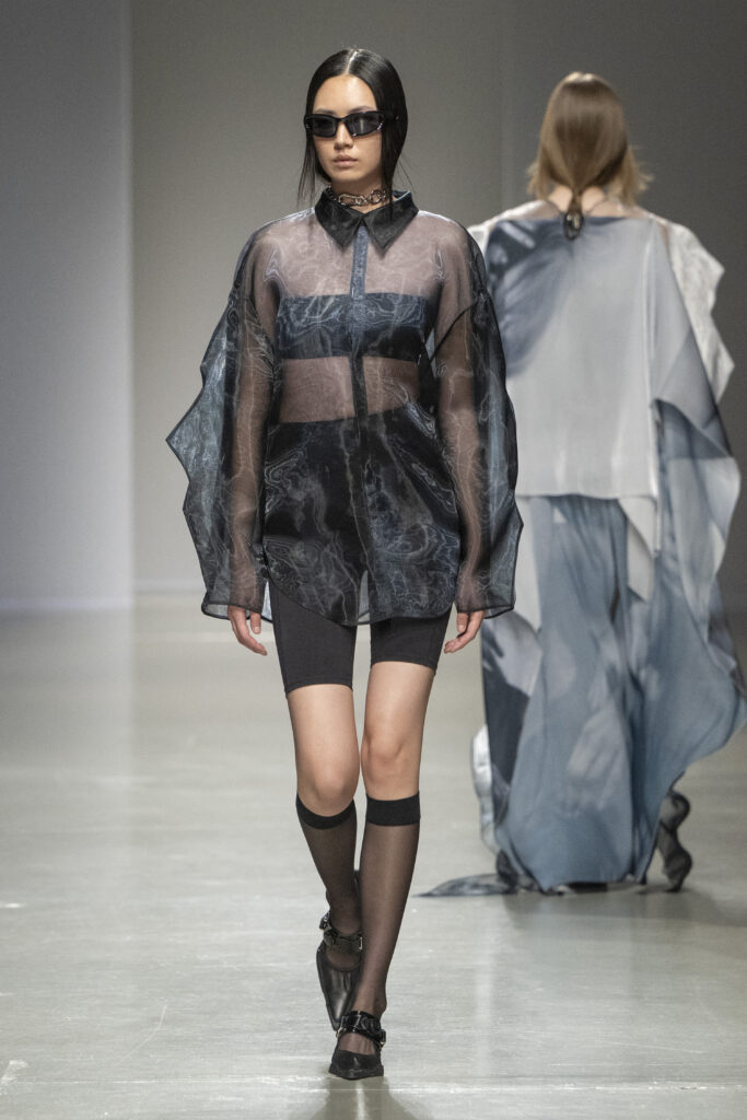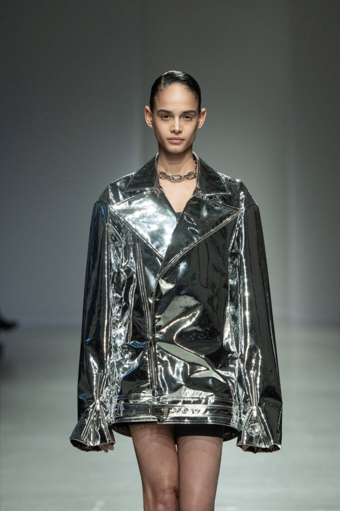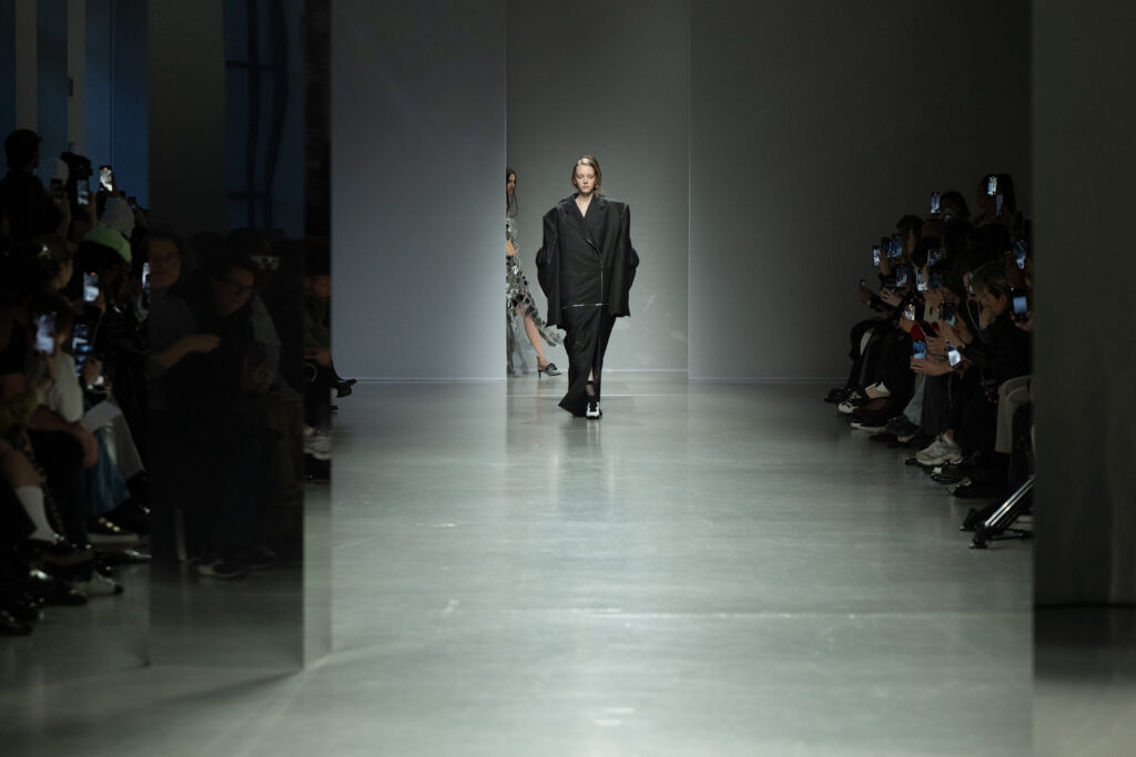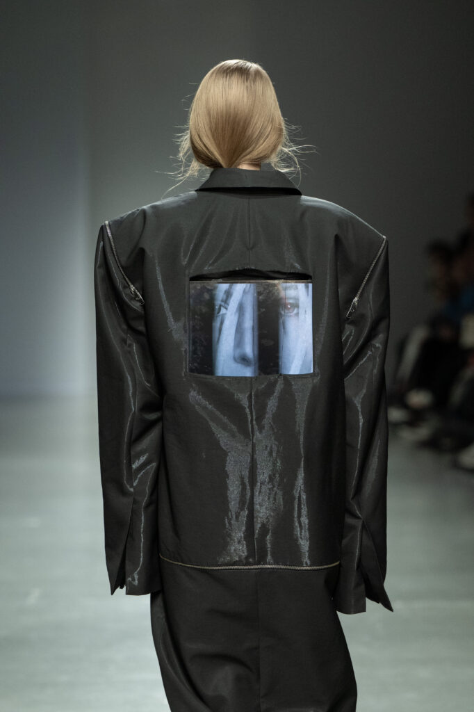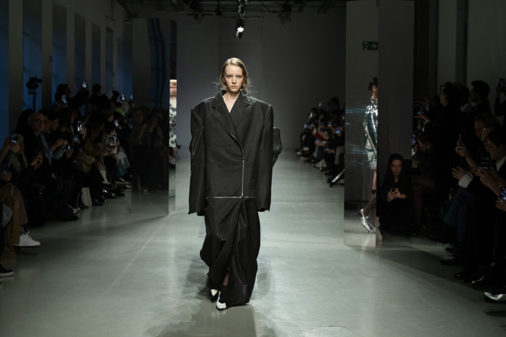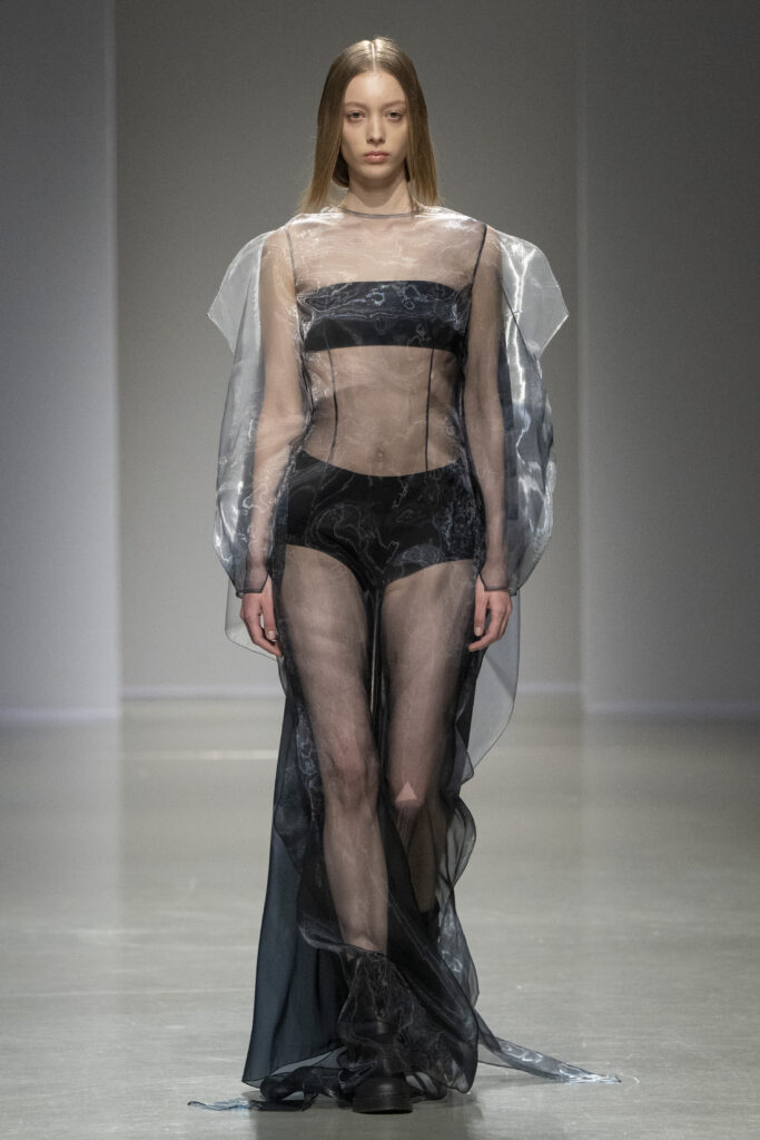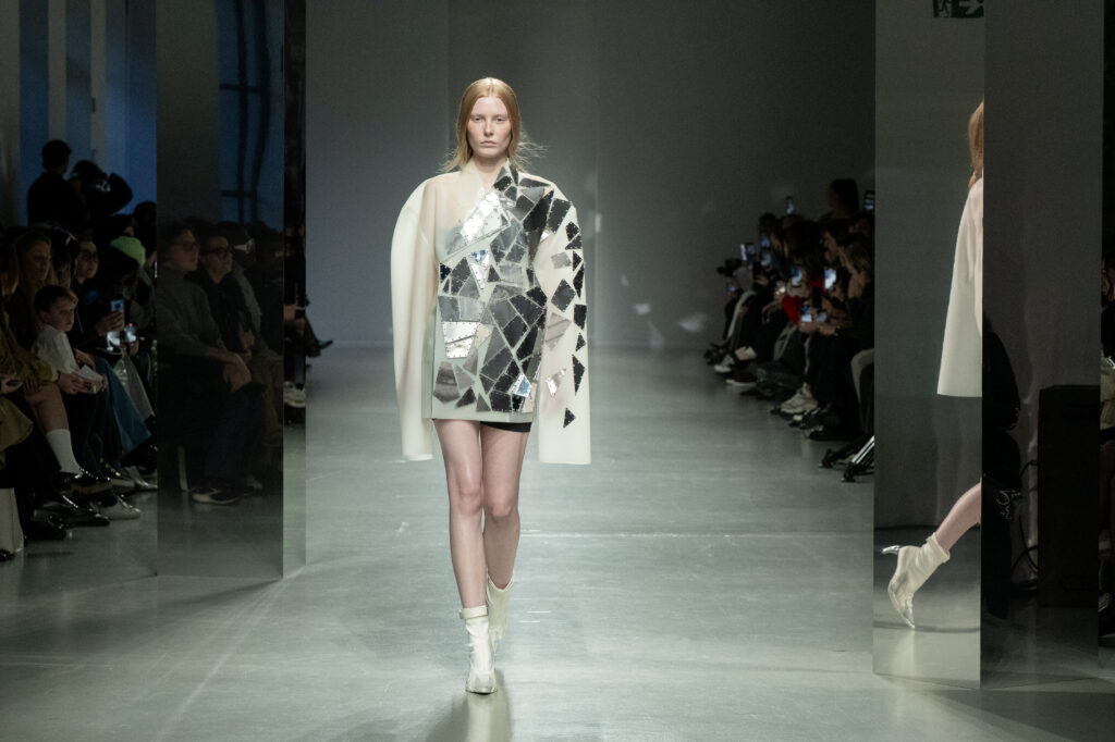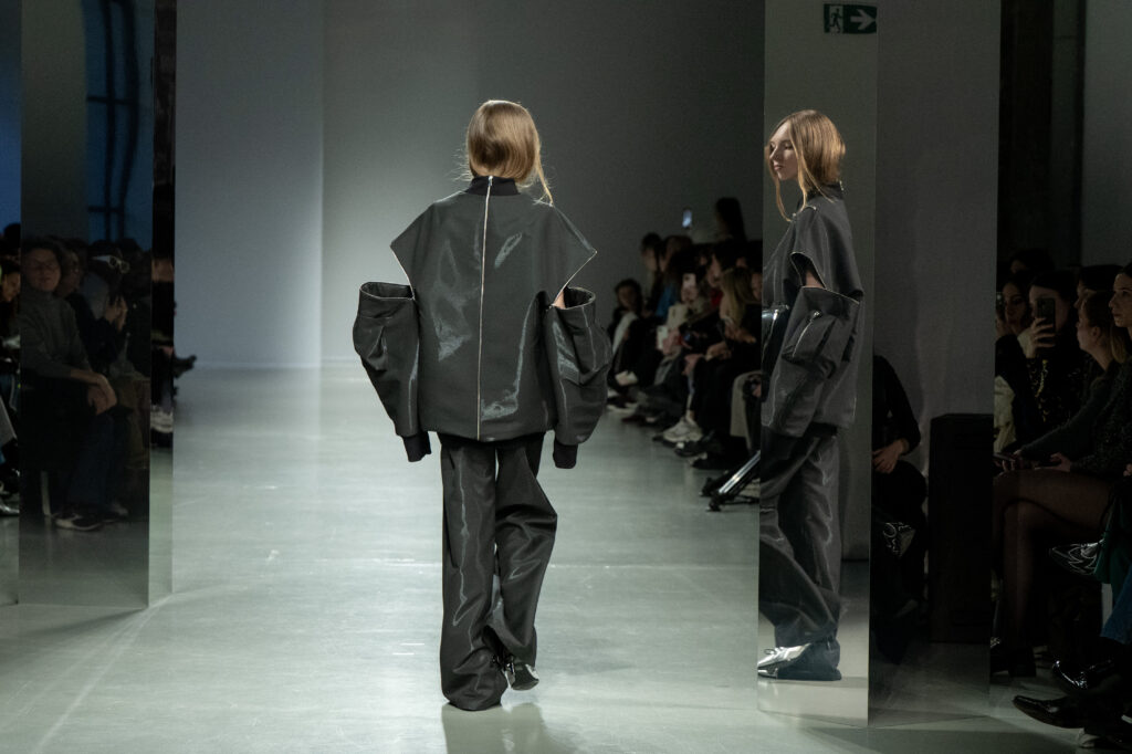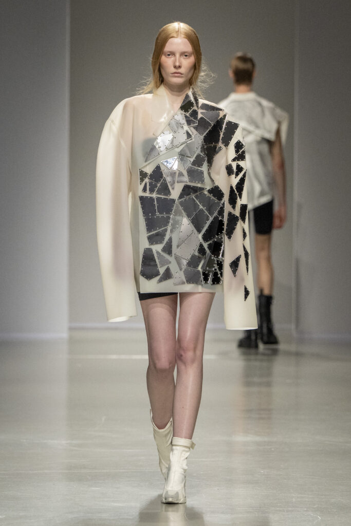 Les coupes, précises et architecturées, jouent sur les contrastes entre rigidité et fluidité, avec des structures rigides en opposition à des drapés aériens. Les effets miroir ne sont pas seulement esthétiques : ils questionnent la mode comme un outil de transformation, une interface entre soi et le monde.