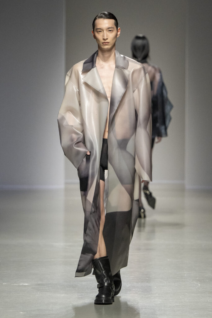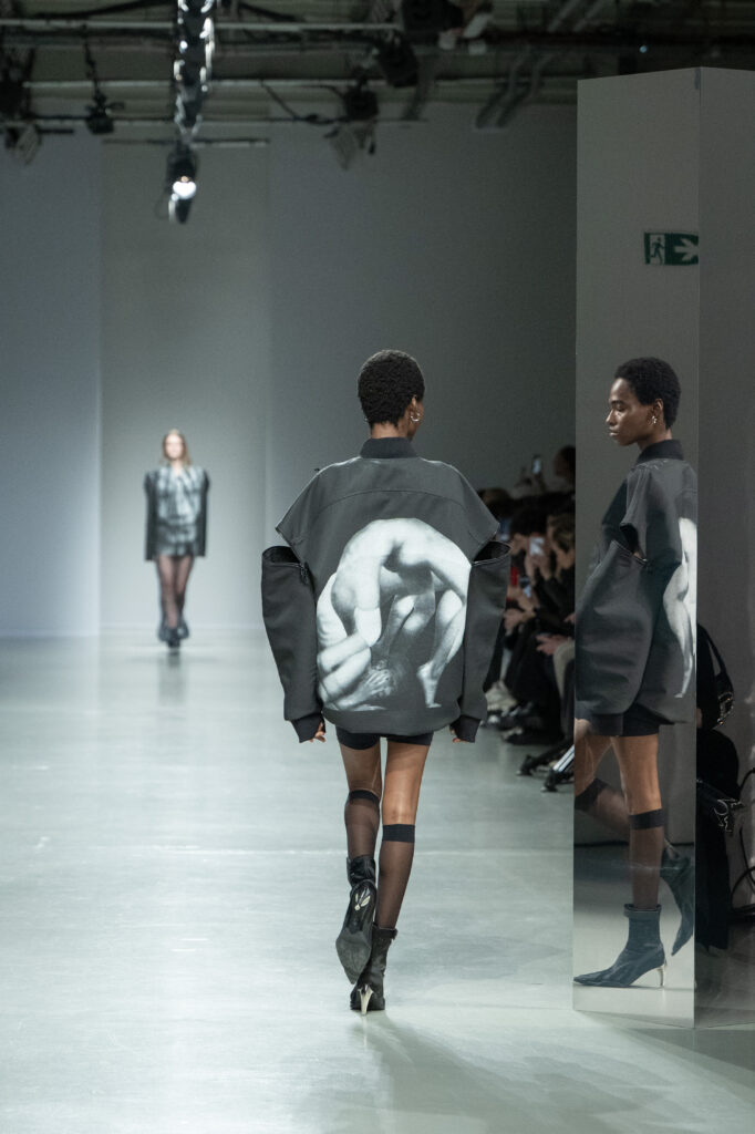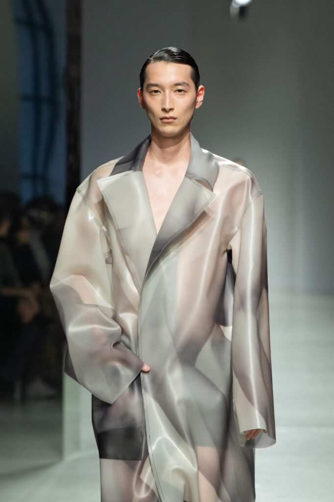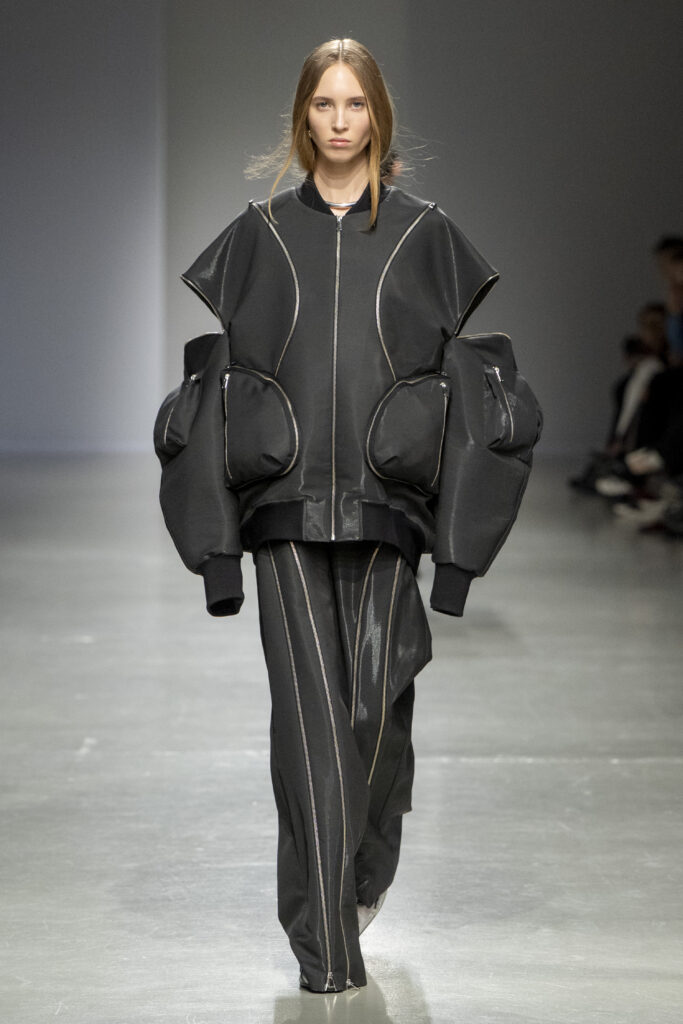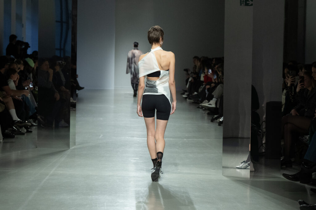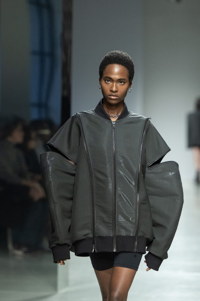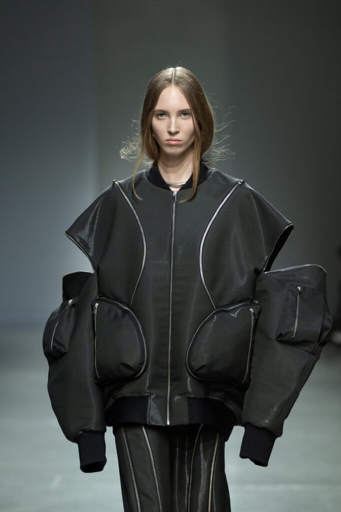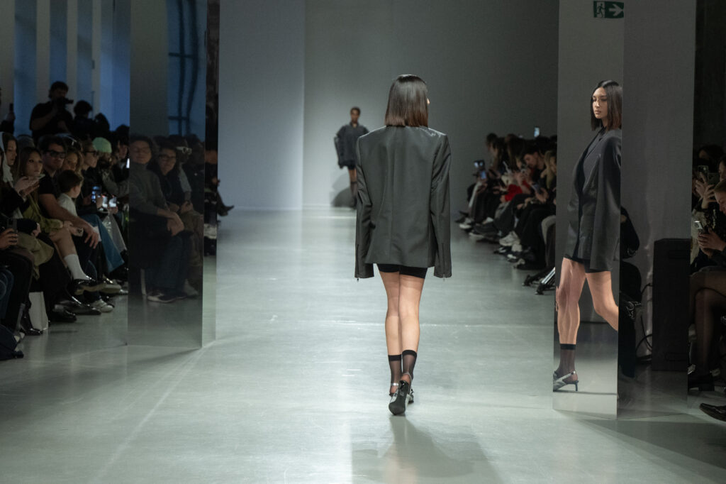Les coupes, précises et architecturées, jouent sur les contrastes entre rigidité et fluidité, avec des structures rigides en opposition à des drapés aériens. Les effets miroir ne sont pas seulement esthétiques : ils questionnent la mode comme un outil de transformation, une interface entre soi et le monde.