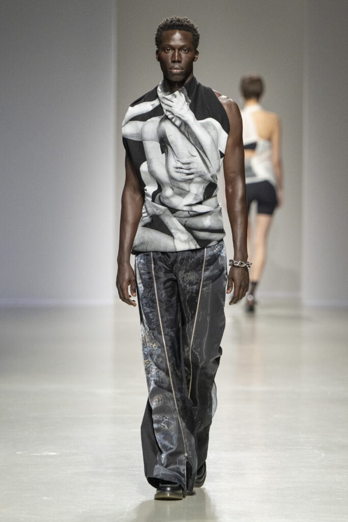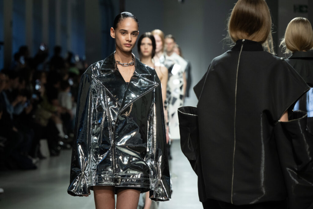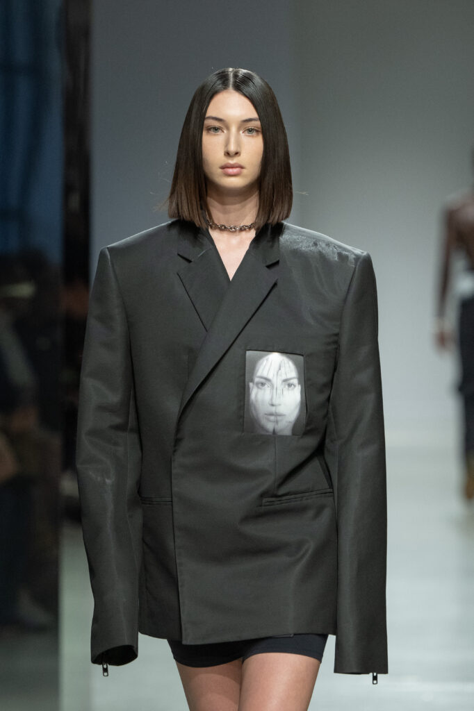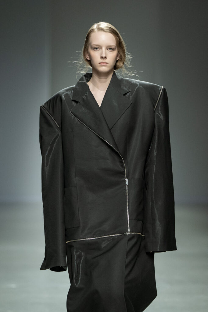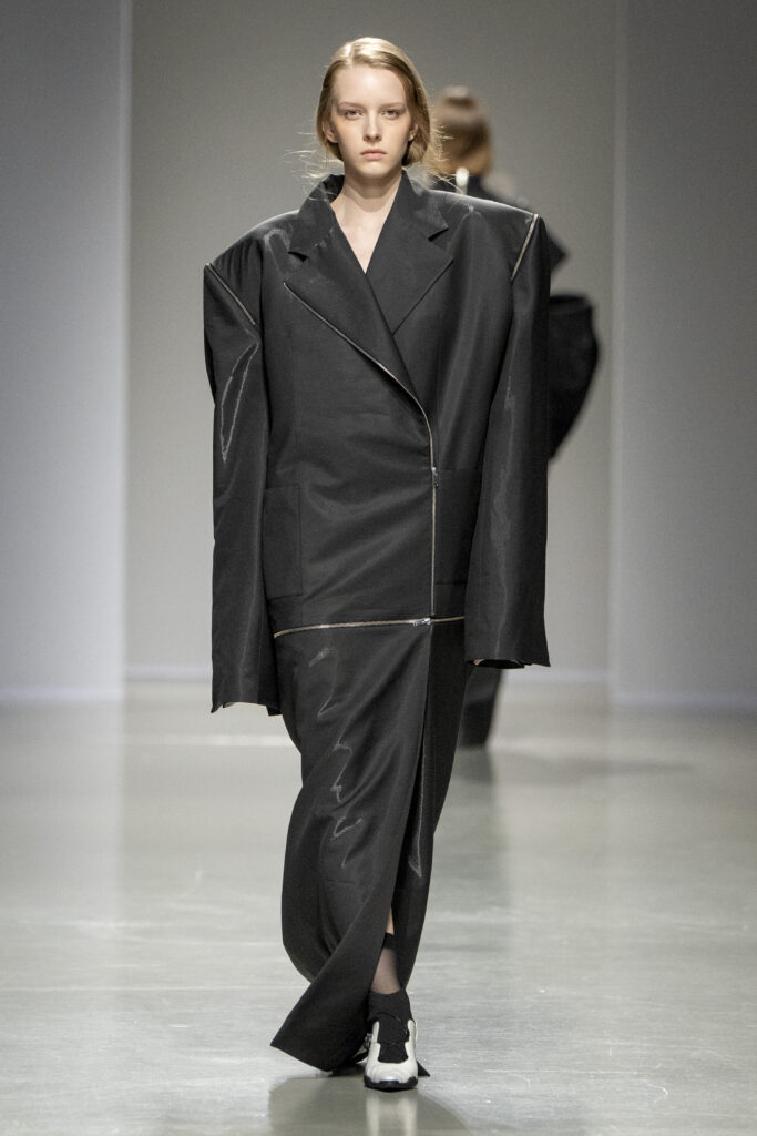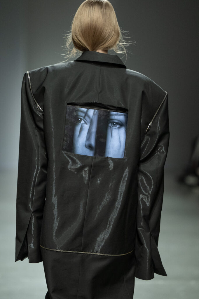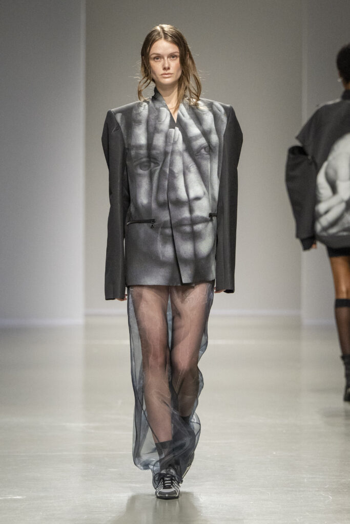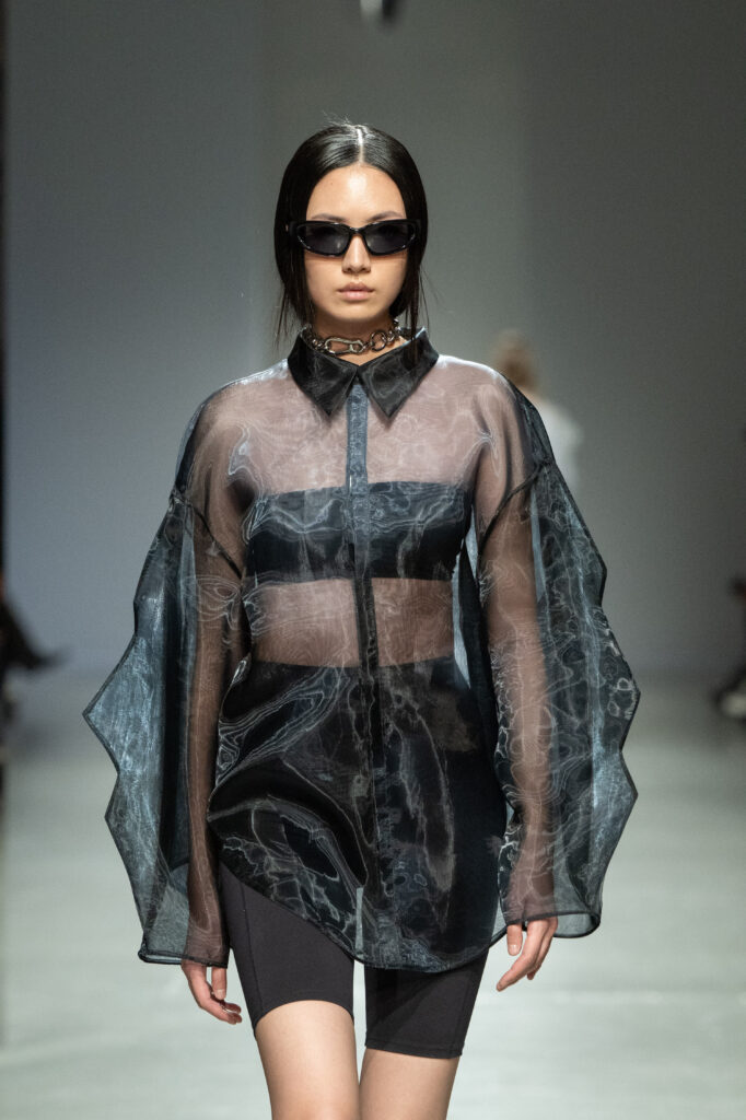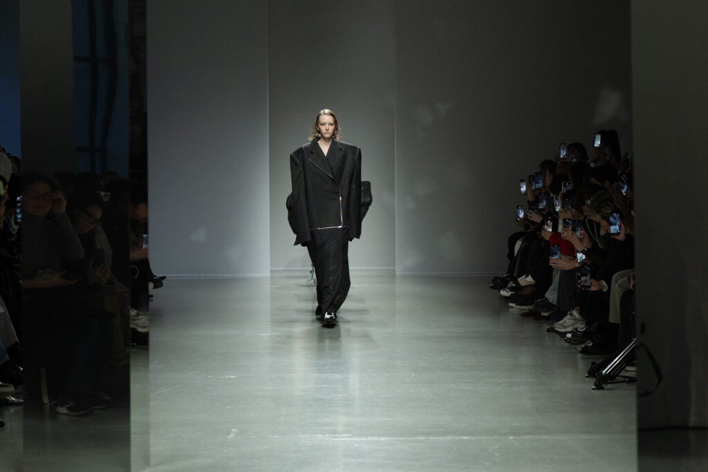 Les coupes, précises et architecturées, jouent sur les contrastes entre rigidité et fluidité, avec des structures rigides en opposition à des drapés aériens. Les effets miroir ne sont pas seulement esthétiques : ils questionnent la mode comme un outil de transformation, une interface entre soi et le monde.