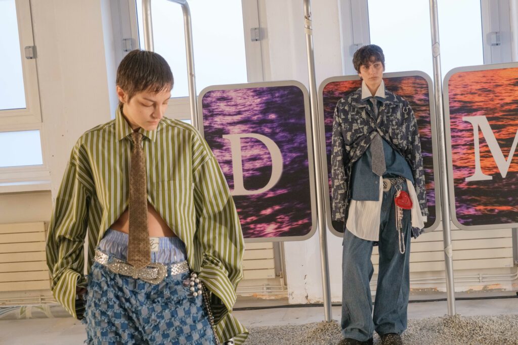 DEMO, sous la direction créative de Derek Chan, a présenté une collection où nostalgie et élégance contemporaine s’entremêlent subtilement. Cette saison, la marque a revisité l’âge d’or de la mode hongkongaise, évoquant avec nostalgie l’ambiance vibrante des années 80 et 90. L’utilisation innovante du denim, avec des lavages spécifiques et des effets volontairement effilochés, alliée à des tissus classiques tels que le tweed, signature emblématique de la marque, a donné naissance à des pièces à la fois sophistiquées et polyvalentes. Les manteaux structurés, trench-coats et vestes en denim démontrent un savoir-faire précis tout en affichant une élégance résolument contemporaine. Le décor immersif, composé de dunes de pierres et d’un jeu subtil de textures, a offert une expérience sensorielle complète, illustrant parfaitement la richesse créative de DEMO.