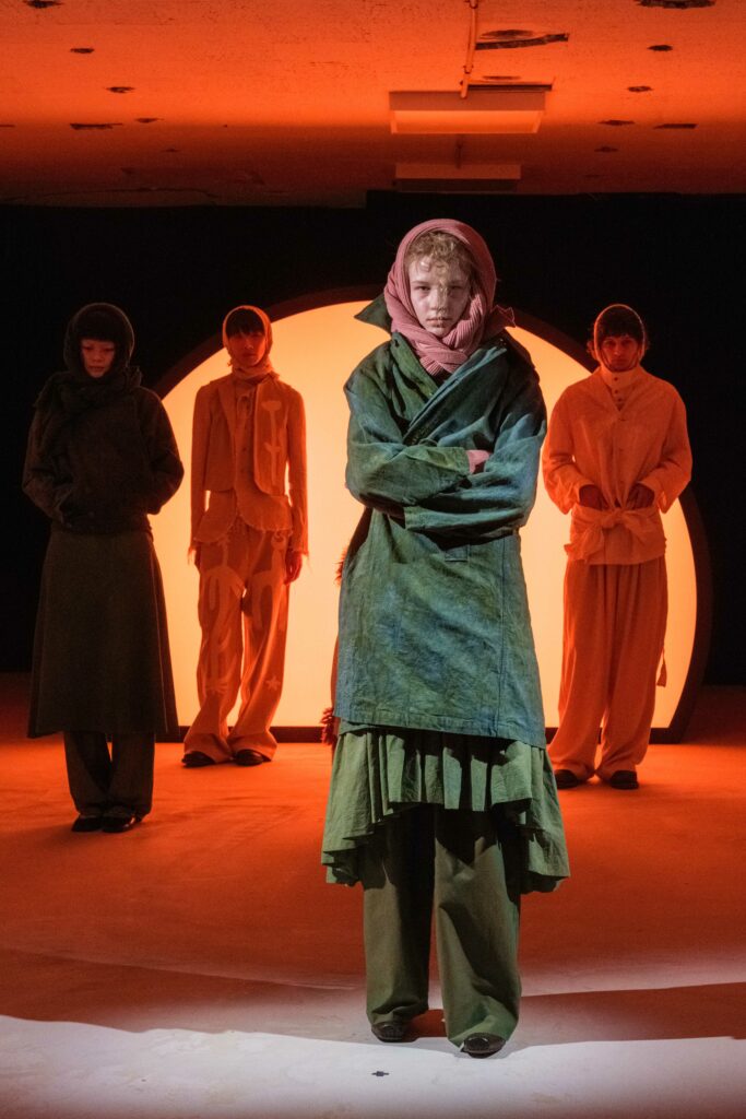 KINYAN LAM a captivé les visiteurs avec sa collection intitulée « We All Die a Little Every Day ». Inspirée d’une vision onirique et surréaliste, cette présentation explore la fragilité de l’existence humaine à travers des motifs évocateurs, des silhouettes audacieuses et une esthétique poétique. Le décor mettait en scène une boîte lumineuse symbolisant la transformation et la révélation, en écho à la philosophie de la marque sur la vie et l’éphémère. La collection Volume 2025 se distingue par ses techniques textiles innovantes, utilisant des teintures artisanales, des motifs inspirés de paysages cosmiques et de cocotiers, créant une atmosphère contemplative et émotionnelle.