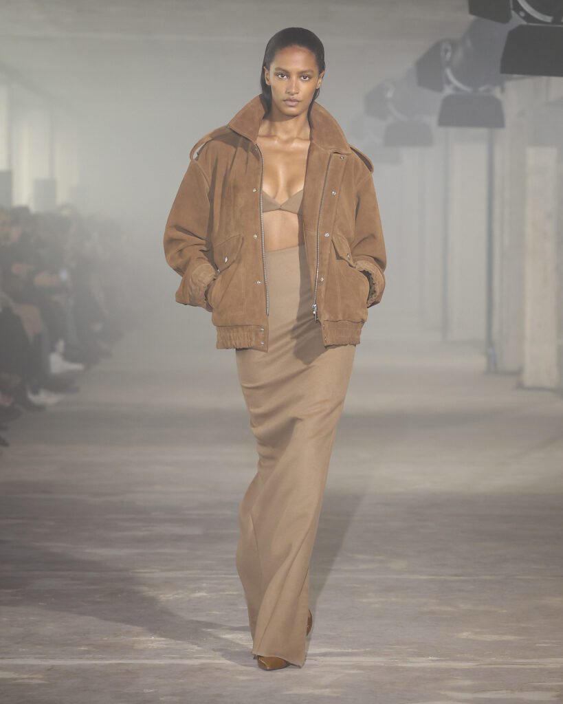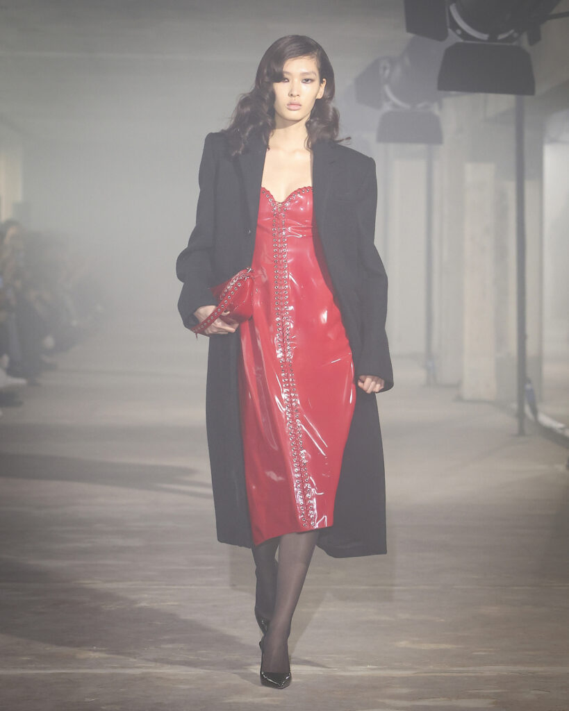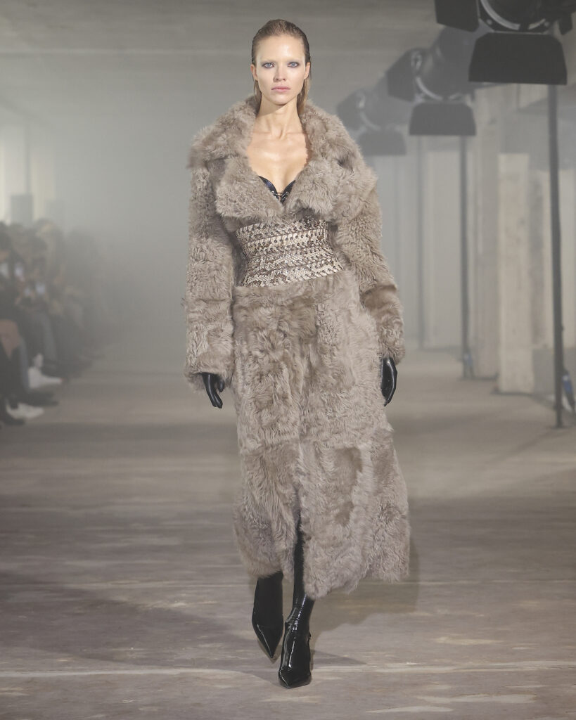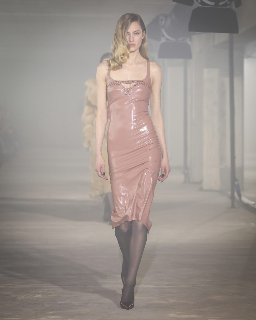 La collection exsude une énergie prédatrice, s’exprimant à travers des manteaux à la coupe structurée doublés de cuir nappa et des pièces luxueuses en cuir, conçues avec le soutien de LVMH Métiers d’Art. Les pièces emblématiques de la maison — le soutien-gorge Cleavage et les robes à fines bretelles — se déclinent désormais en cuir de python souple. Le savoir-faire artisanal transparaît dans les robes ajourées en maille métallique, rappelant la haute couture de Jean Paul Gaultier.