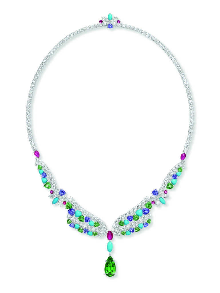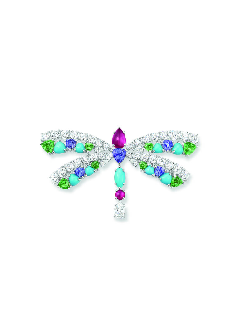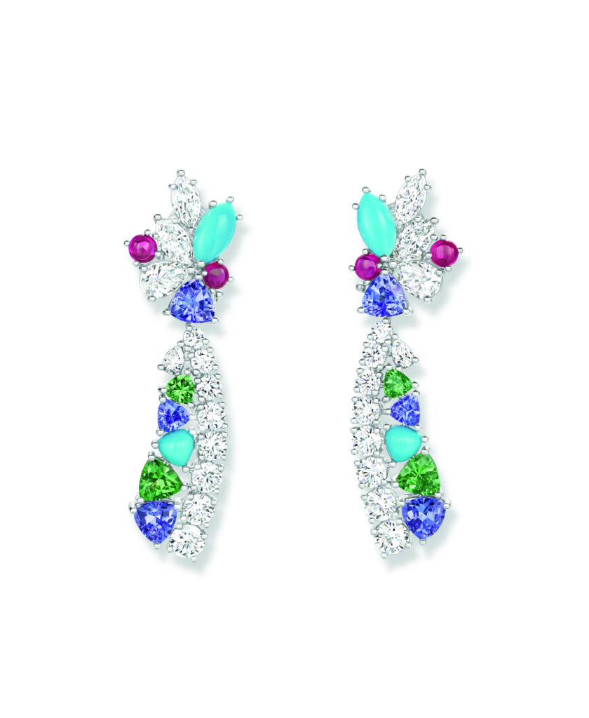 • La collection Dragonfly, avec son collier et ses boucles d’oreilles, associe rubis, grenats et tanzanites pour un éclat unique.