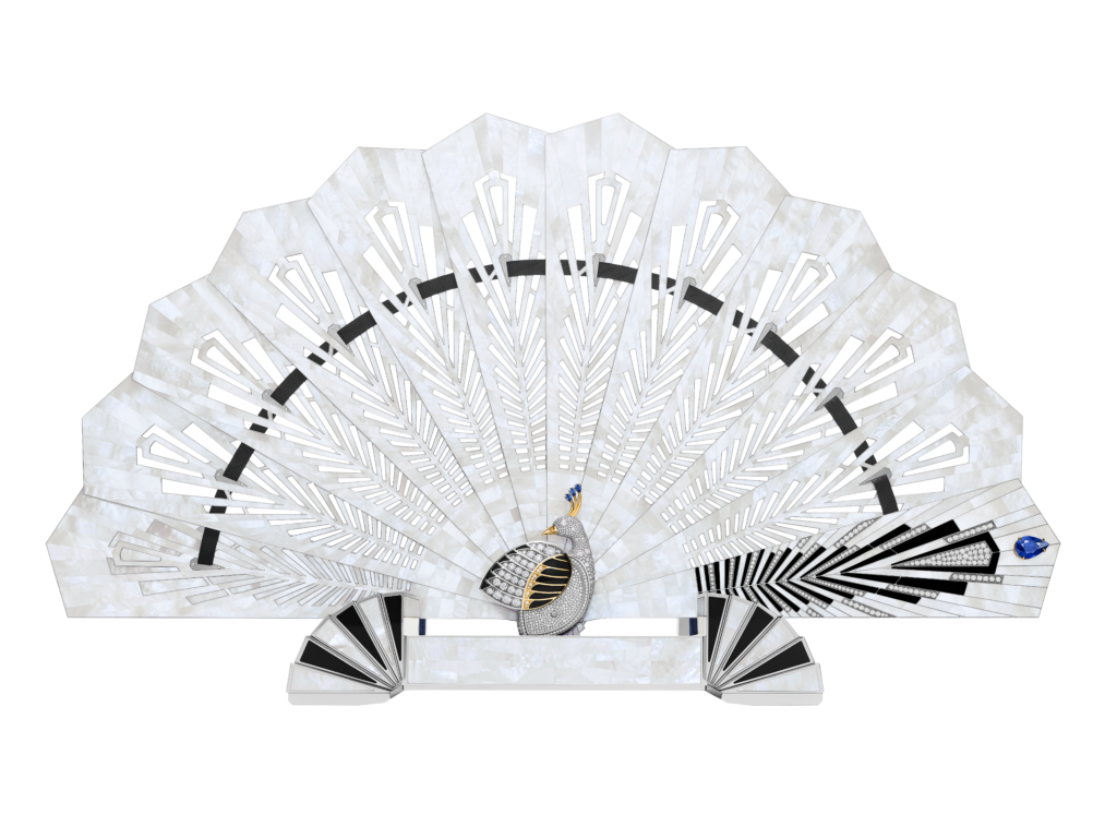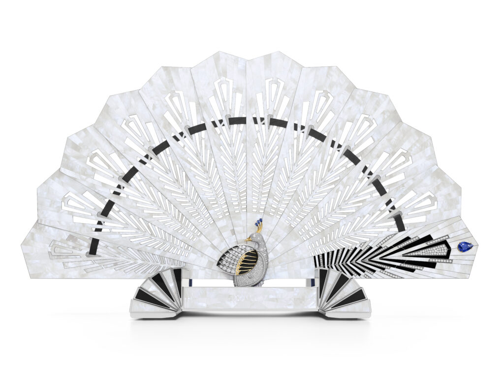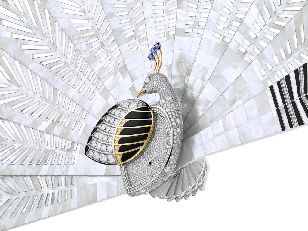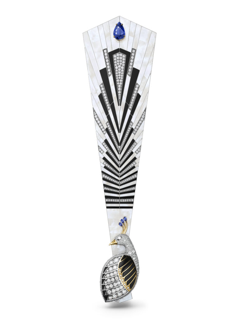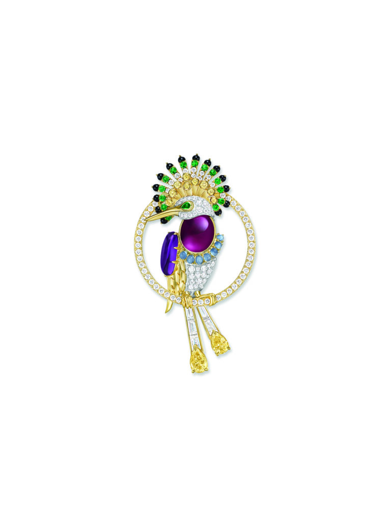 - La broche Peacock, ornée d’émeraudes, de tourmalines Paraíba et de diamants, capture la majesté du paon.