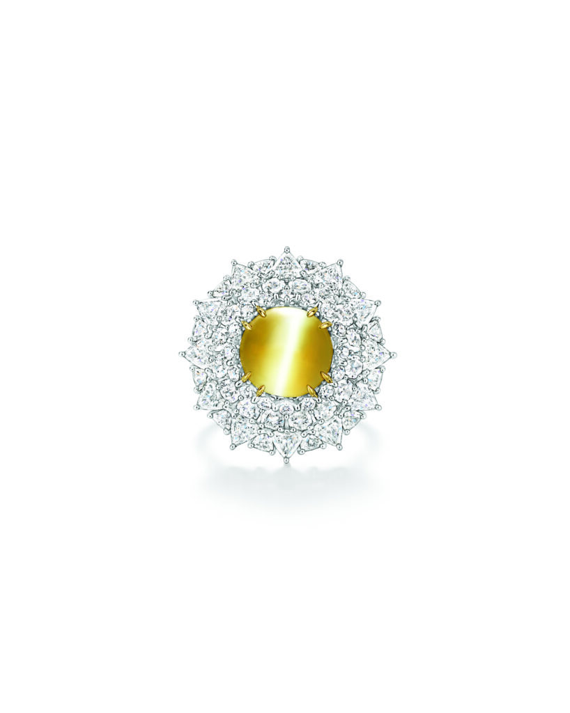 • Une bague en chrysobéryl œil-de-chat de 10,42 carats, illustrant le phénomène fascinant de chatoyance.