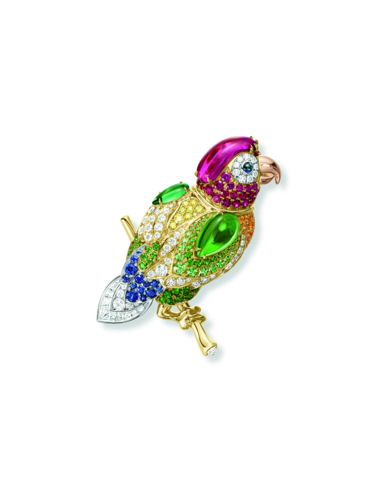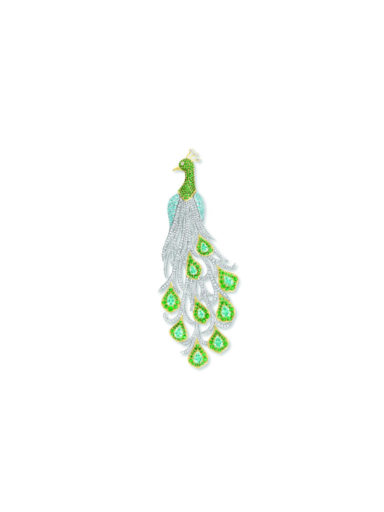 • La broche Peacock, ornée d’émeraudes, de tourmalines Paraíba et de diamants, capture la majesté du paon.
