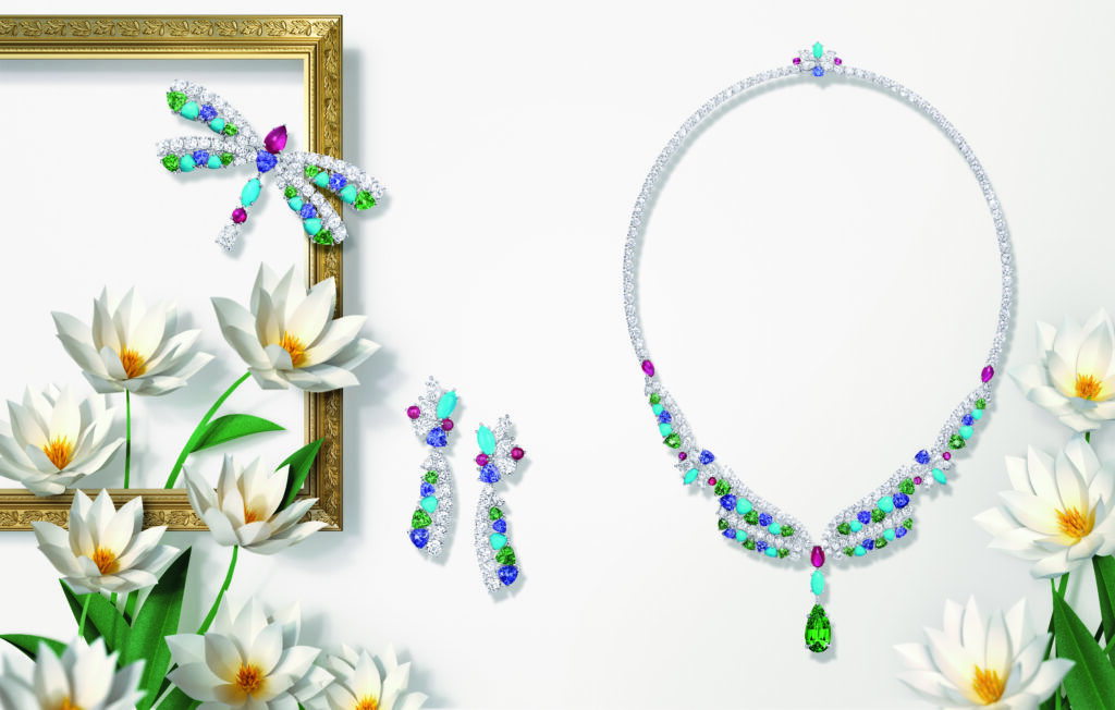 - La collection Dragonfly, avec son collier et ses boucles d’oreilles, associe rubis, grenats et tanzanites pour un éclat unique.