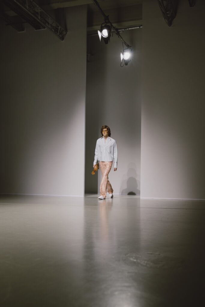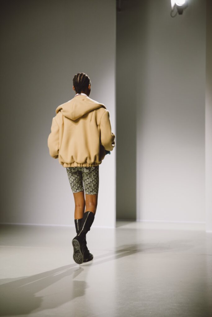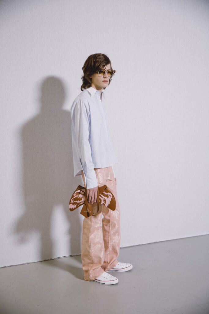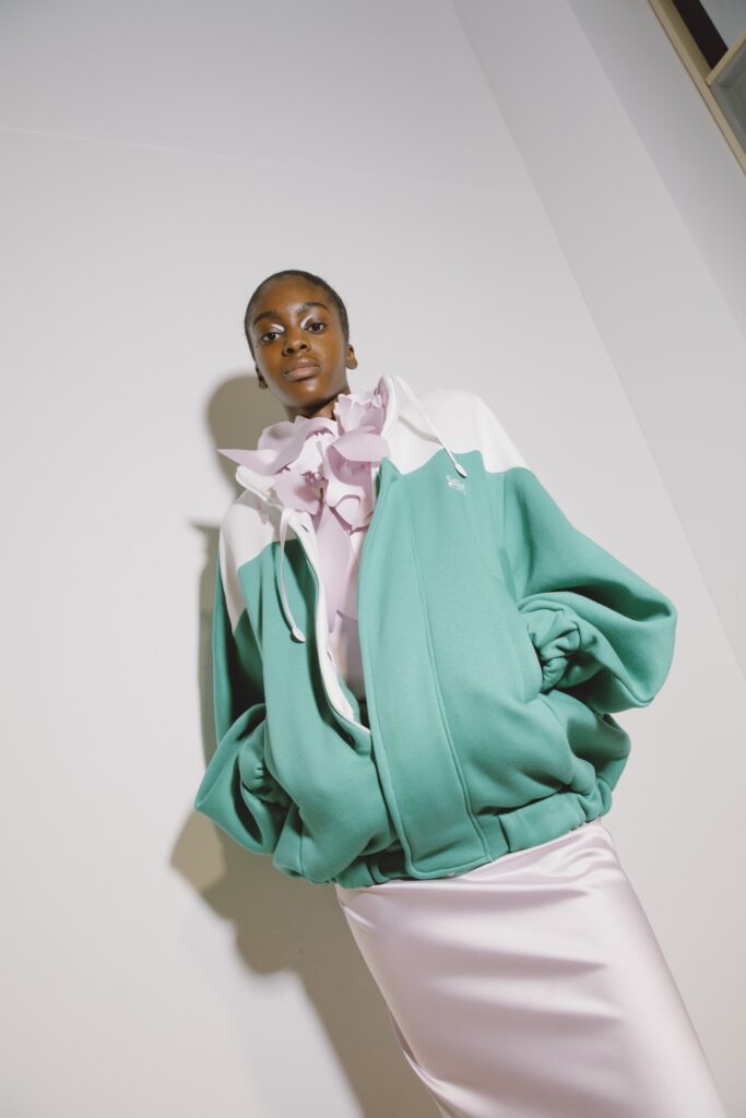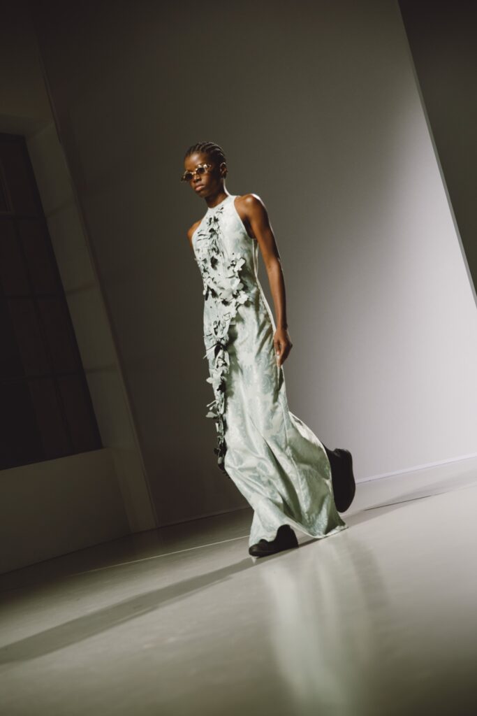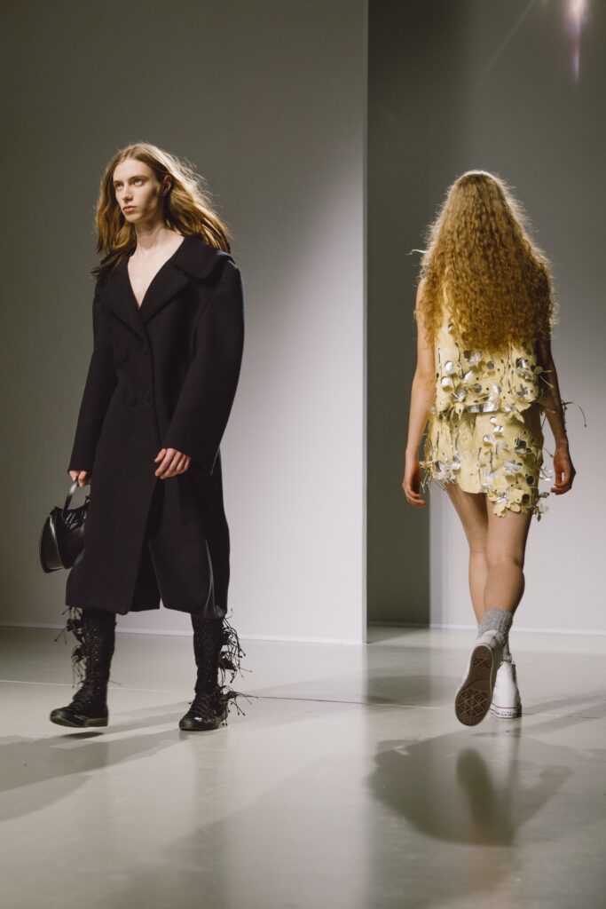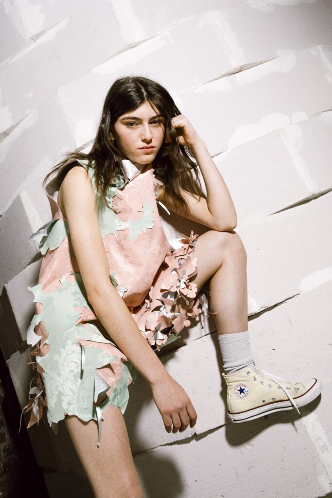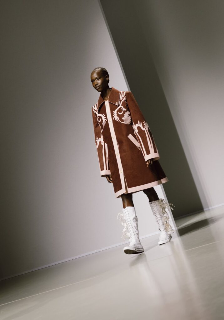 La collection « Futurs Memories » d’Alphonse Maitrepierre explore brillamment les frontières temporelles, fusionnant nostalgie et modernité. Elle juxtapose habilement des pièces structurées à des silhouettes plus décontractées, accentuant l’audace créative grâce à l’intégration stratégique des emblématiques chaussures Converse. Techniques modernes et matériaux recyclés comme les découpes laser précises, broderies raffinées et tissus upcyclés soulignent l’engagement de Maitrepierre pour une mode durable et éthique.