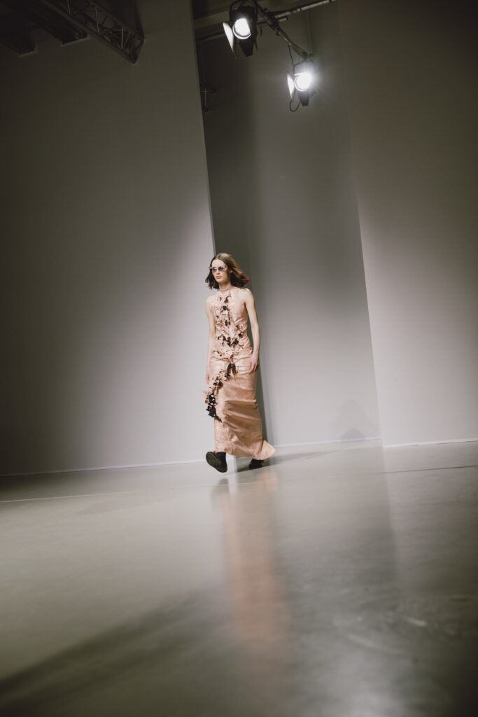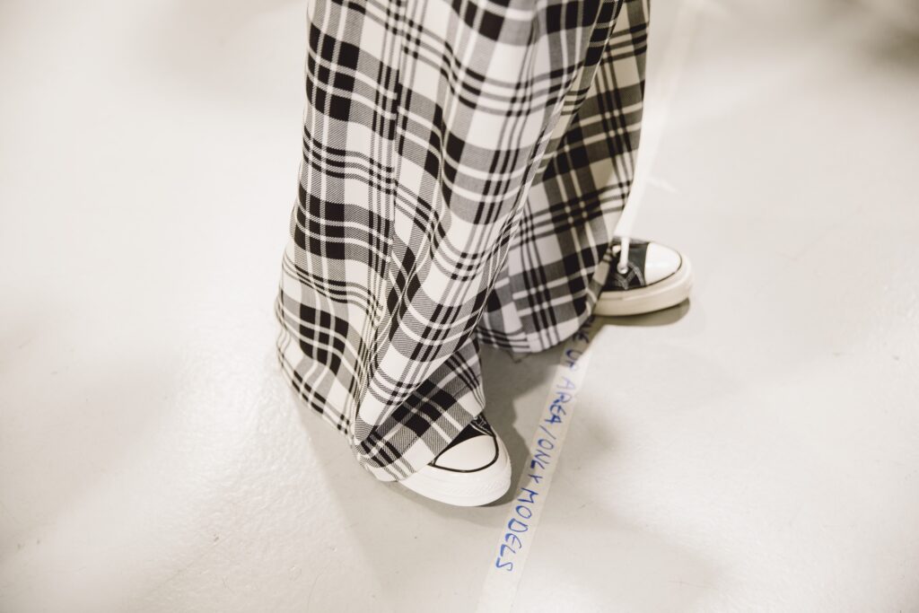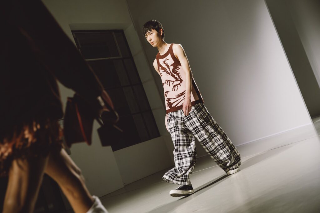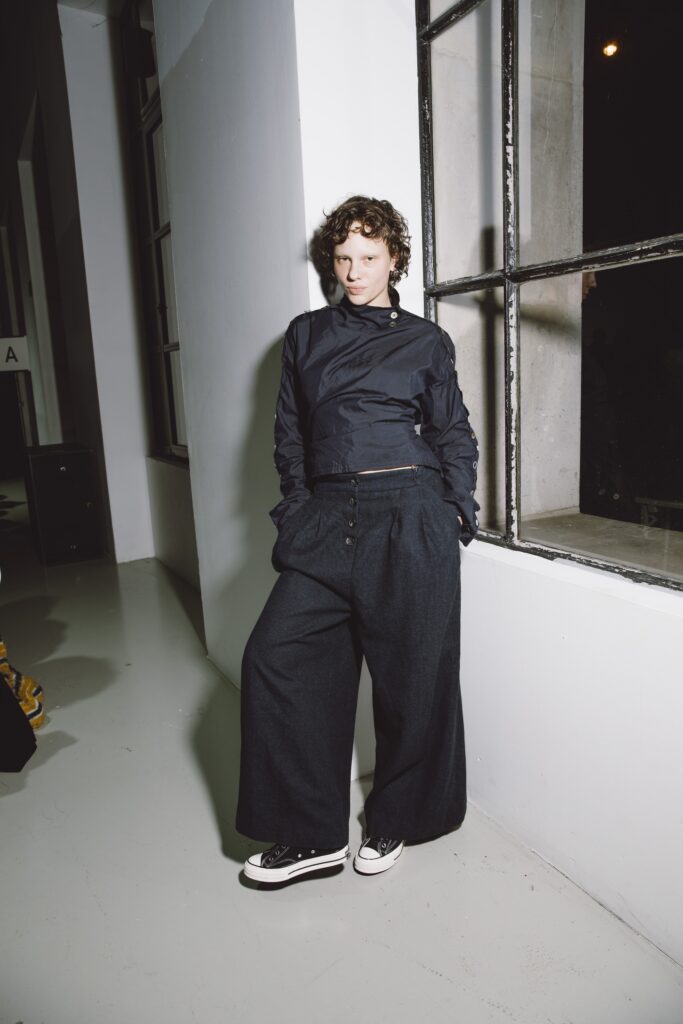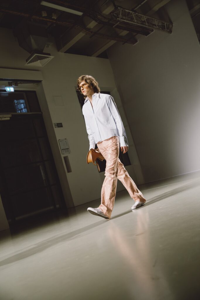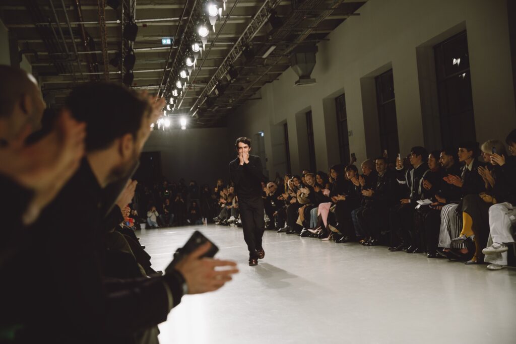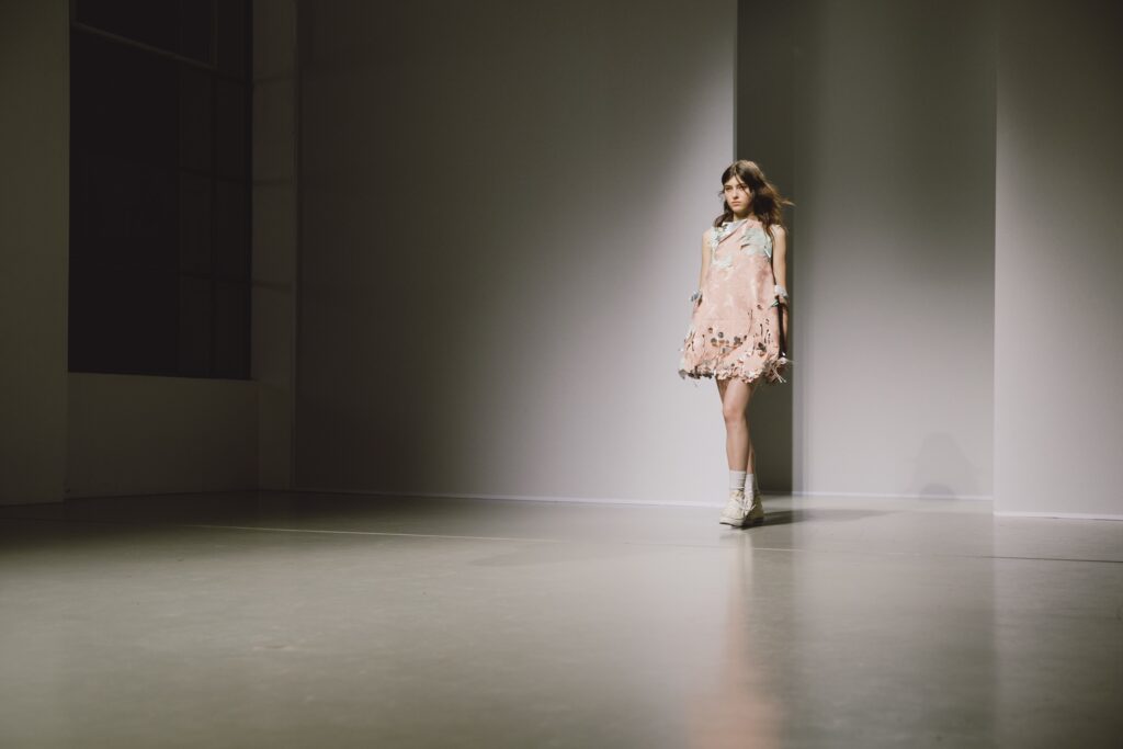 La collection « Futurs Memories » d’Alphonse Maitrepierre explore brillamment les frontières temporelles, fusionnant nostalgie et modernité. Elle juxtapose habilement des pièces structurées à des silhouettes plus décontractées, accentuant l’audace créative grâce à l’intégration stratégique des emblématiques chaussures Converse. Techniques modernes et matériaux recyclés comme les découpes laser précises, broderies raffinées et tissus upcyclés soulignent l’engagement de Maitrepierre pour une mode durable et éthique.