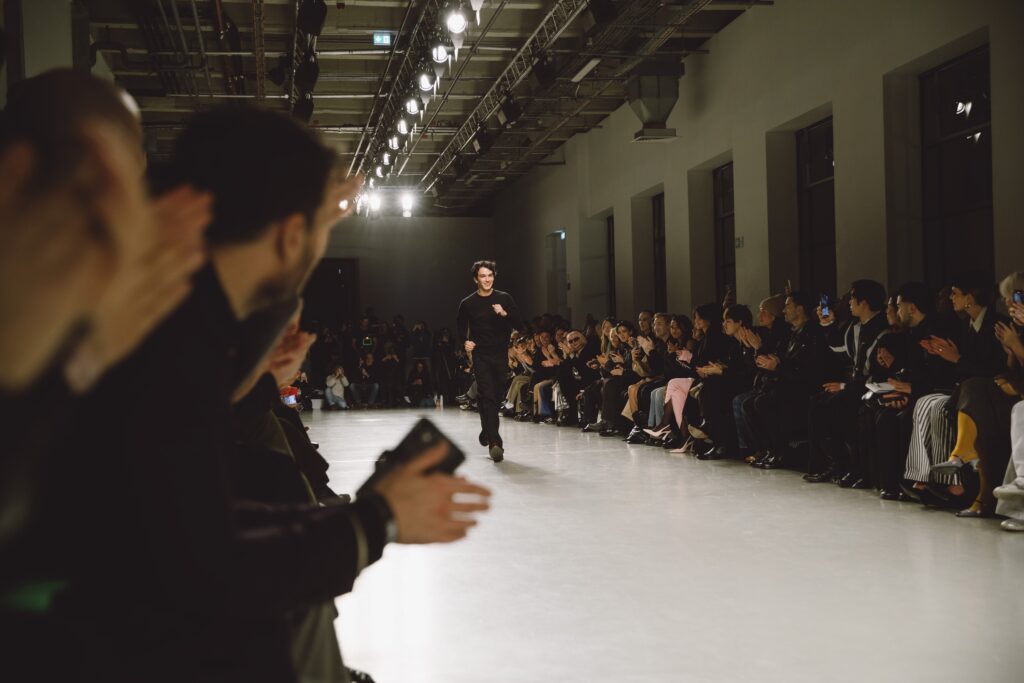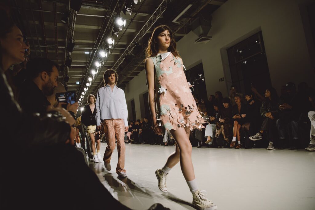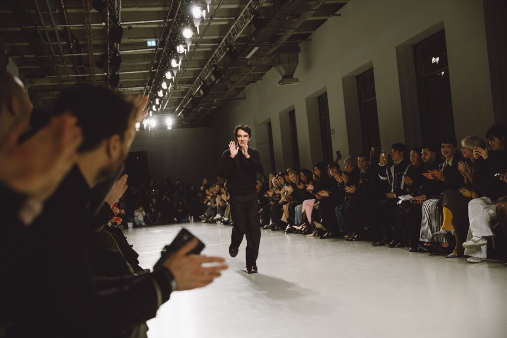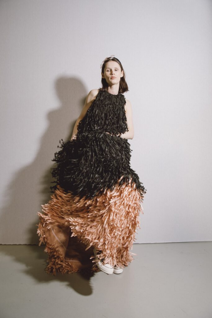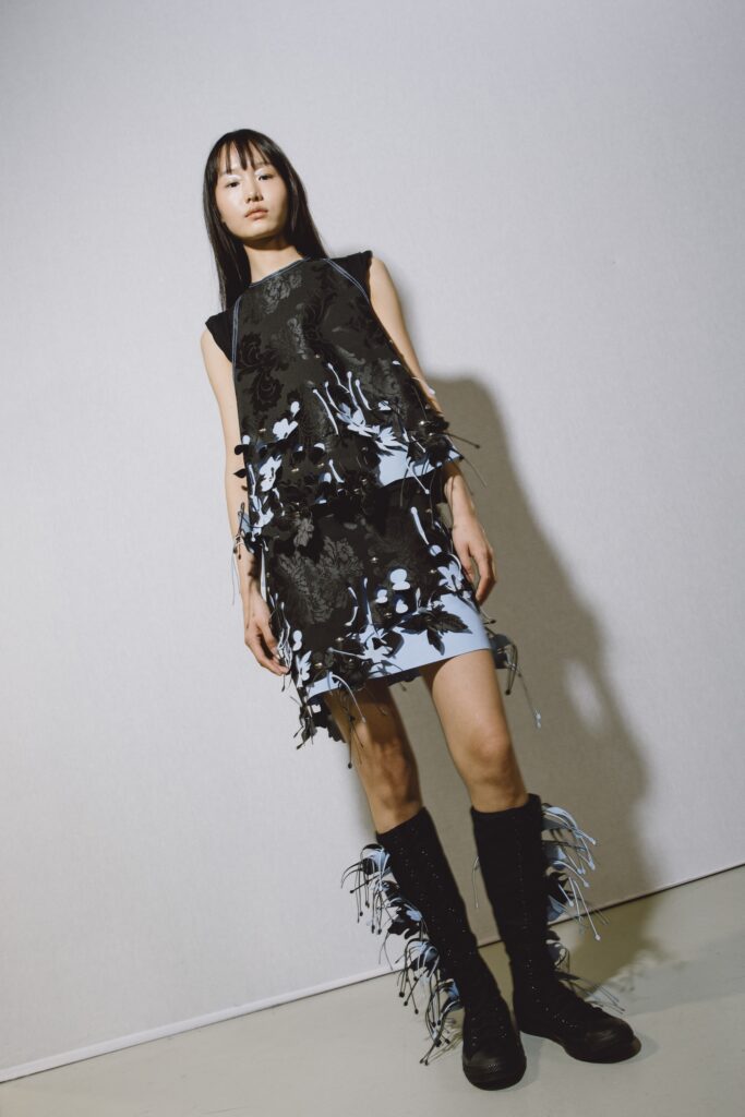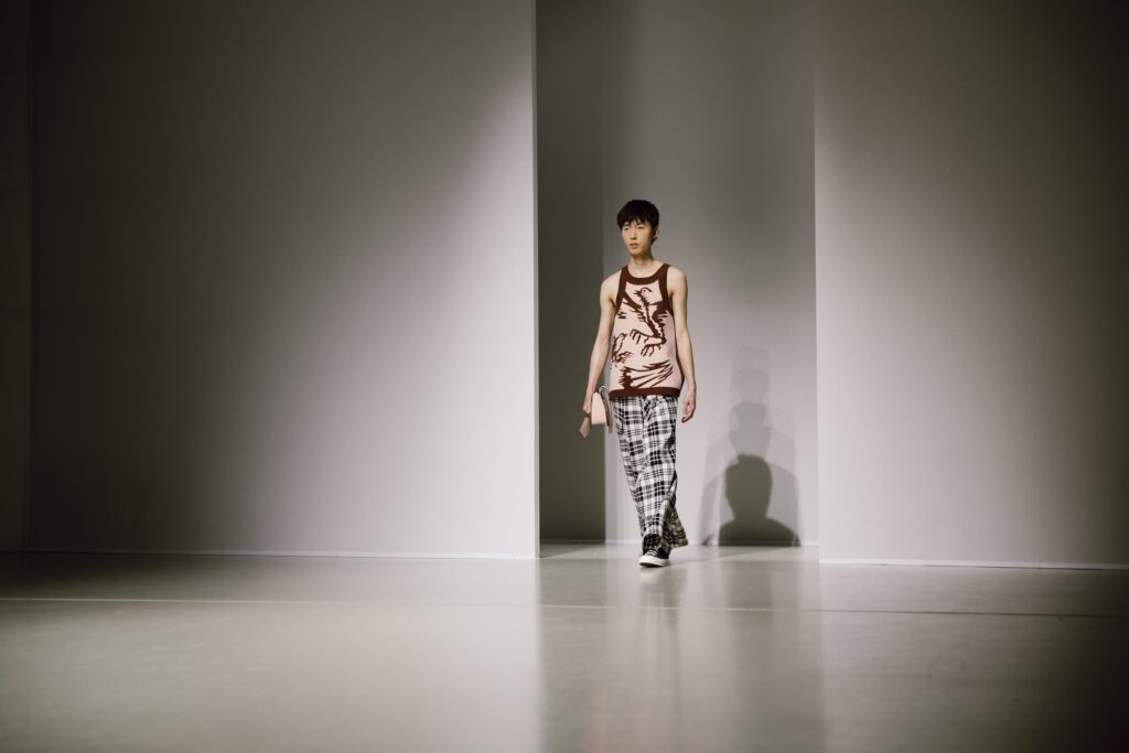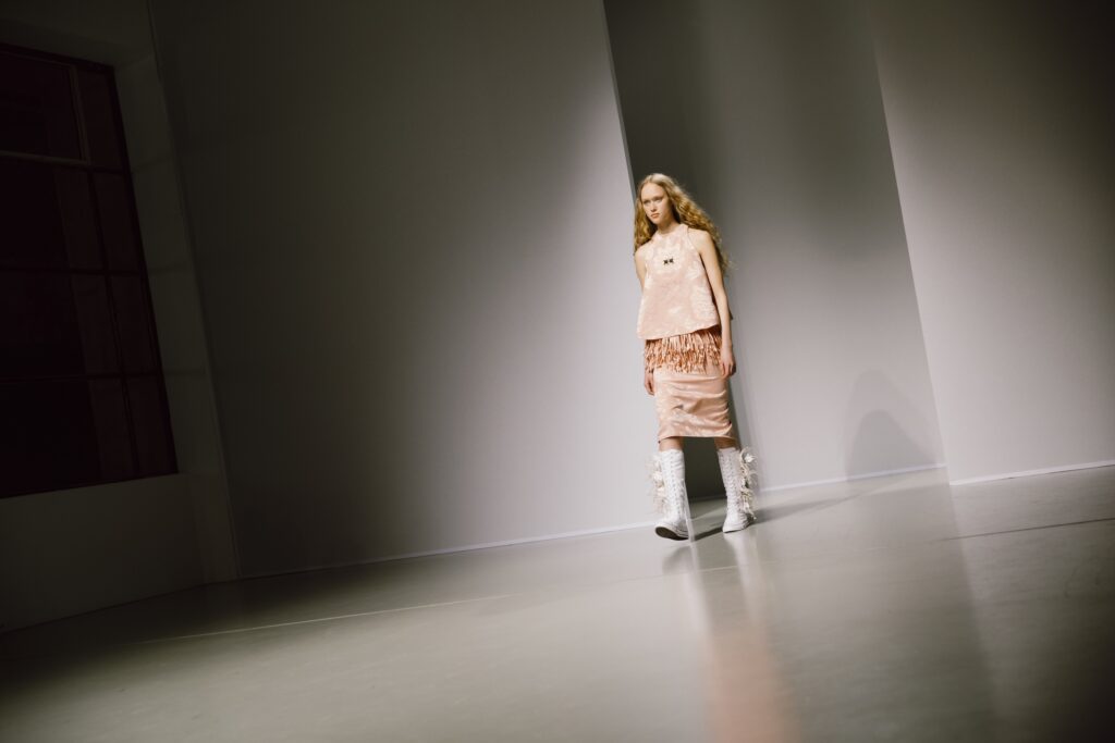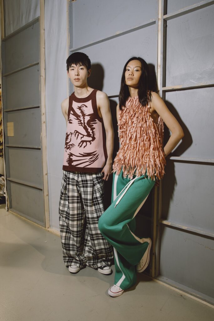 La collection « Futurs Memories » d’Alphonse Maitrepierre explore brillamment les frontières temporelles, fusionnant nostalgie et modernité. Elle juxtapose habilement des pièces structurées à des silhouettes plus décontractées, accentuant l’audace créative grâce à l’intégration stratégique des emblématiques chaussures Converse. Techniques modernes et matériaux recyclés comme les découpes laser précises, broderies raffinées et tissus upcyclés soulignent l’engagement de Maitrepierre pour une mode durable et éthique.