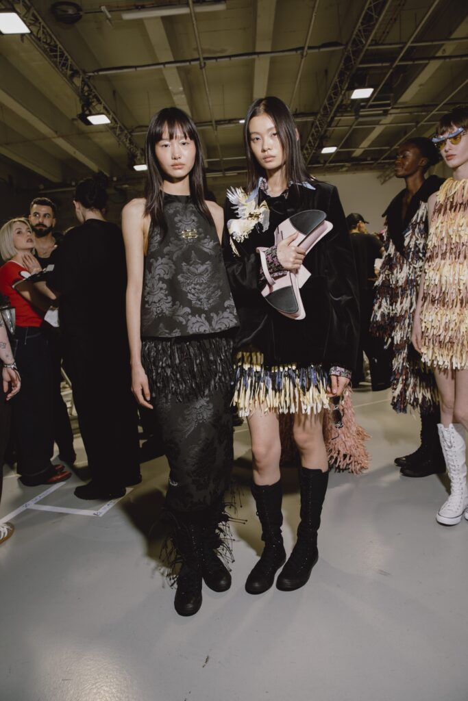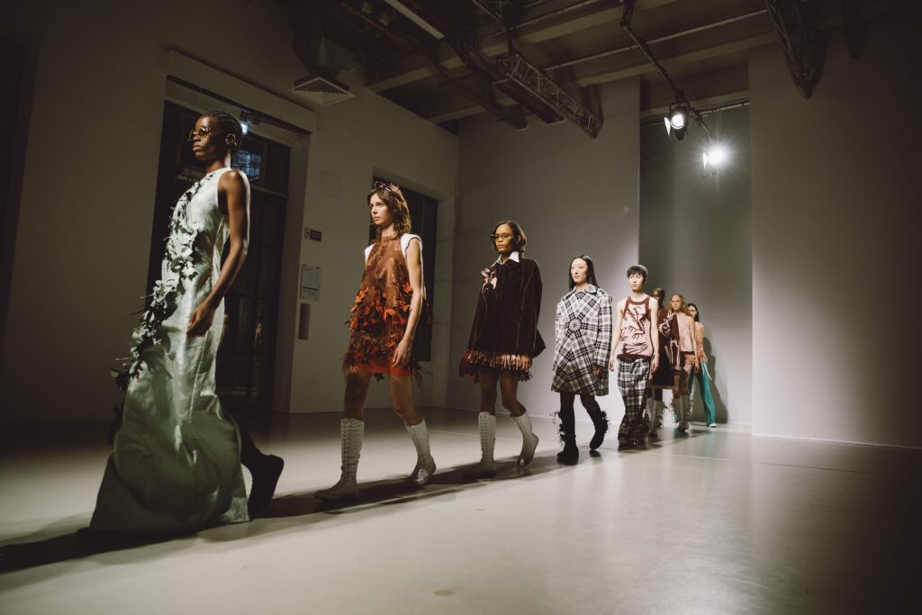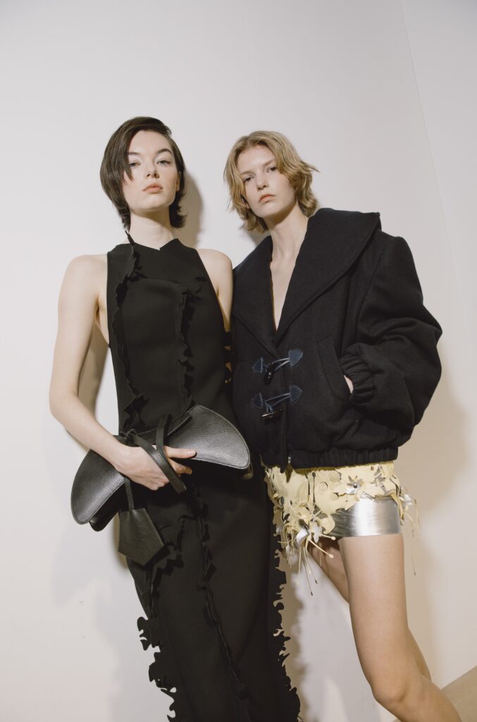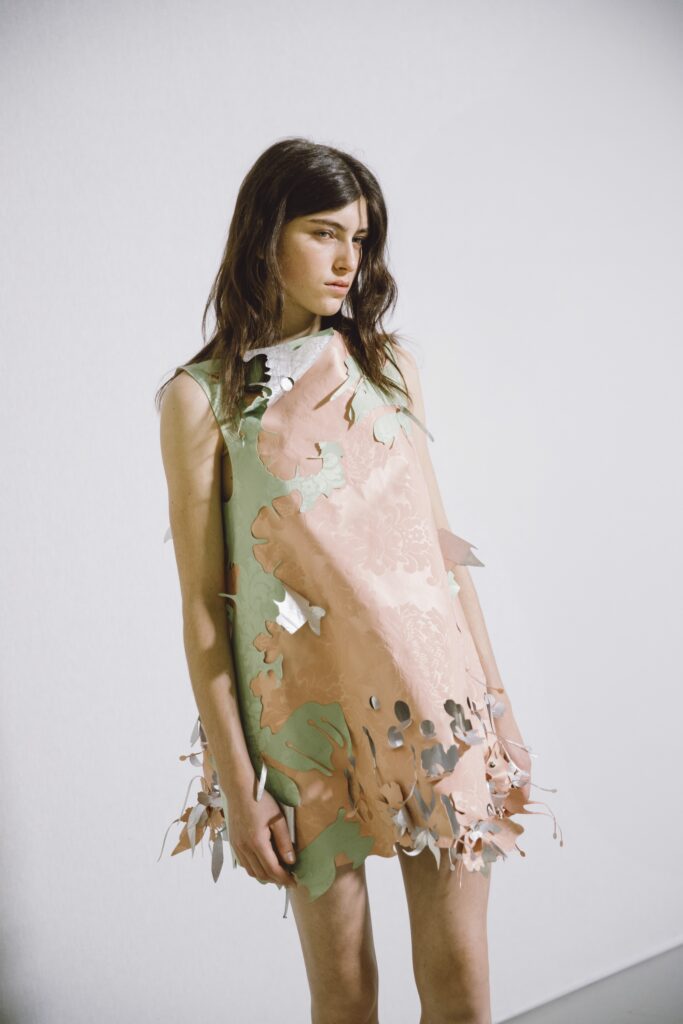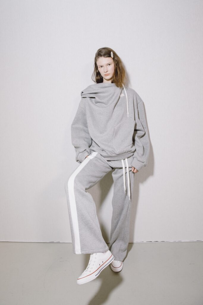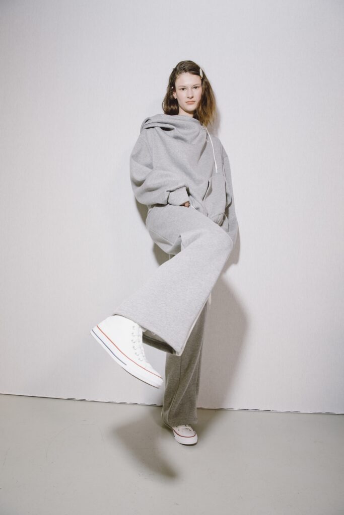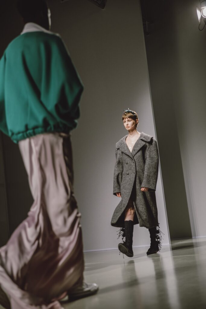 La collection « Futurs Memories » d’Alphonse Maitrepierre explore brillamment les frontières temporelles, fusionnant nostalgie et modernité. Elle juxtapose habilement des pièces structurées à des silhouettes plus décontractées, accentuant l’audace créative grâce à l’intégration stratégique des emblématiques chaussures Converse. Techniques modernes et matériaux recyclés comme les découpes laser précises, broderies raffinées et tissus upcyclés soulignent l’engagement de Maitrepierre pour une mode durable et éthique.
