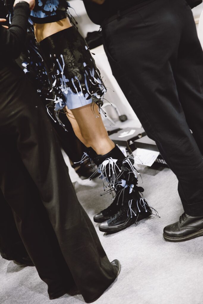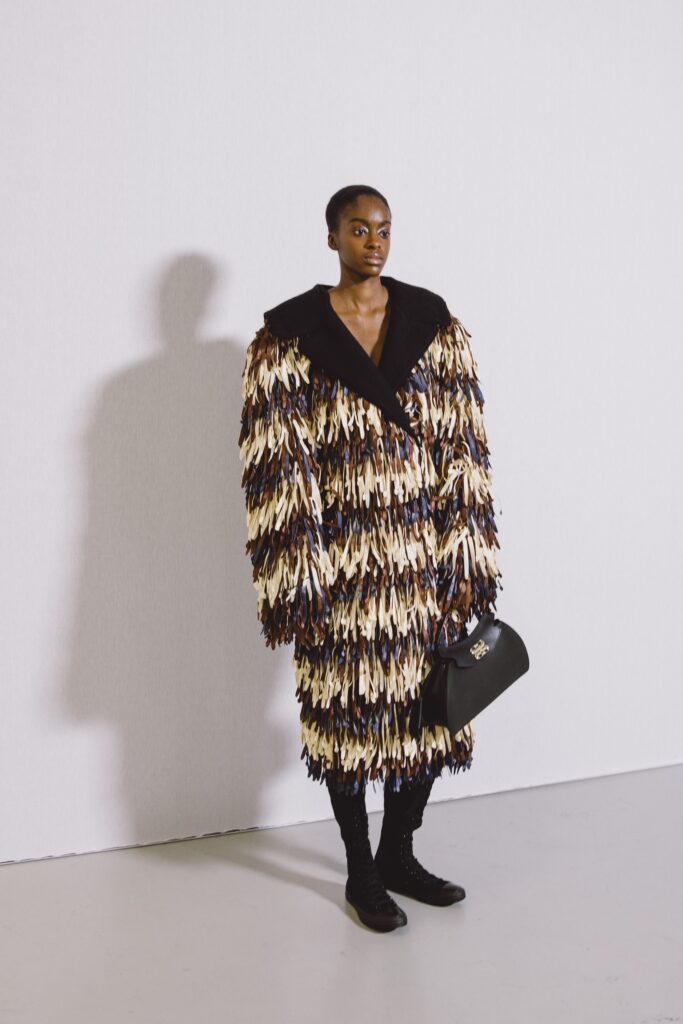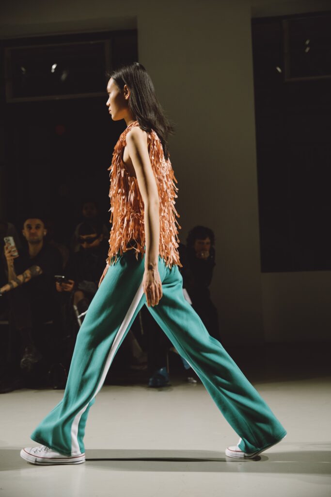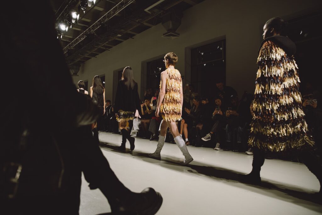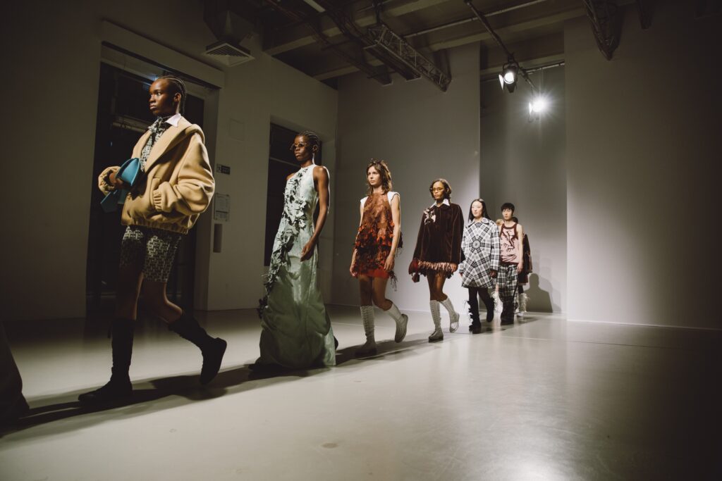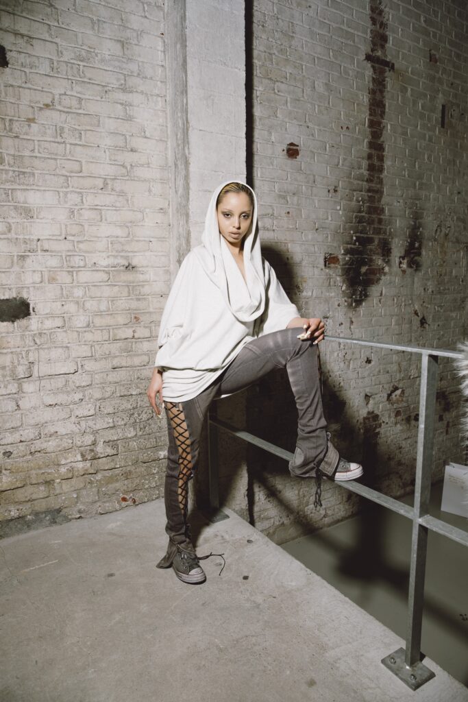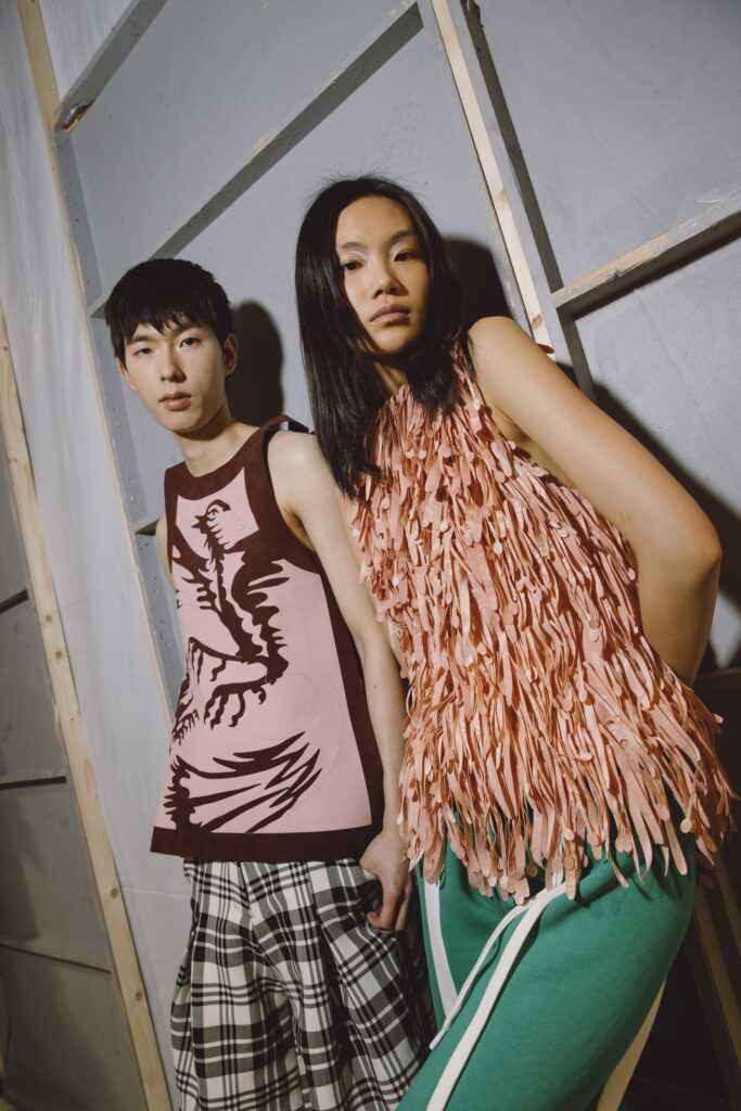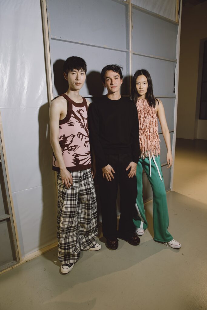La collection « Futurs Memories » d’Alphonse Maitrepierre explore brillamment les frontières temporelles, fusionnant nostalgie et modernité. Elle juxtapose habilement des pièces structurées à des silhouettes plus décontractées, accentuant l’audace créative grâce à l’intégration stratégique des emblématiques chaussures Converse. Techniques modernes et matériaux recyclés comme les découpes laser précises, broderies raffinées et tissus upcyclés soulignent l’engagement de Maitrepierre pour une mode durable et éthique.