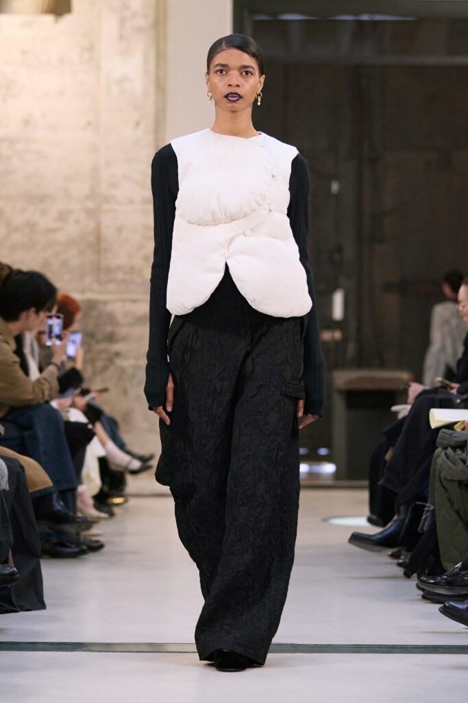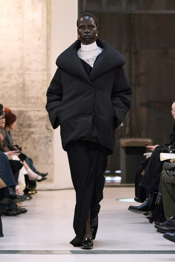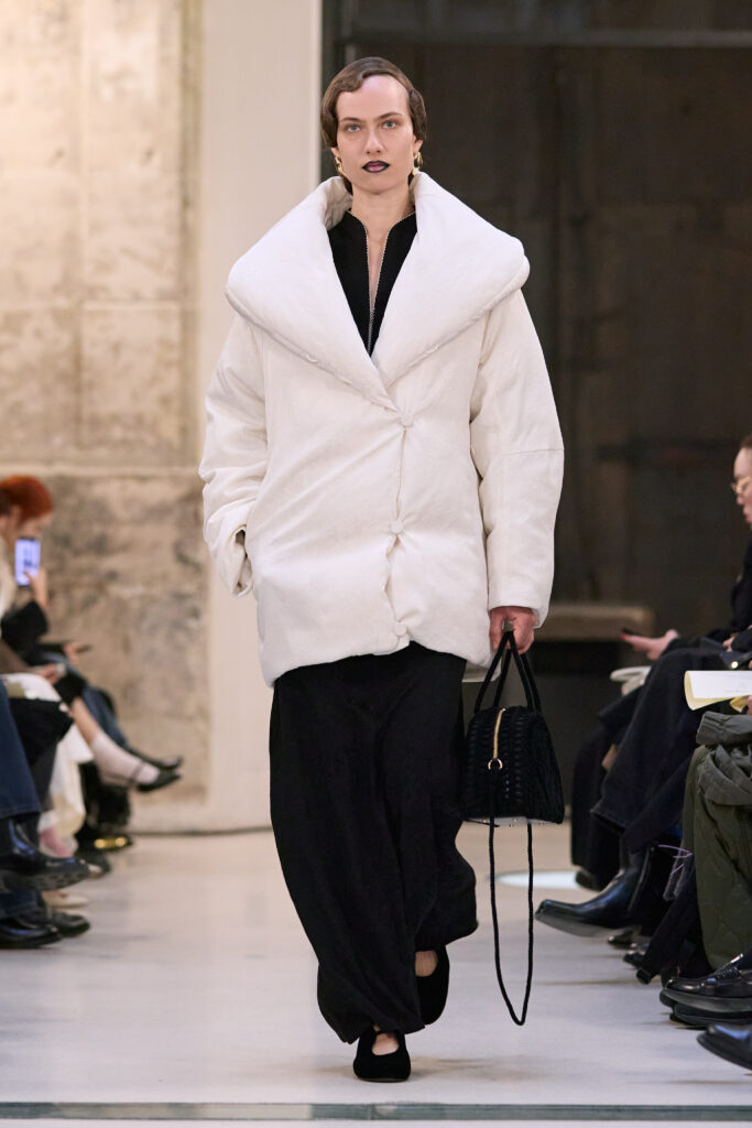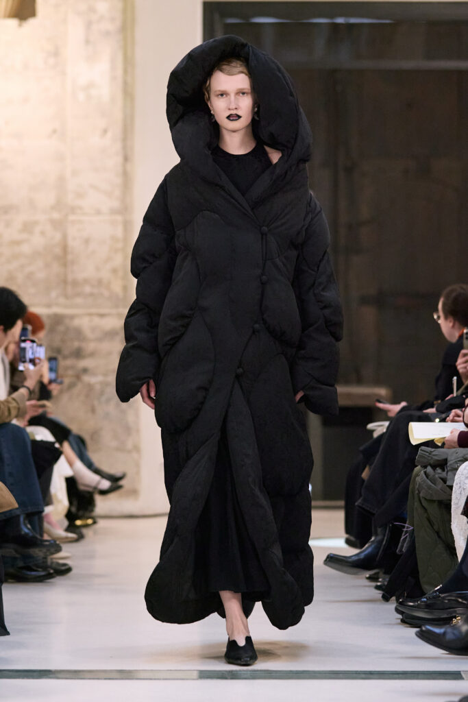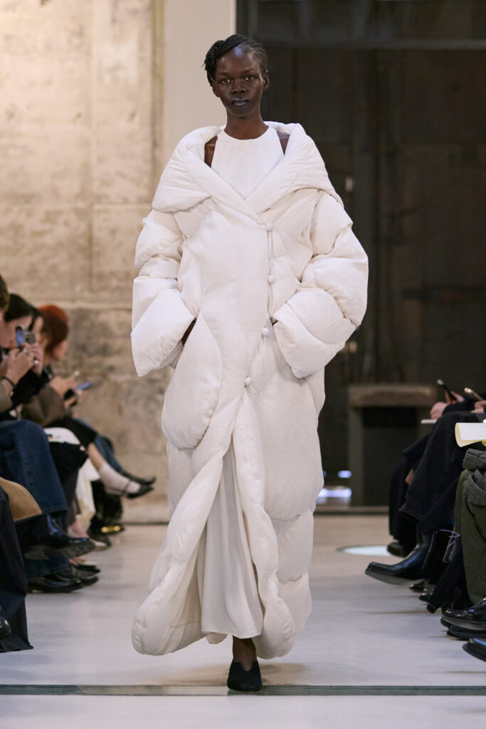 Les volumes de la saison s’inspirent de pierres polies, de nuages de sucre filé et de kagami mochi, ces offrandes japonaises en forme de sphères superposées. Le travail du matelassage façon down atteint un degré de technicité rare : chaque composant est fusionné avec une précision d’orfèvre, créant des volumes vivants et organiques.