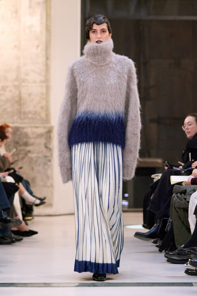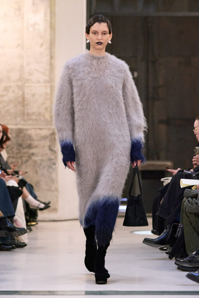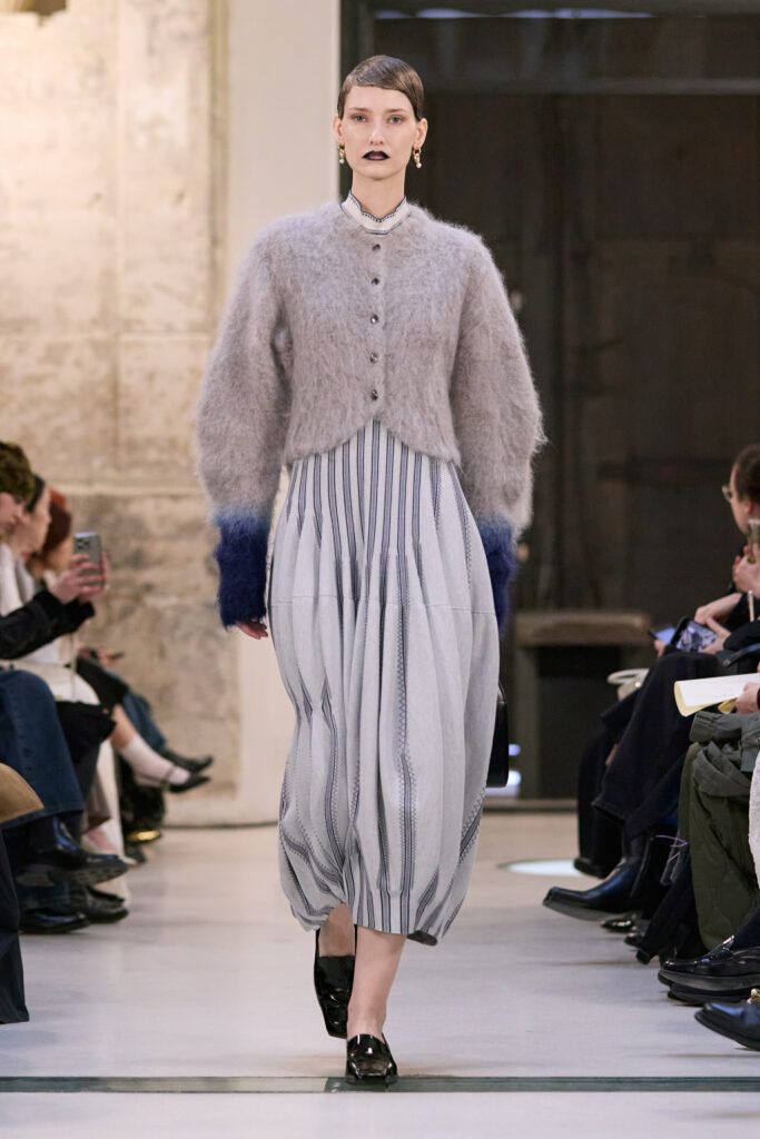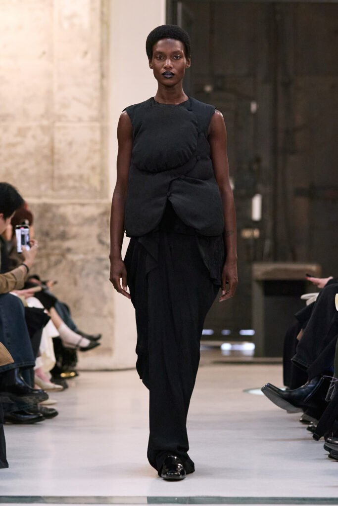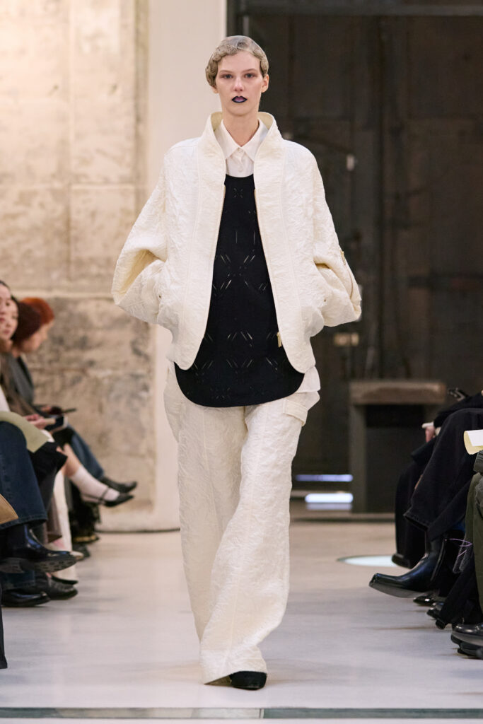 Les volumes de la saison s’inspirent de pierres polies, de nuages de sucre filé et de kagami mochi, ces offrandes japonaises en forme de sphères superposées. Le travail du matelassage façon down atteint un degré de technicité rare : chaque composant est fusionné avec une précision d’orfèvre, créant des volumes vivants et organiques.