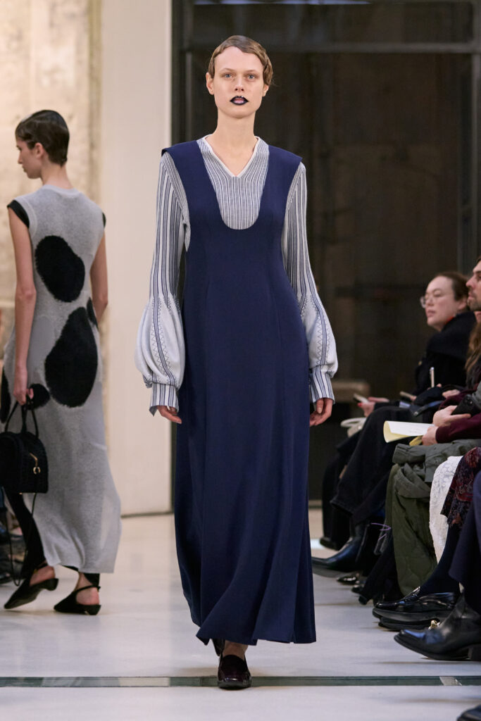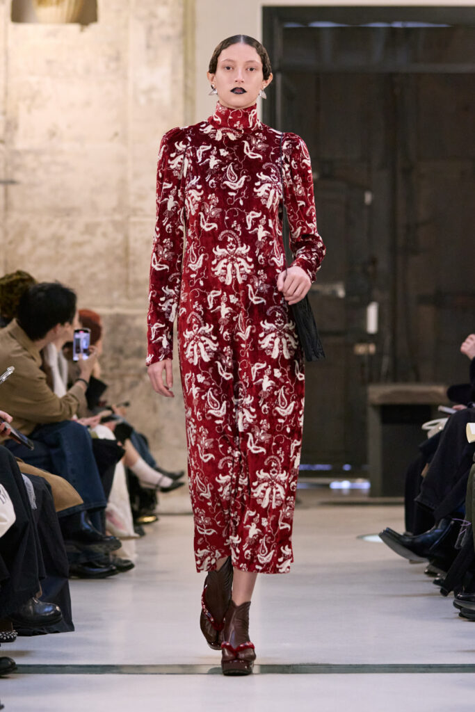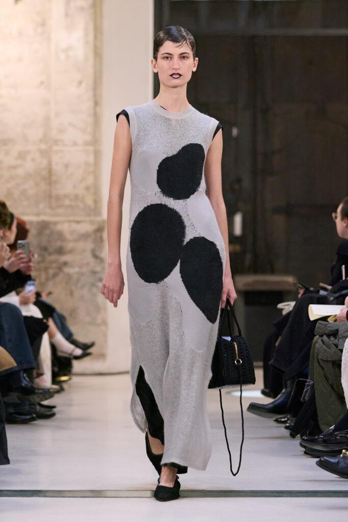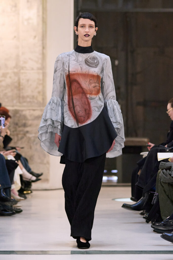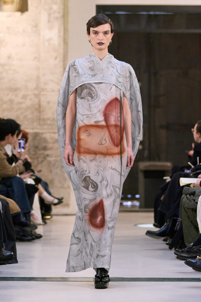 Le passage du temps se traduit dans la collection à travers le Suminagashi, une technique de marbrure japonaise où l’encre flotte à la surface de l’eau avant d’être capturée sur papier. Décliné sur des robes-cocon et des tops à volants, cet effet donne une sensation d’impermanence et de mouvement perpétuel.