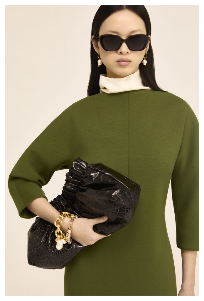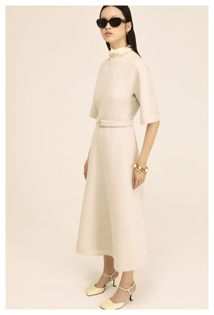 - La robe longue s’impose comme une pièce phare, fluide mais structurée, parfaite incarnation de la philosophie de la maison : subtilité, raffinement et intemporalité.