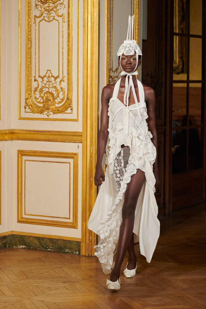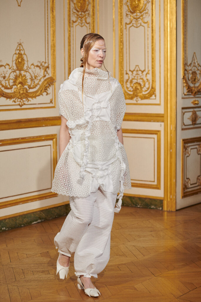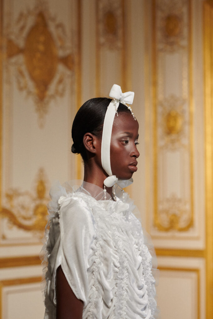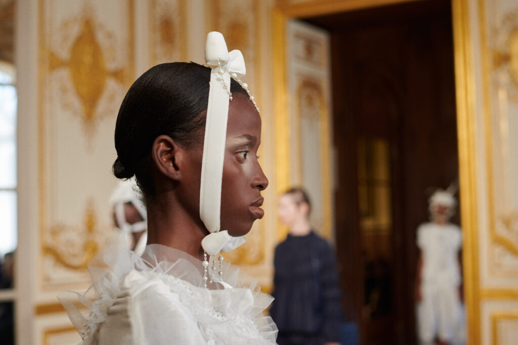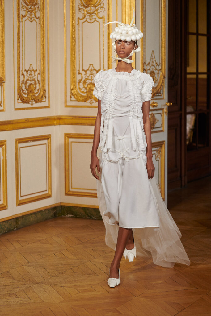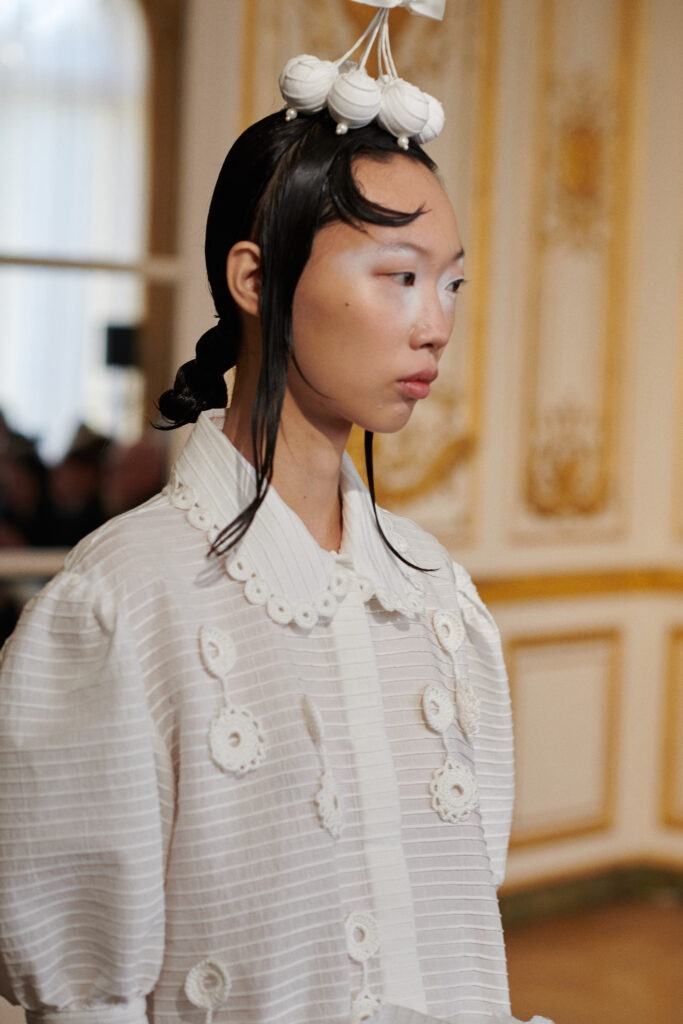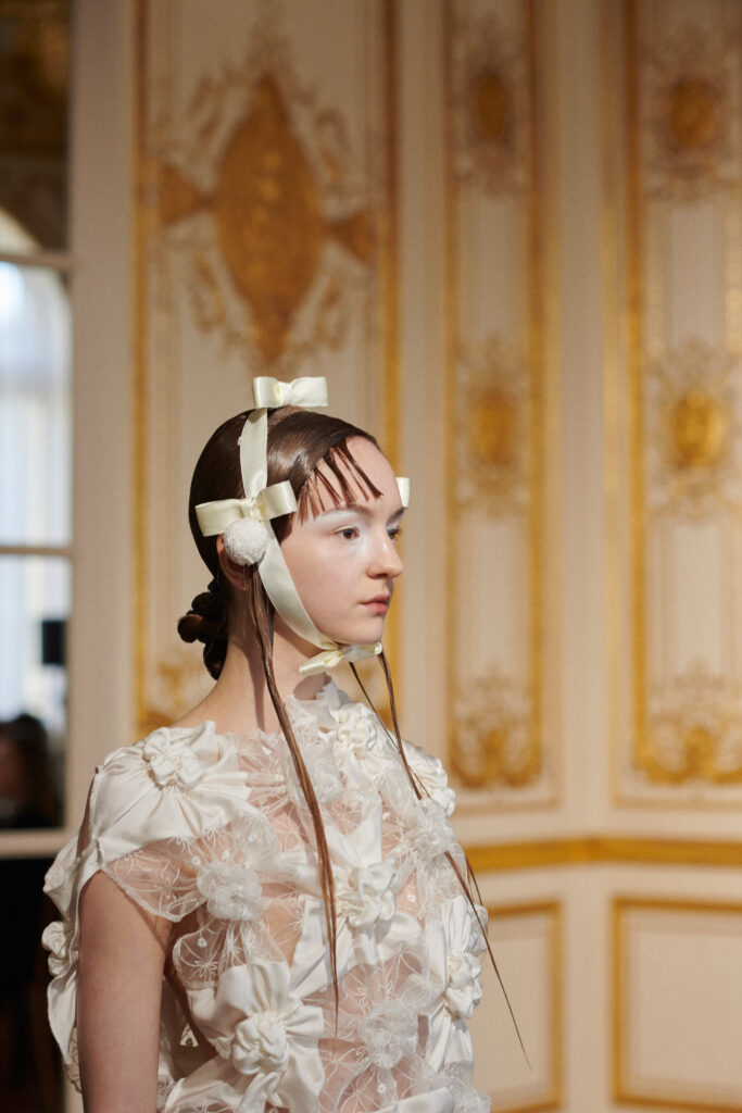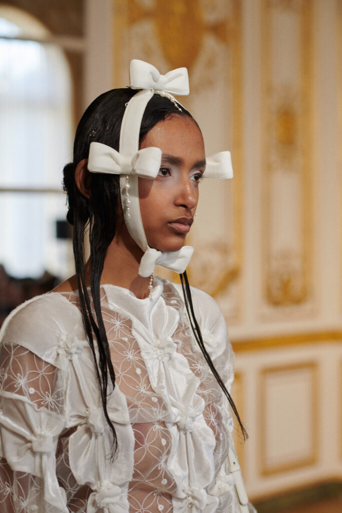 - Stephen Jones, maître de la haute chapellerie, crée une série de coiffes sculpturales, où des baies de coton et des rubans entrelacés forment des halos délicats. Ces pièces seront disponibles en exclusivité chez Dover Street Market et Comme des Garçons.