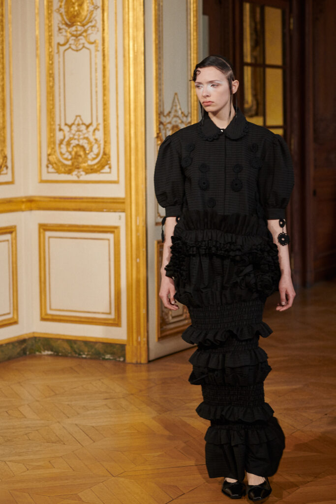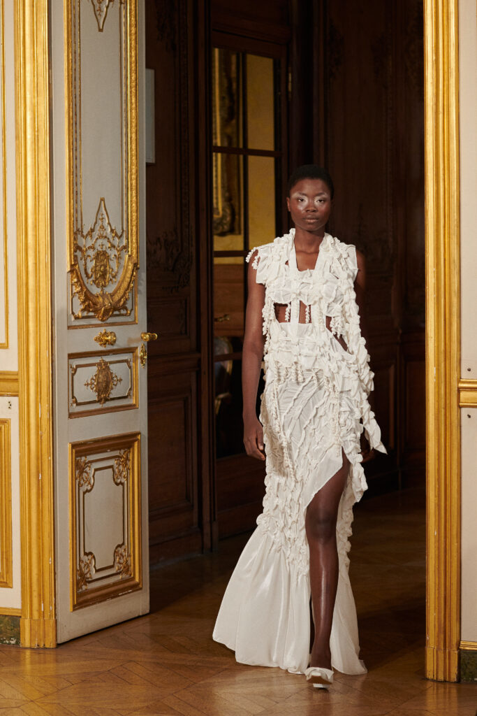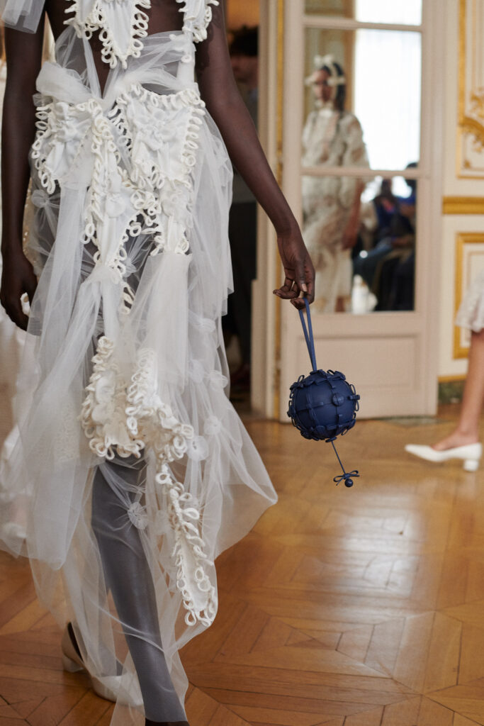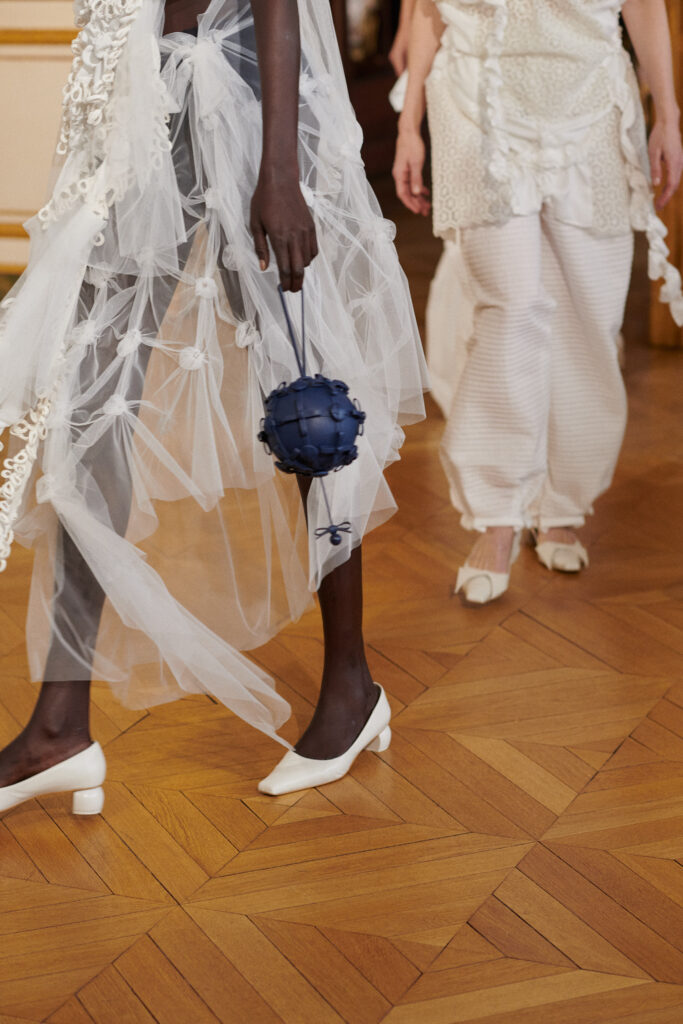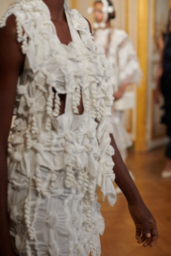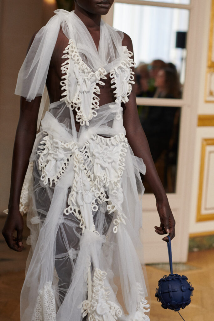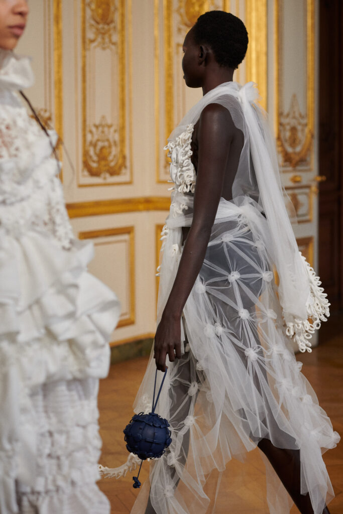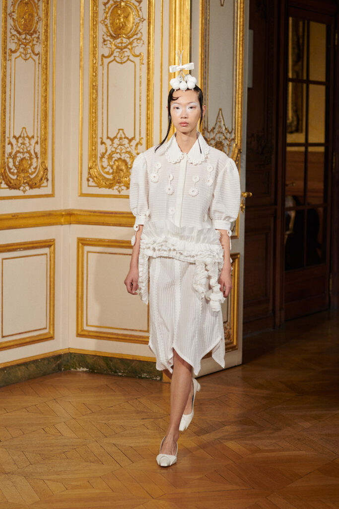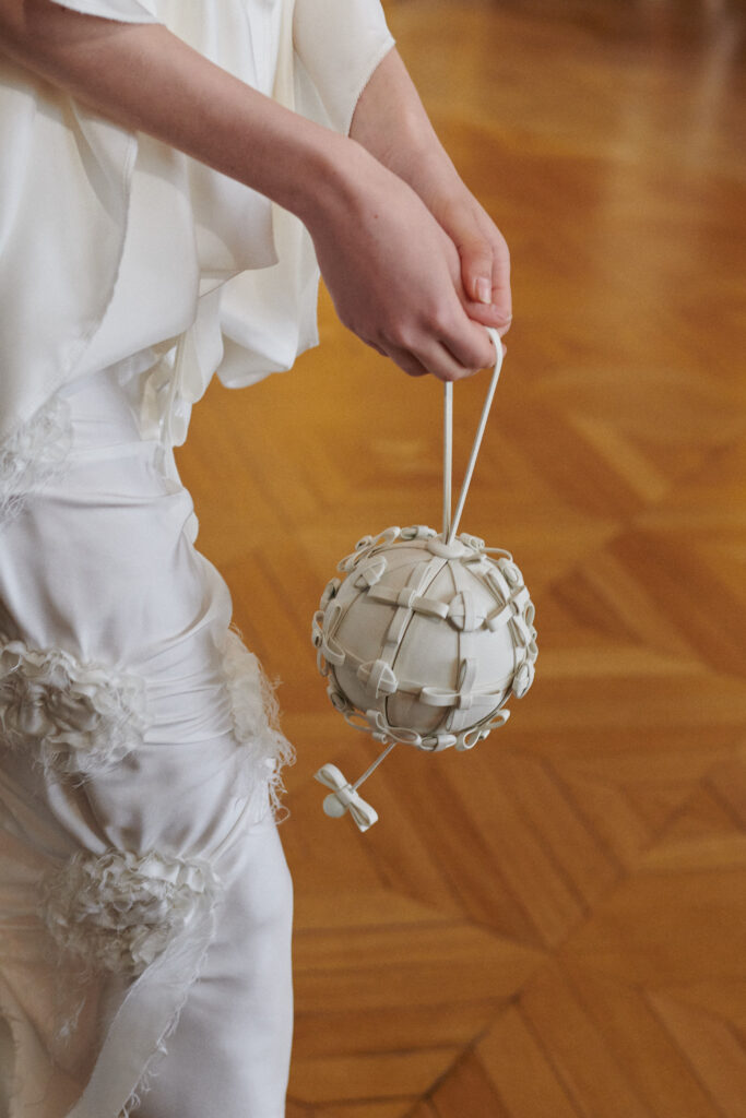 - Stephen Jones, maître de la haute chapellerie, crée une série de coiffes sculpturales, où des baies de coton et des rubans entrelacés forment des halos délicats. Ces pièces seront disponibles en exclusivité chez Dover Street Market et Comme des Garçons.