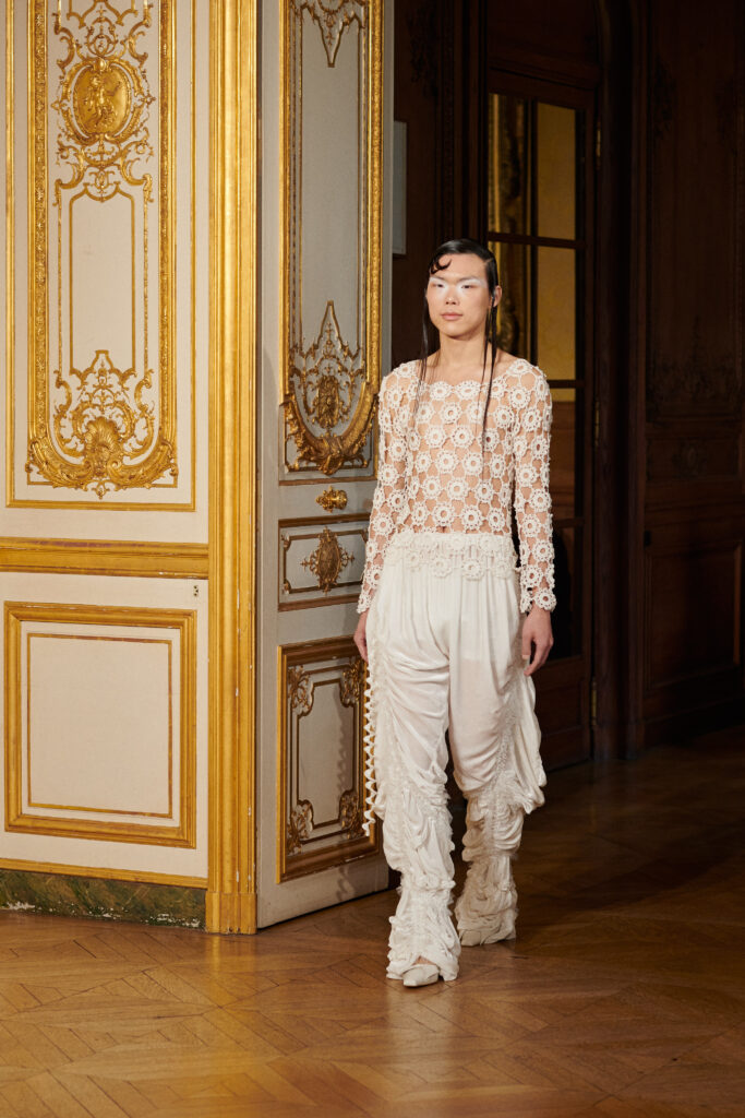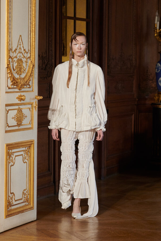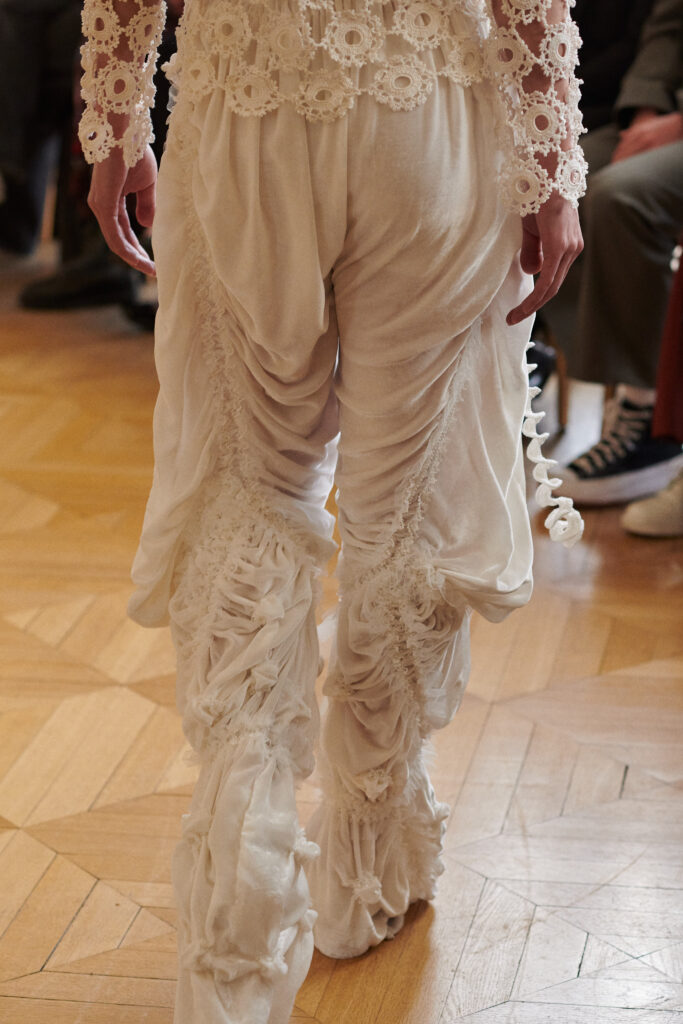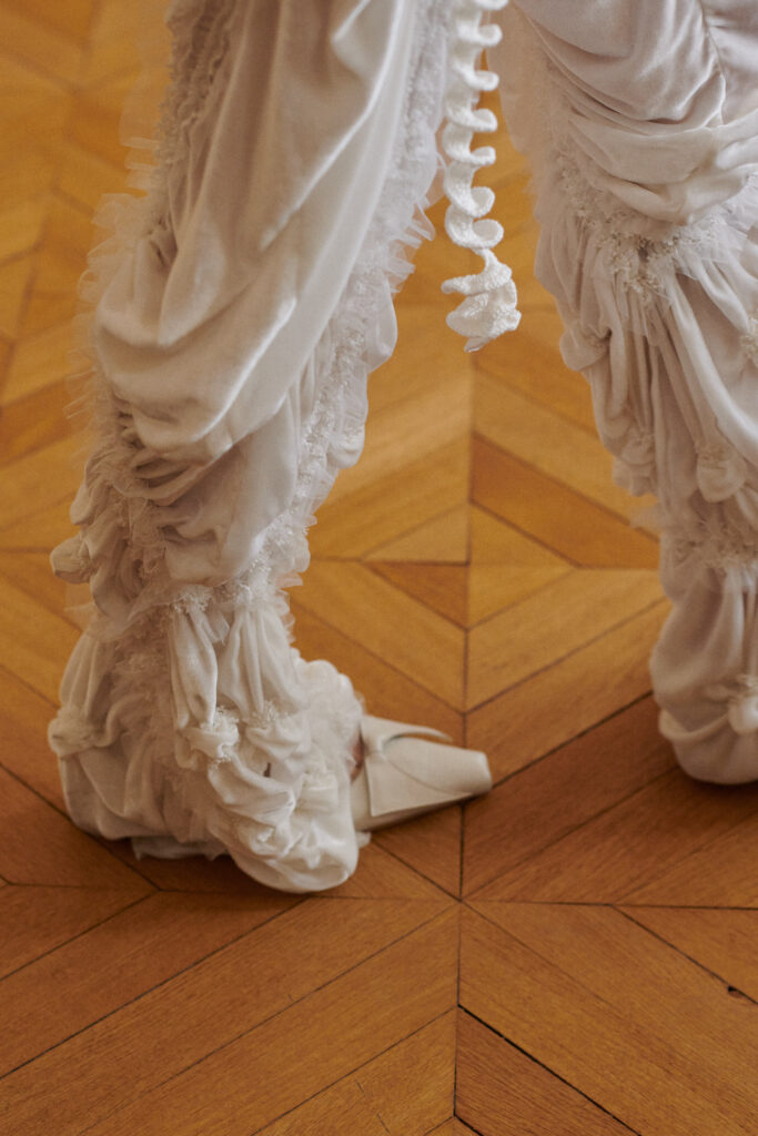 - Des pantalons fluides en soie et tulle, où la transparence dialogue avec la densité des plis.