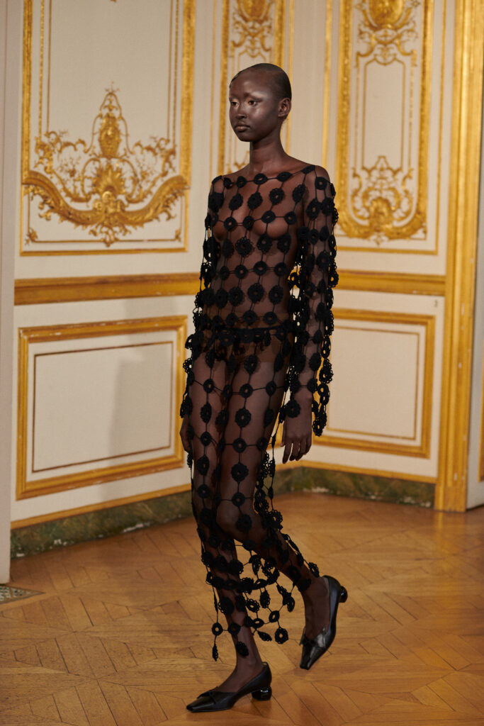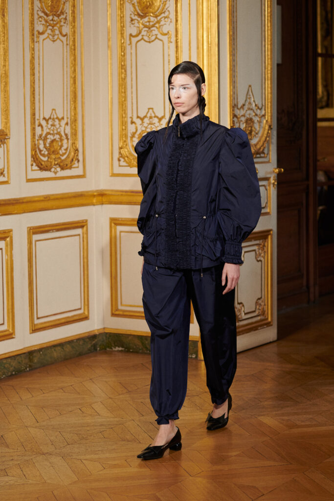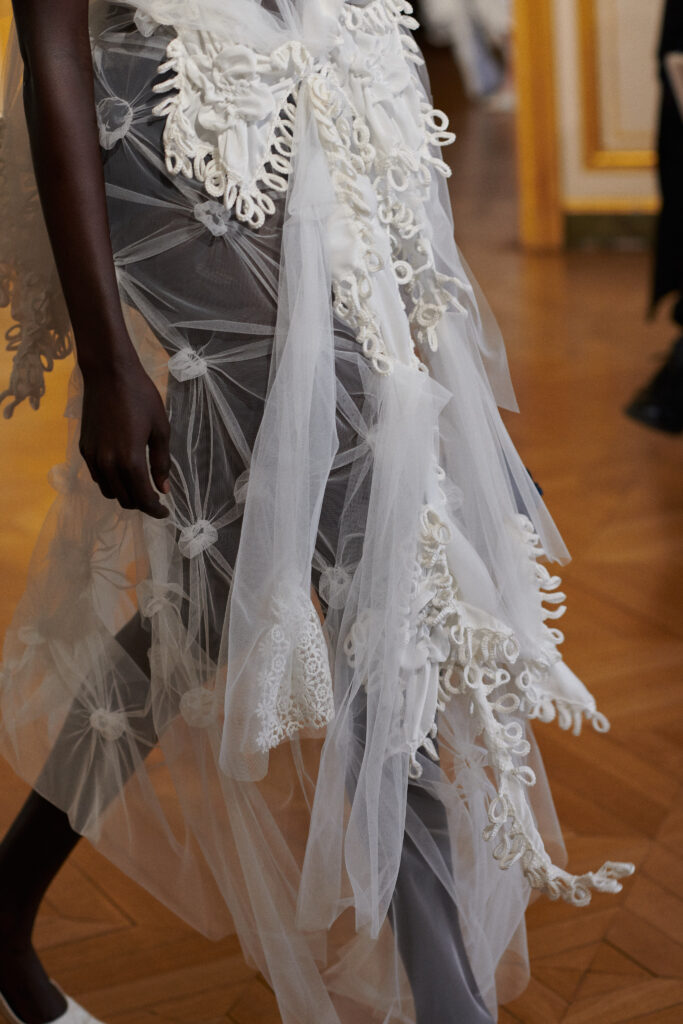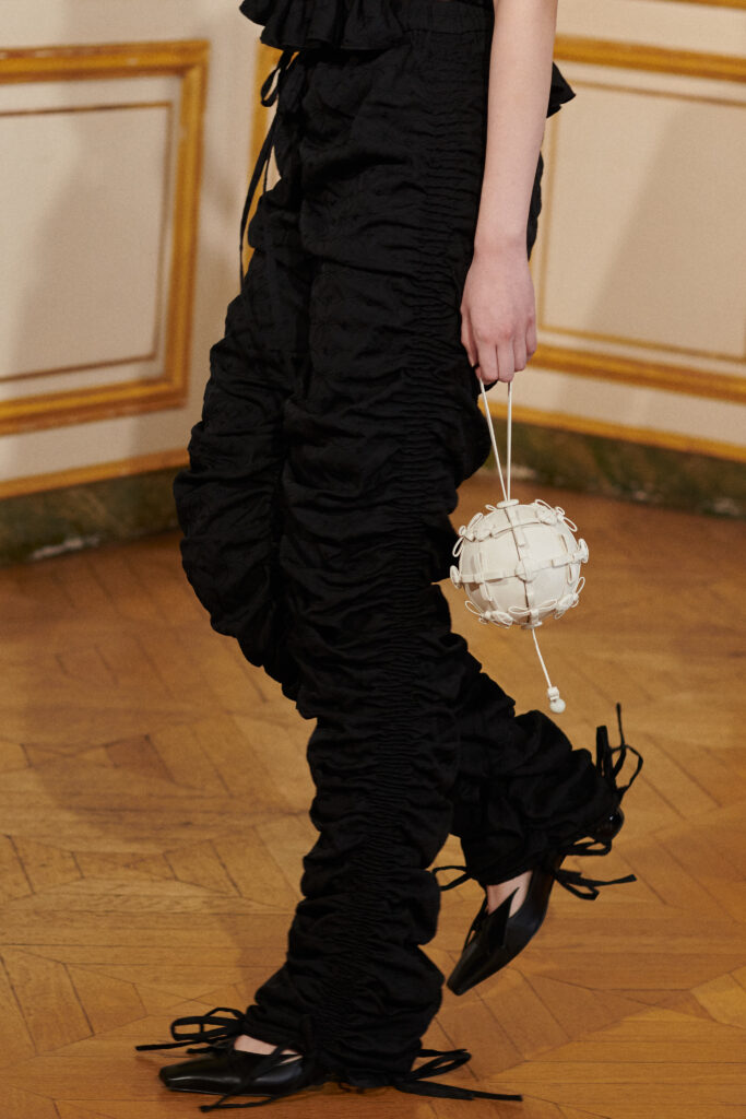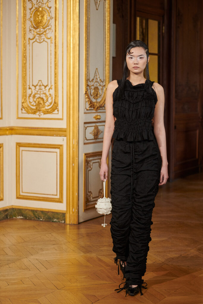 - Des pantalons fluides en soie et tulle, où la transparence dialogue avec la densité des plis.