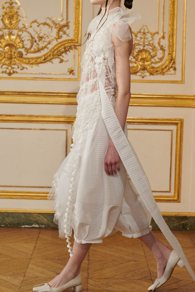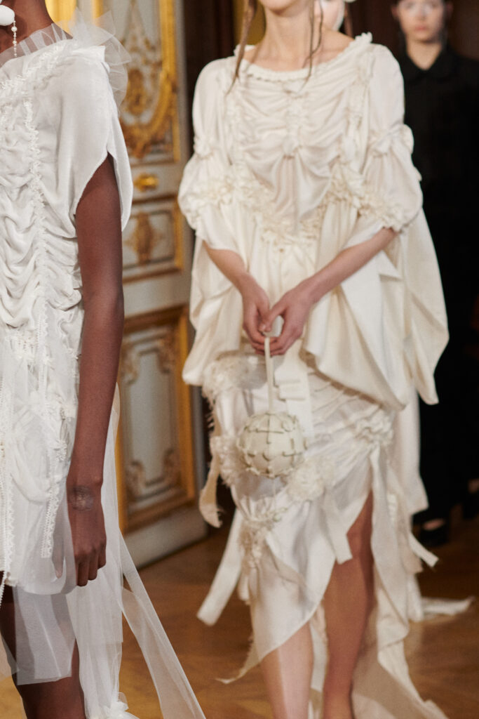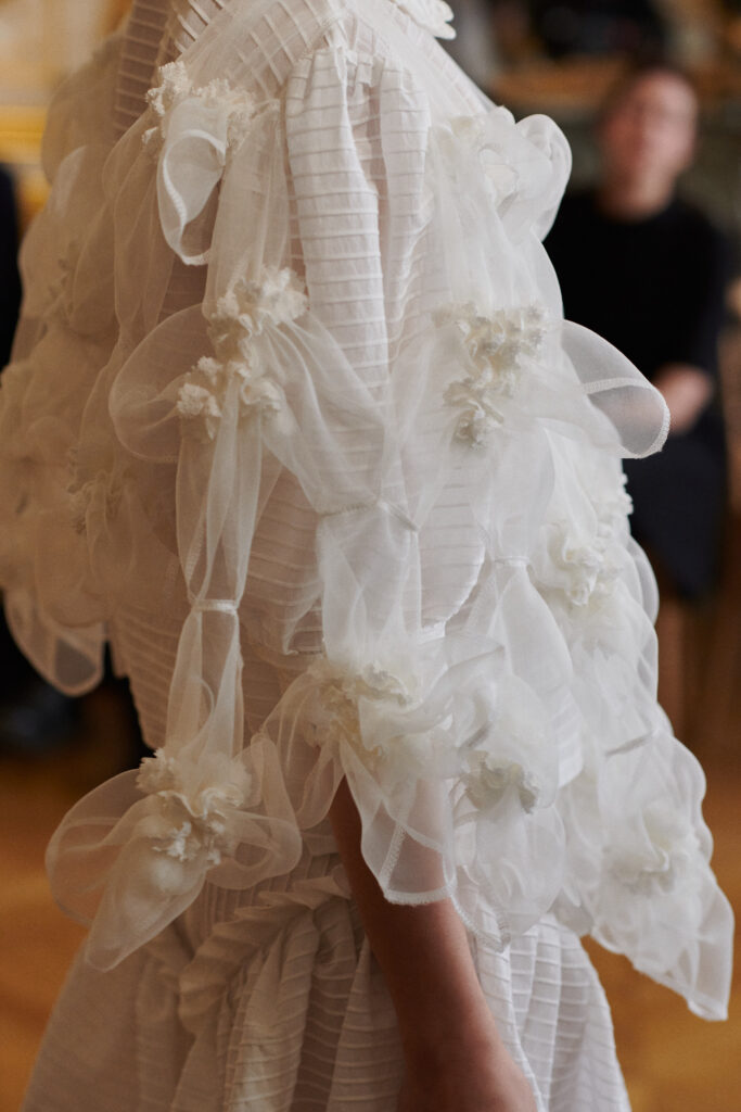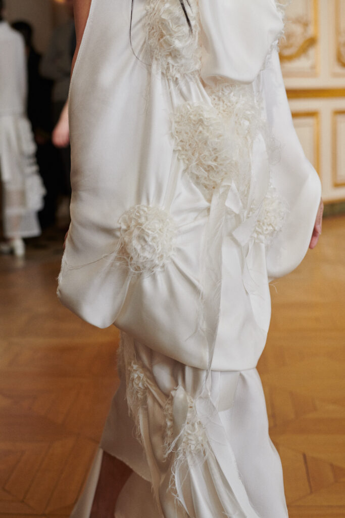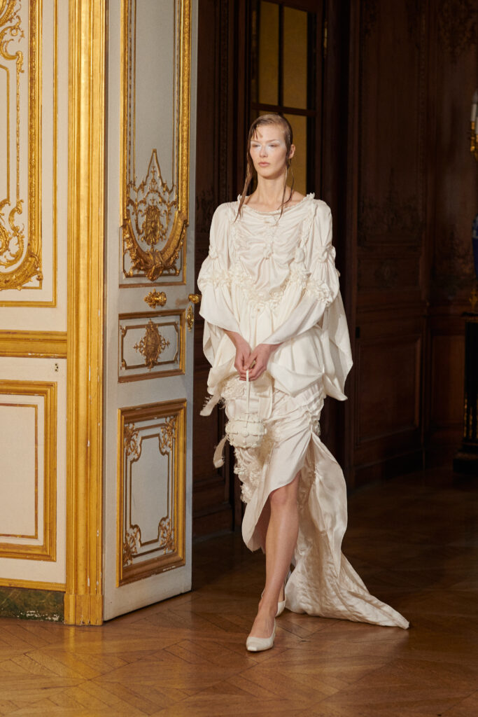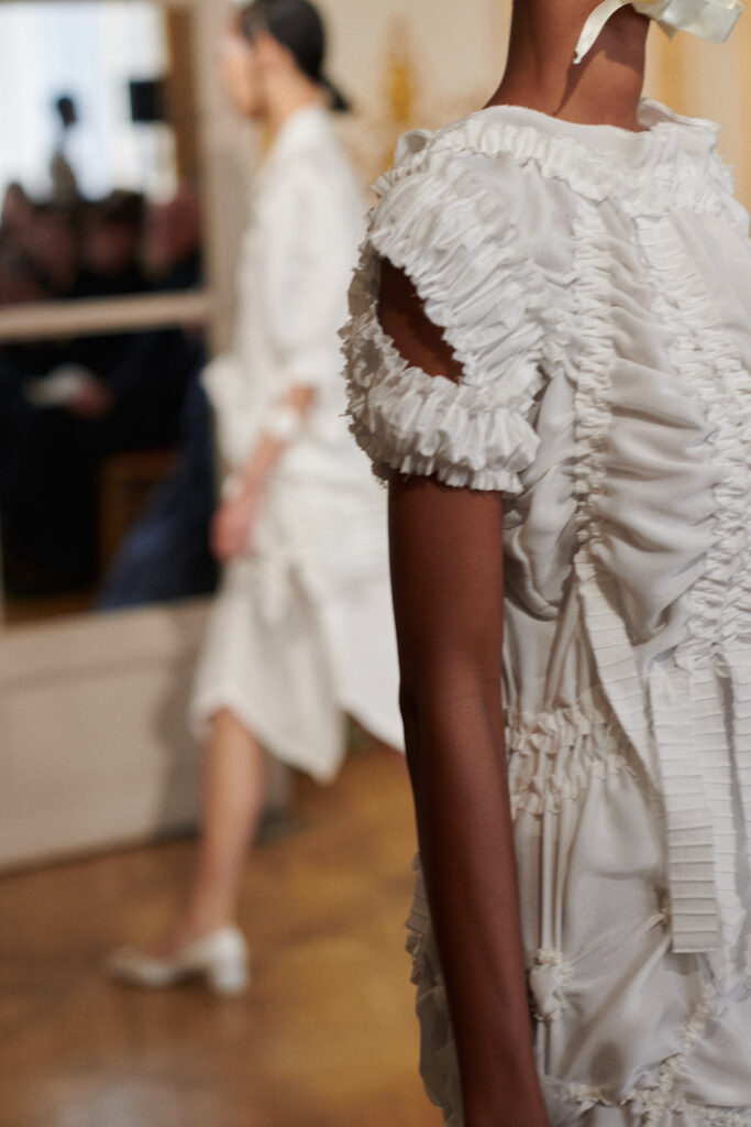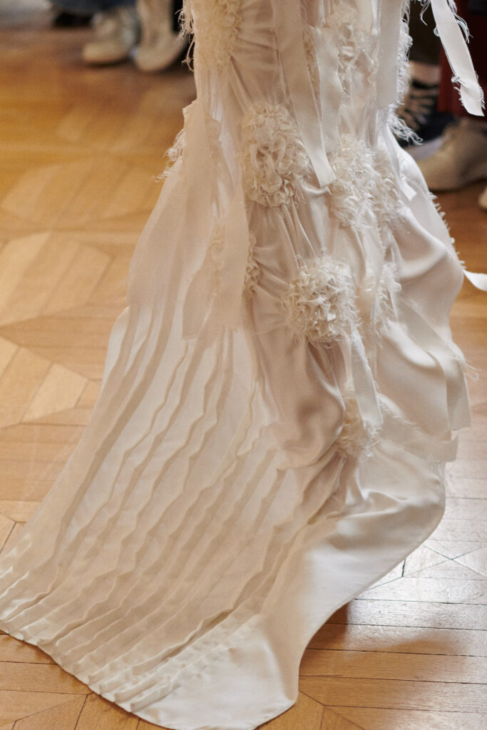 - Des volants smockés en soie poudrée, évoquant des souvenirs en suspens.