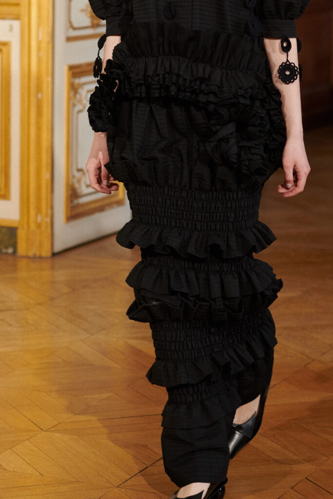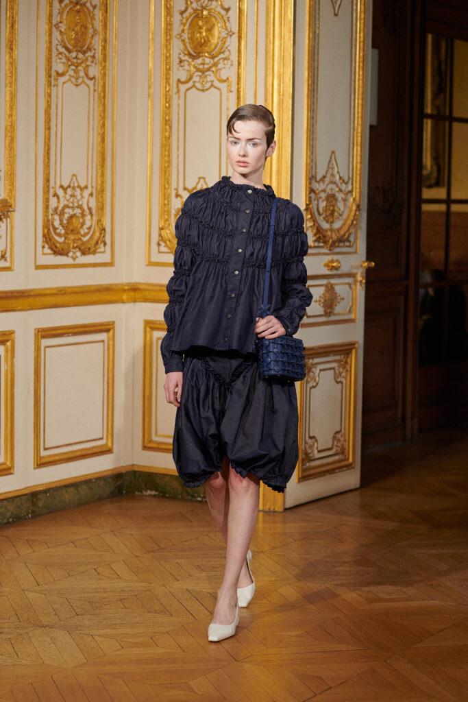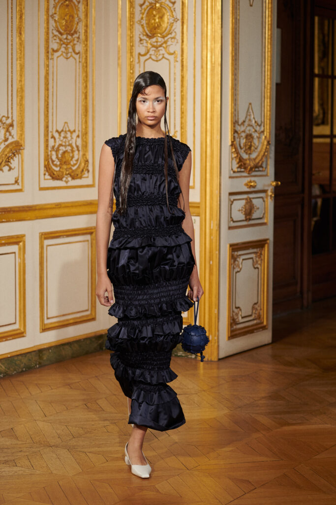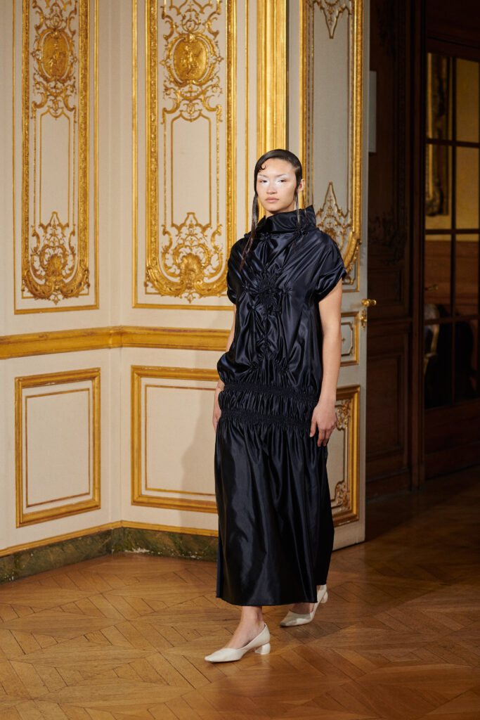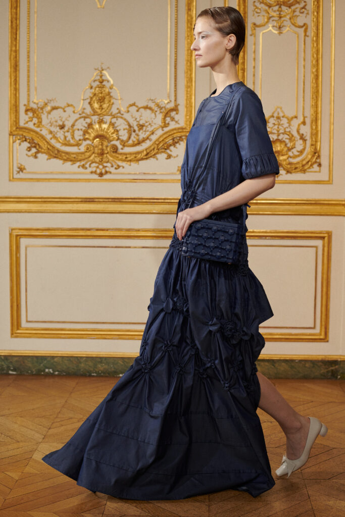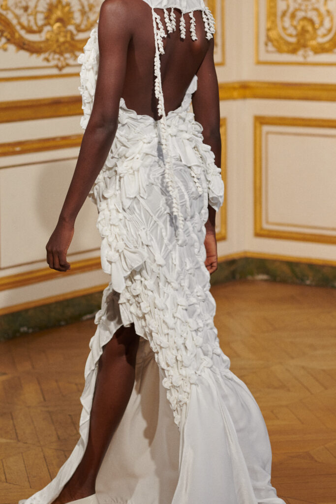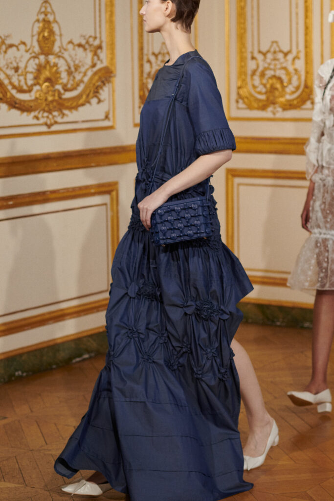- Des volants smockés en soie poudrée, évoquant des souvenirs en suspens.