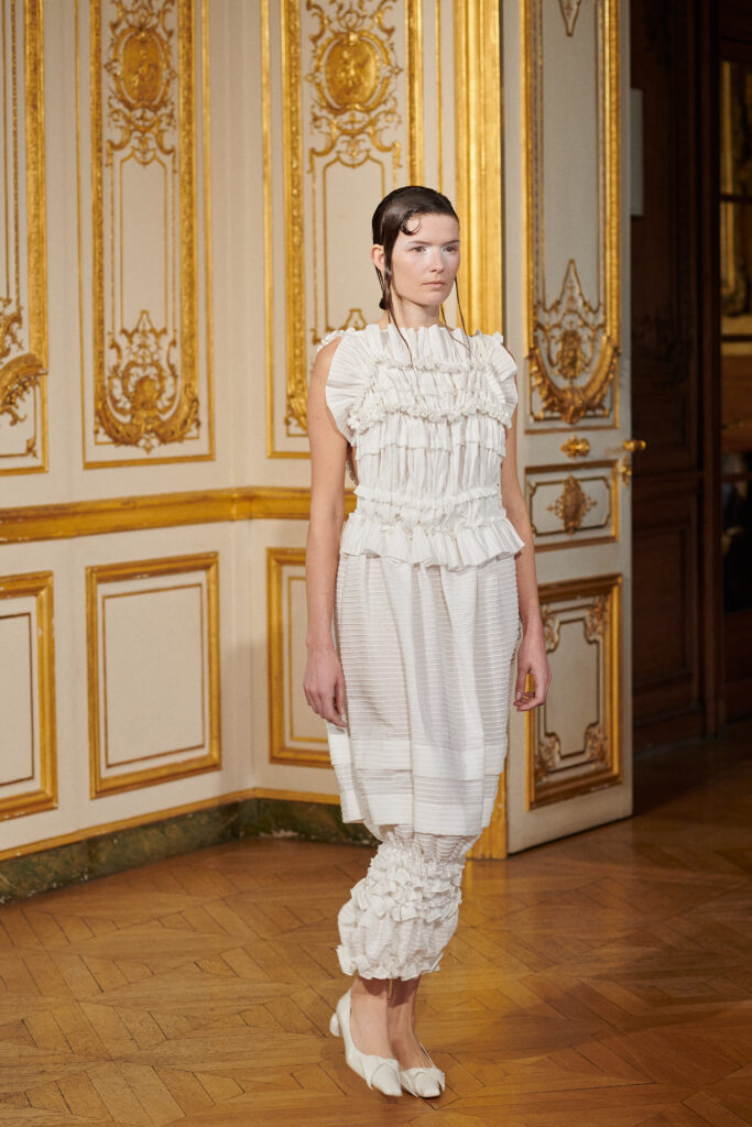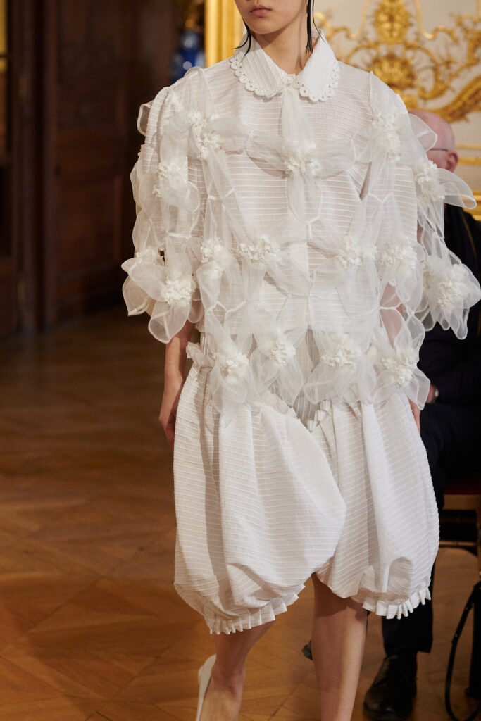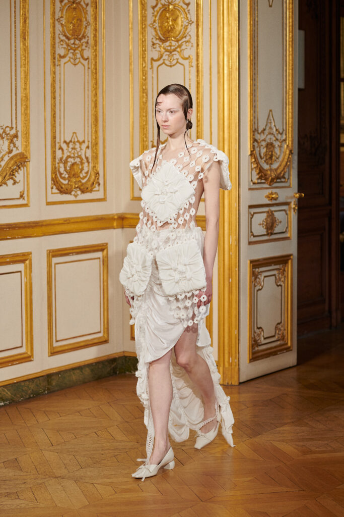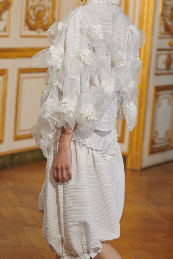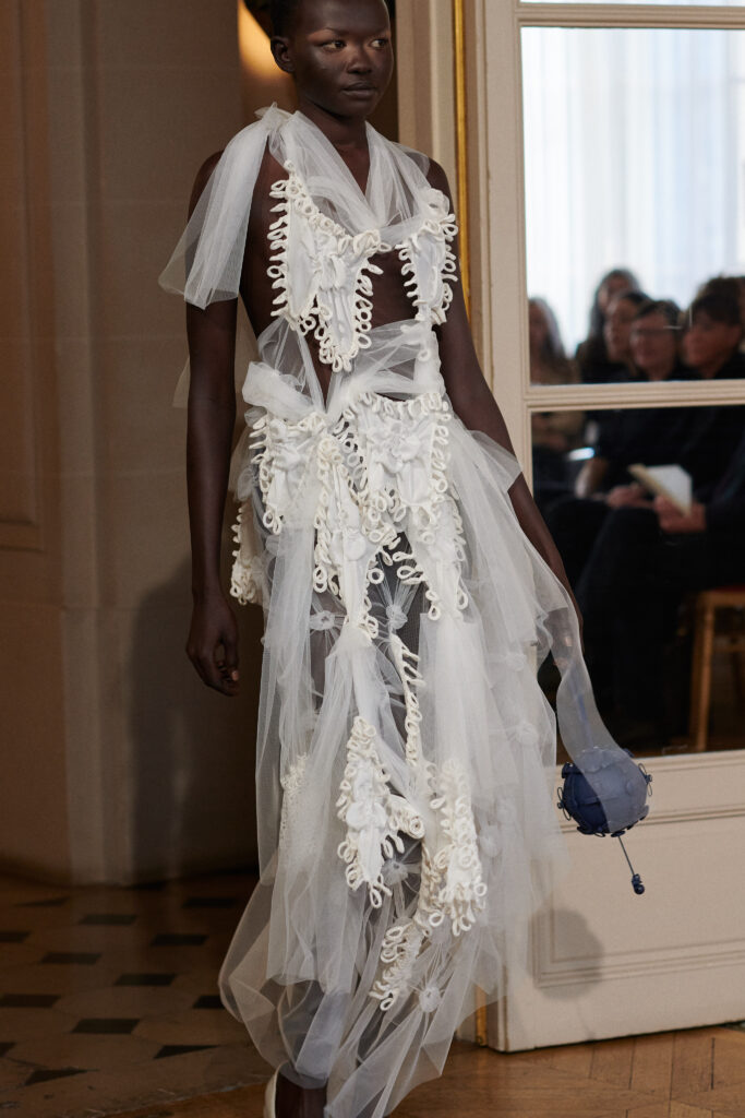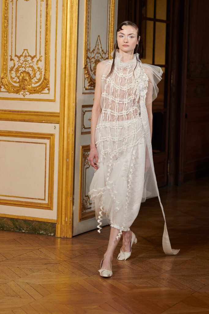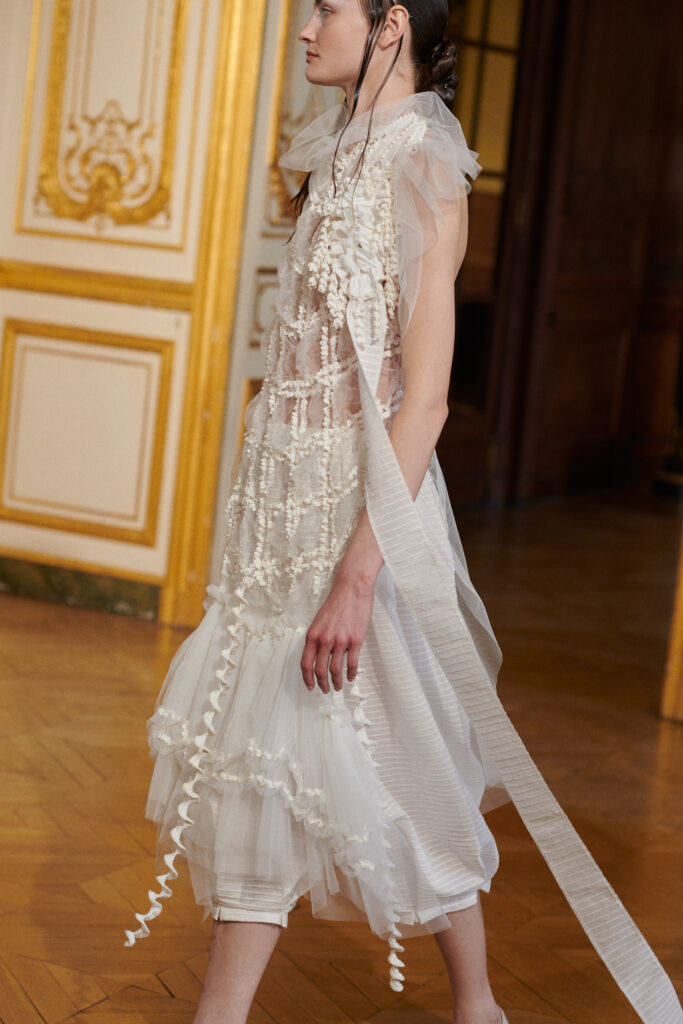 Inspirée par les formes évanescentes de la nature, Pierce s’appuie sur les photographies de flocons de neige de Wilson Bentley, la poésie de Sylvia Plath, et l’obsession proustienne du souvenir pour composer un vestiaire fait de soies plissées, de tulle suspendu et de coton brodé.