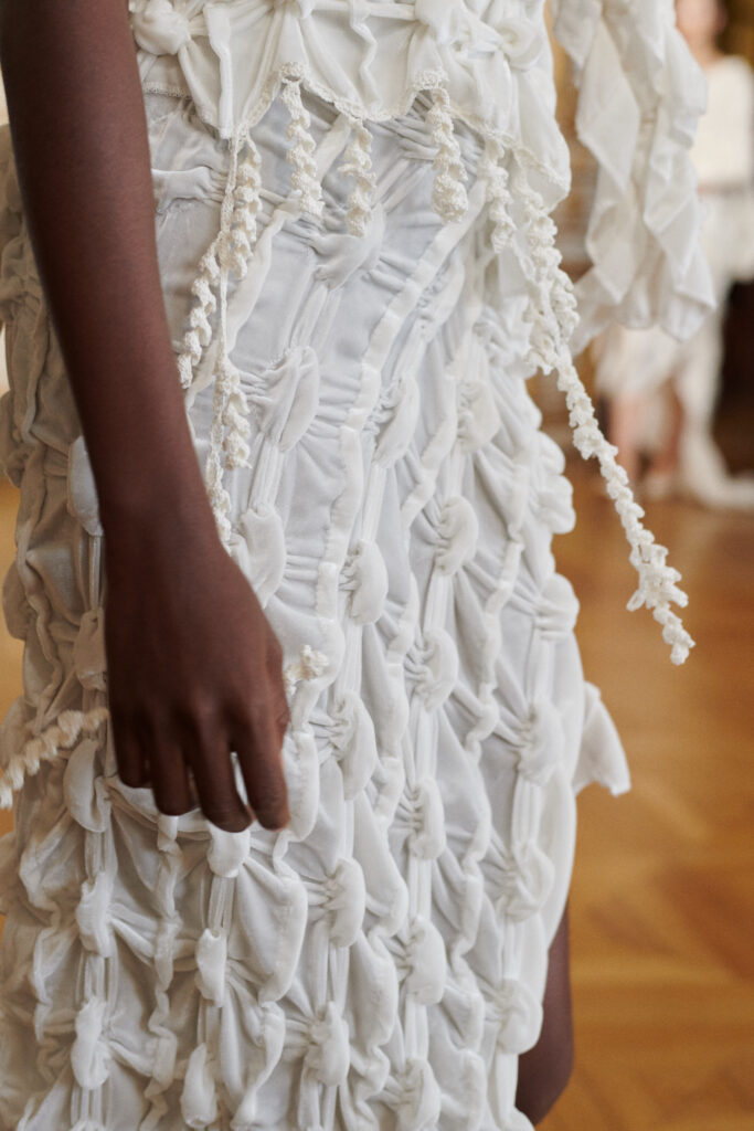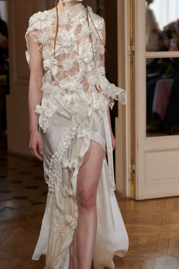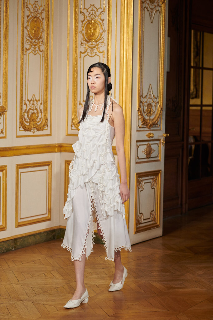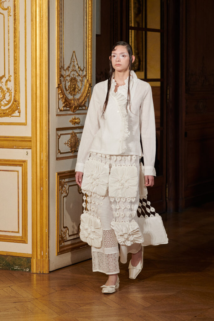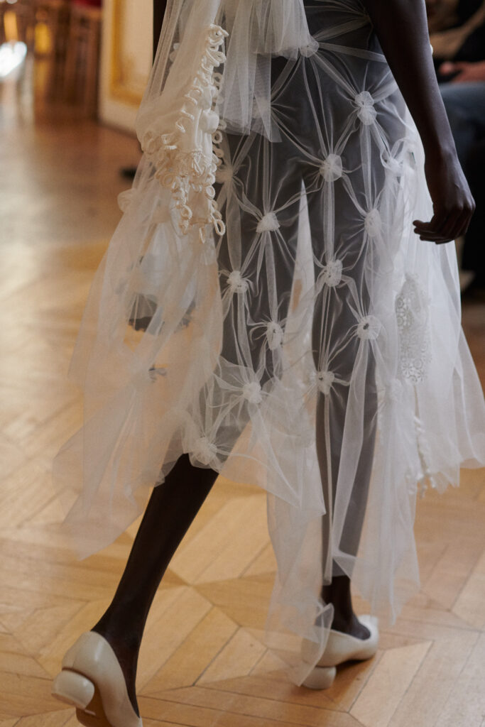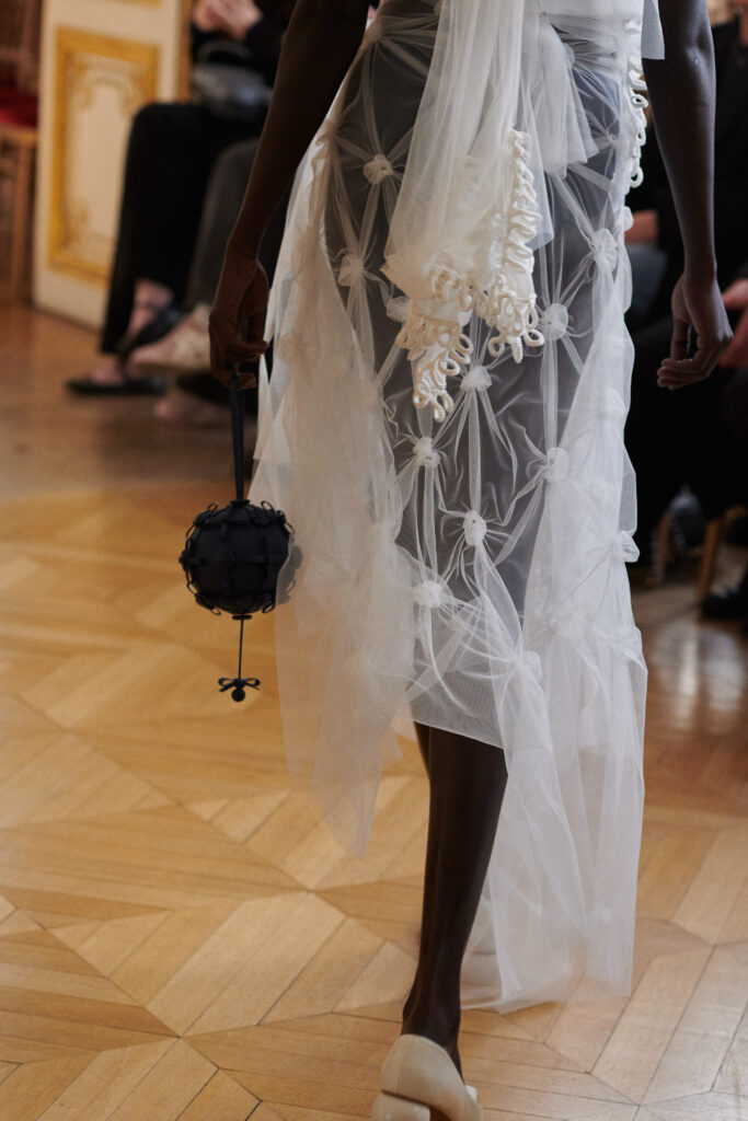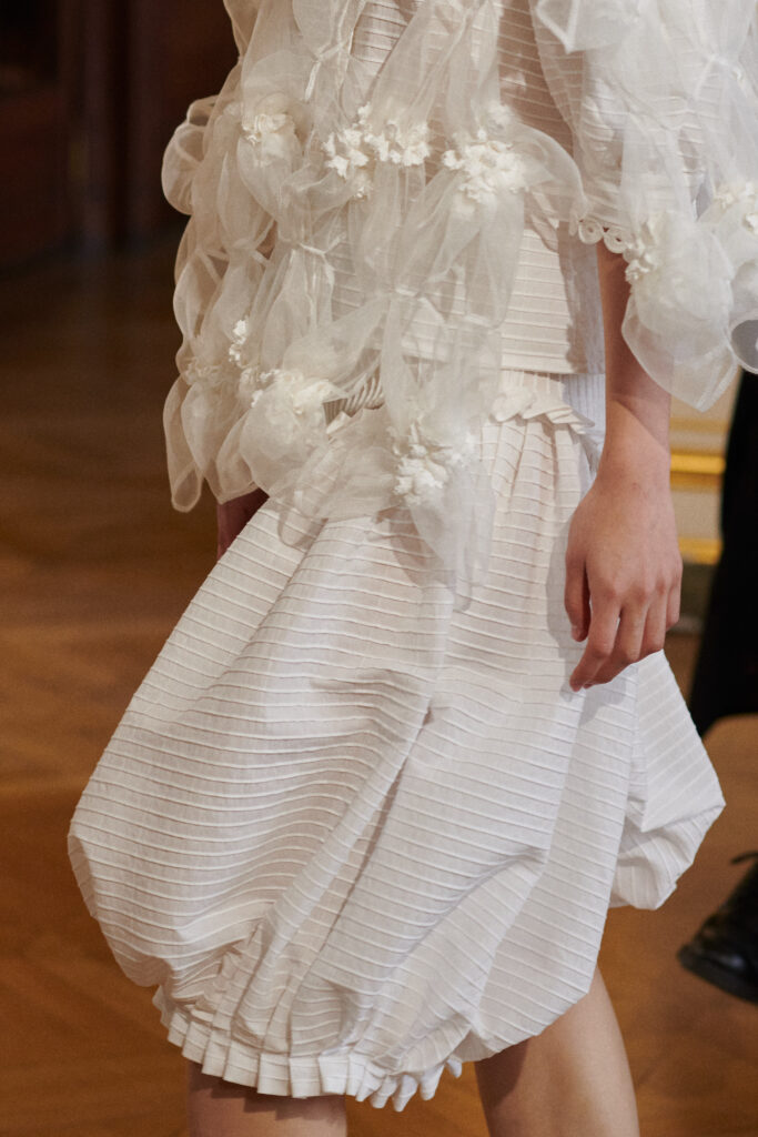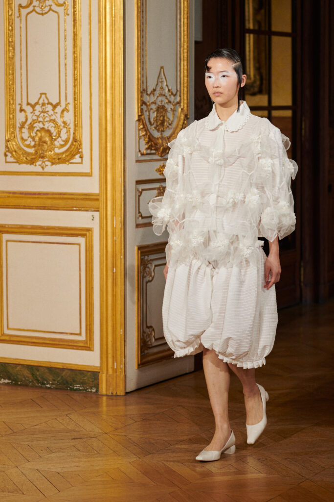 Inspirée par les formes évanescentes de la nature, Pierce s’appuie sur les photographies de flocons de neige de Wilson Bentley, la poésie de Sylvia Plath, et l’obsession proustienne du souvenir pour composer un vestiaire fait de soies plissées, de tulle suspendu et de coton brodé.