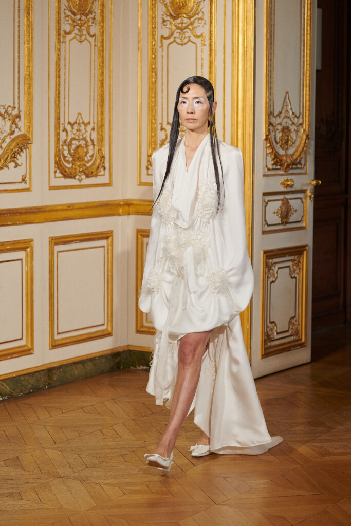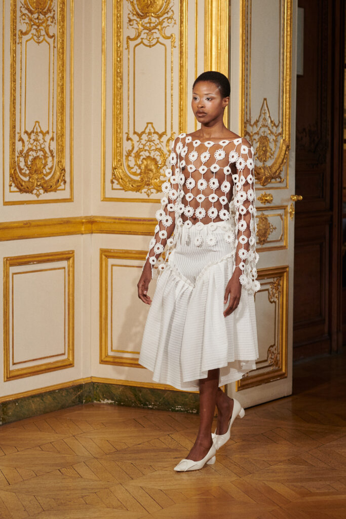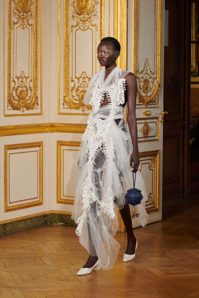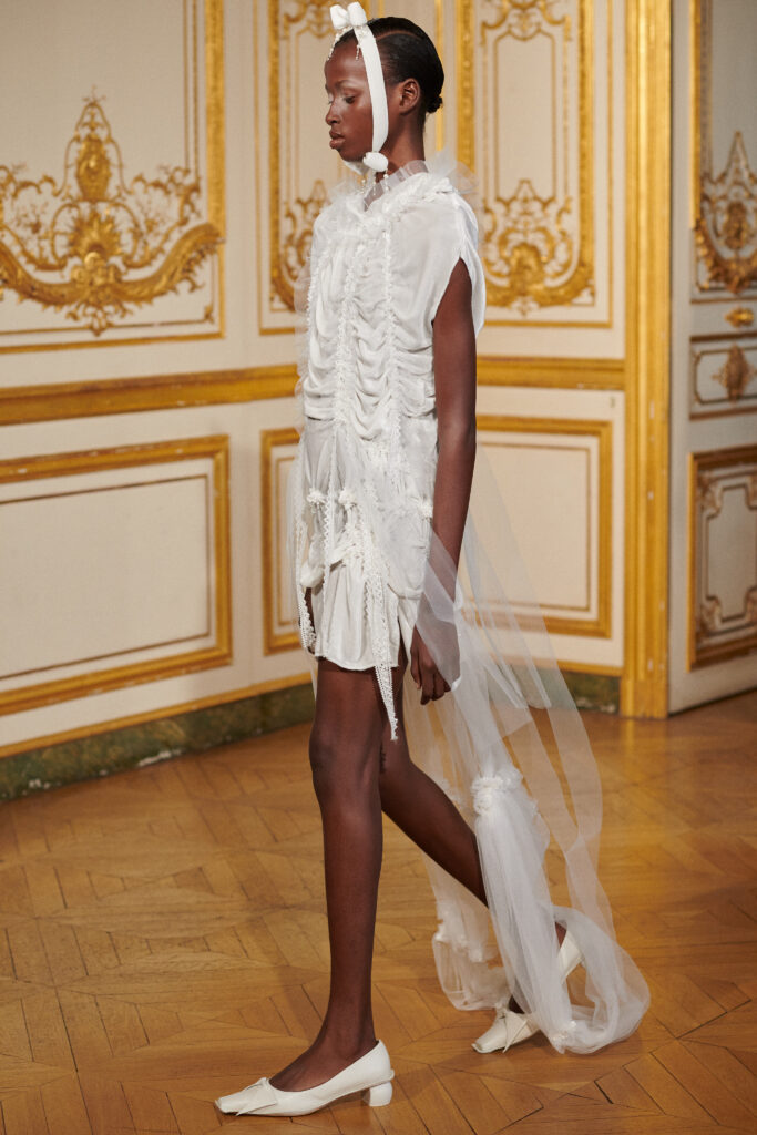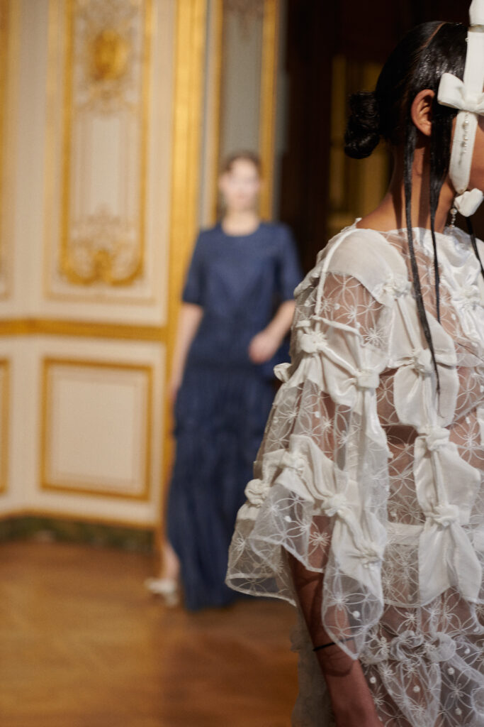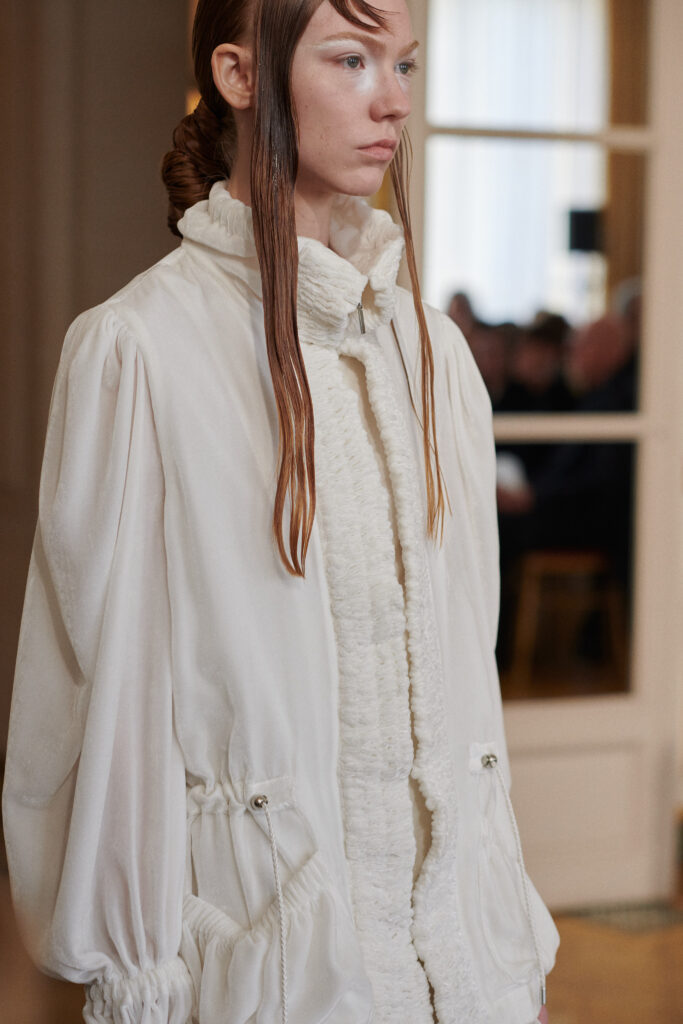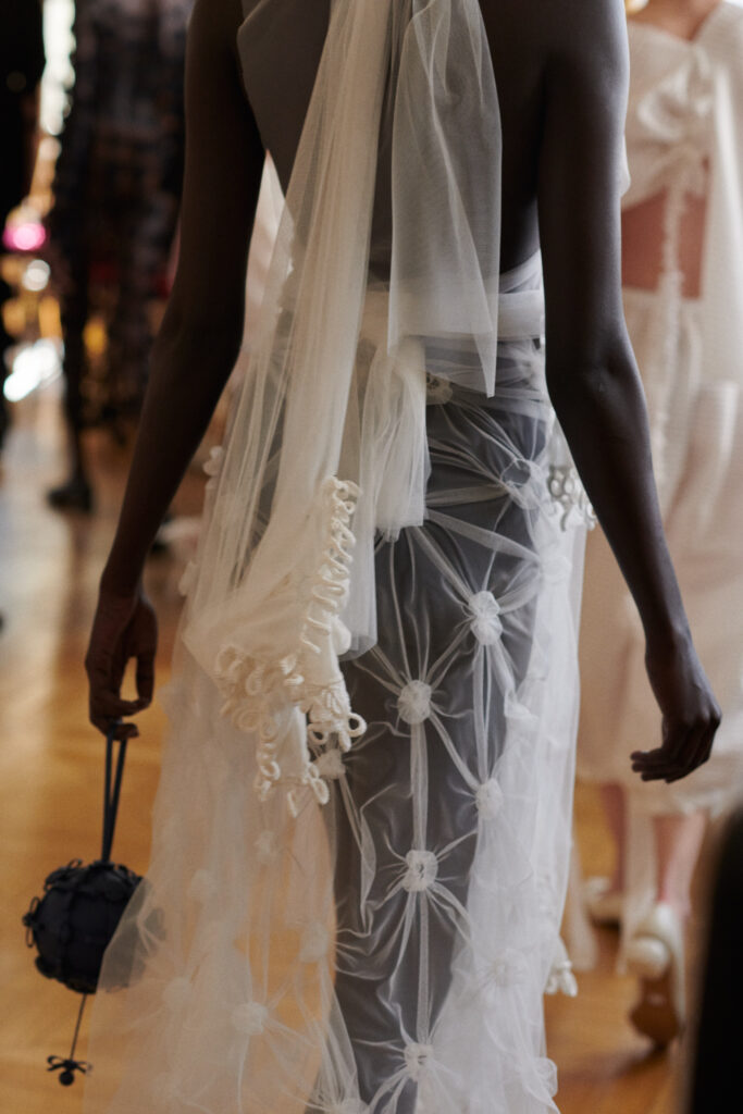 Inspirée par les formes évanescentes de la nature, Pierce s’appuie sur les photographies de flocons de neige de Wilson Bentley, la poésie de Sylvia Plath, et l’obsession proustienne du souvenir pour composer un vestiaire fait de soies plissées, de tulle suspendu et de coton brodé.