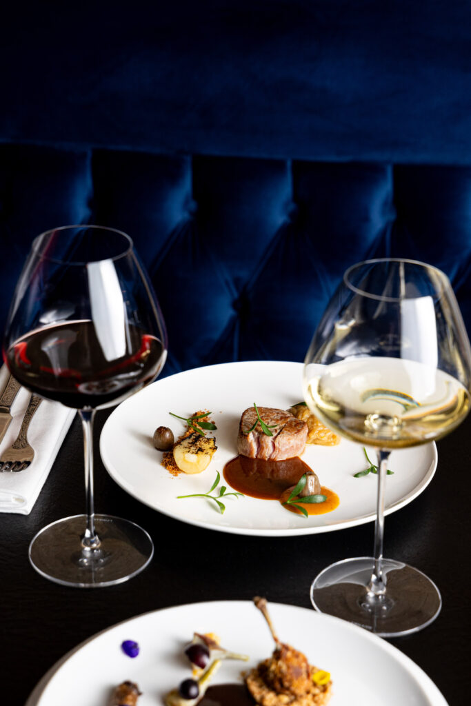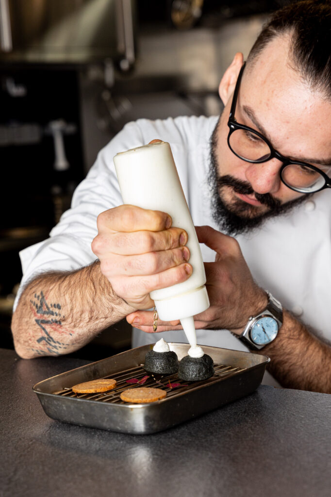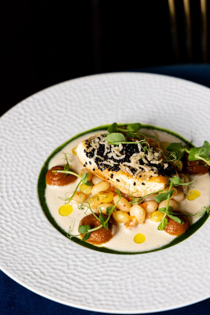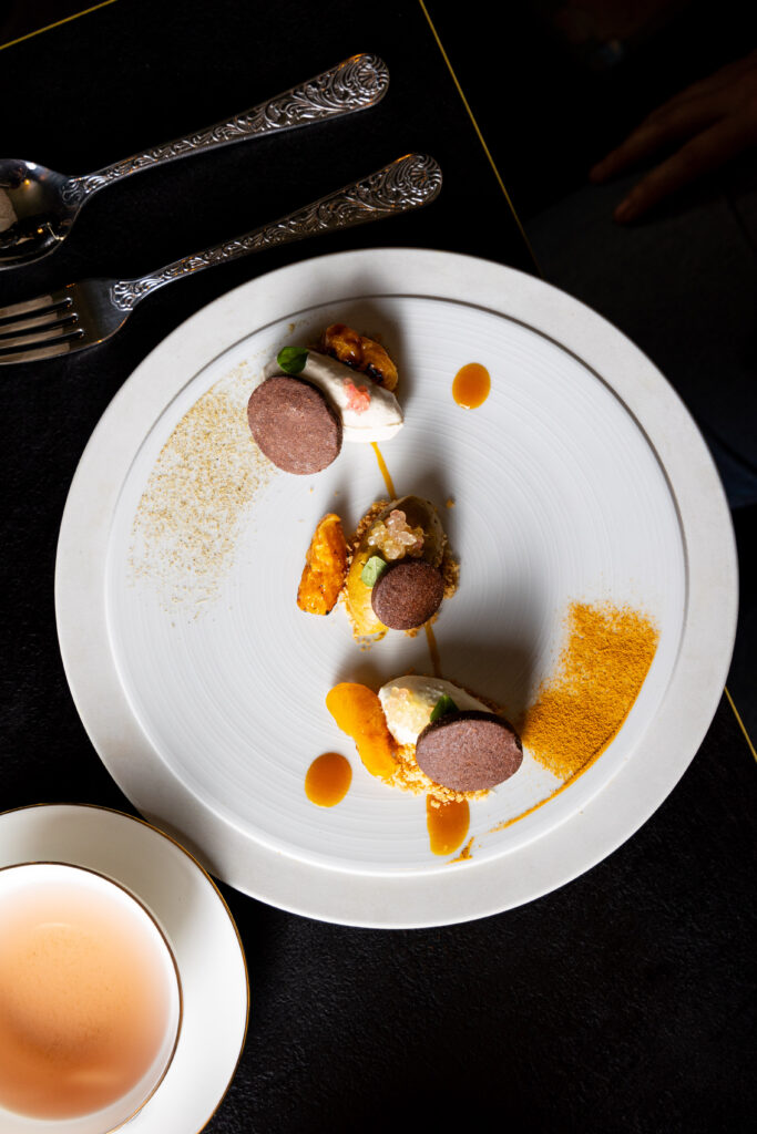 Parmi les plats signatures, difficile de passer à côté du « Veau de la Reine Claude », un équilibre parfait entre la tendresse de la viande et la douceur acidulée du fruit. Le « Gâteau de poivron rouge, œuf mollet, siphon feta » déconcerte et séduit, tout comme le « Fassoulia de Turbo », une interprétation personnelle et modernisée d’un plat traditionnel du Levant.