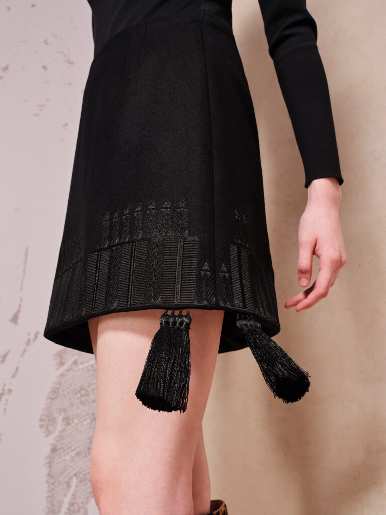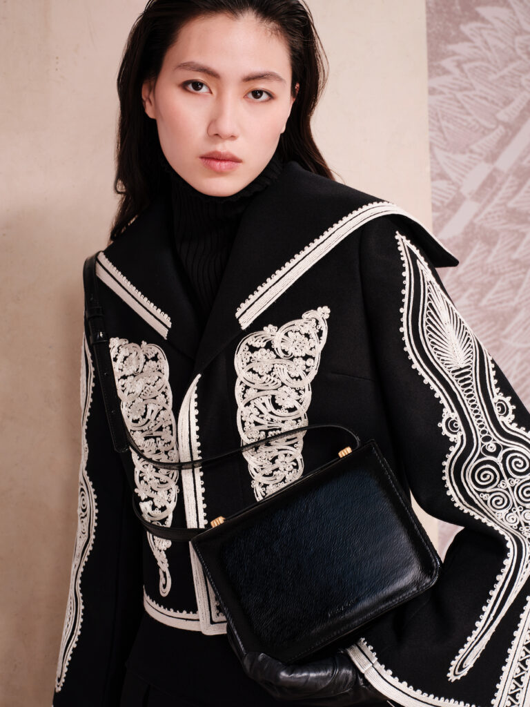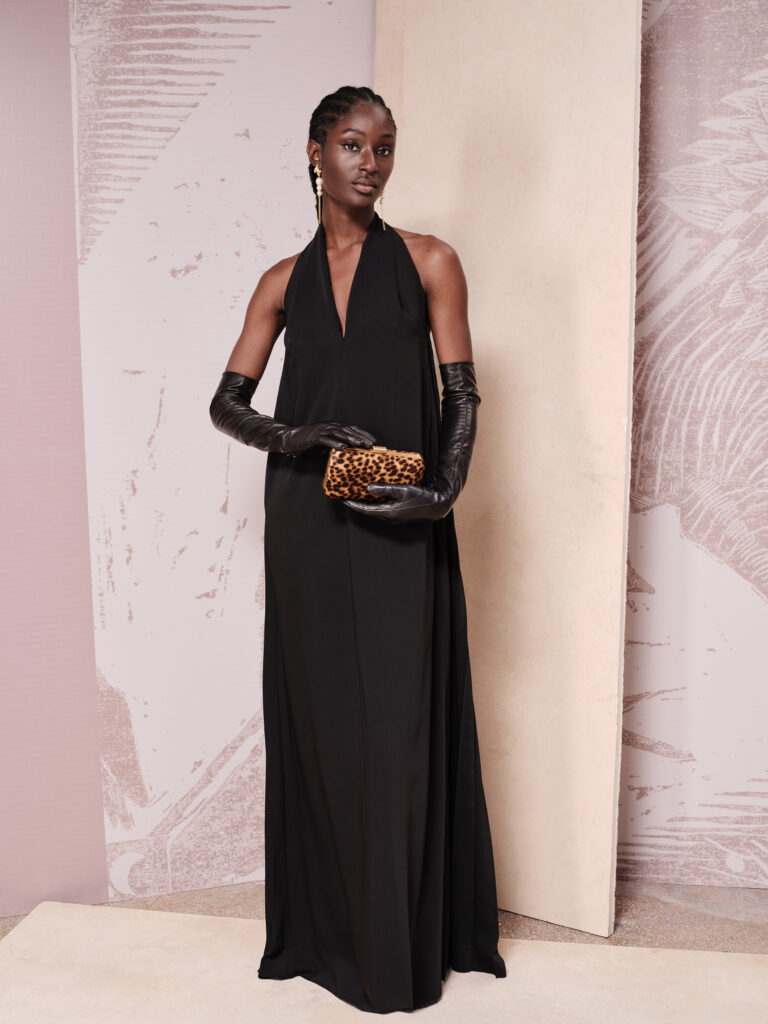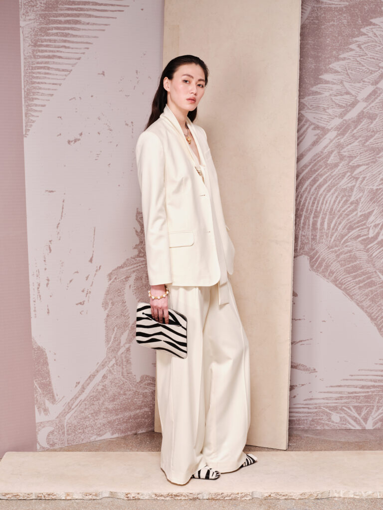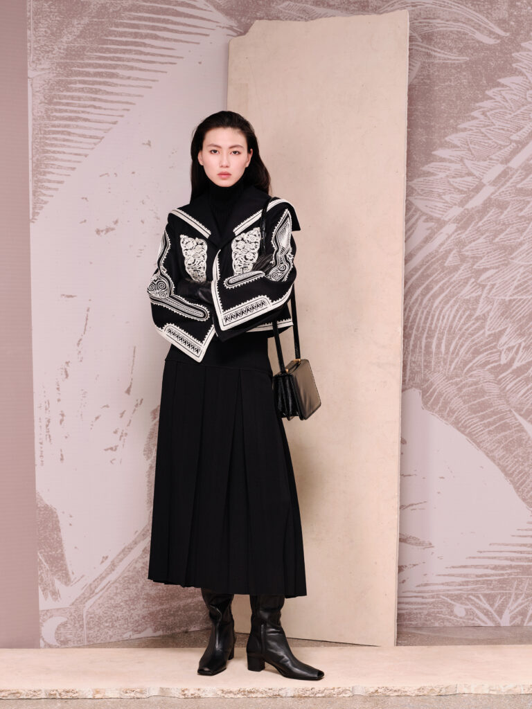 Les coupes se jouent des proportions : vestes sculpturales, drapés asymétriques, capes aux volumes mouvants, dessinant une allure à la fois structurée et instinctive. L’équilibre entre formes géométriques et fluidité rappelle cette idée d’un corps en transformation, évoluant entre rigidité et souplesse.