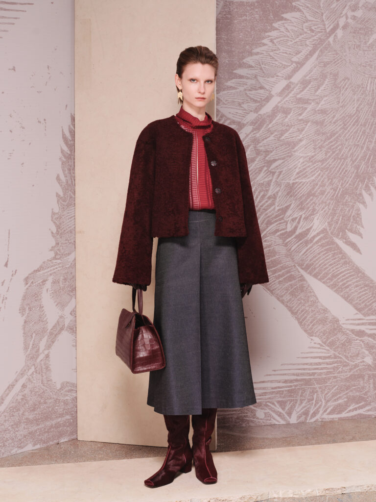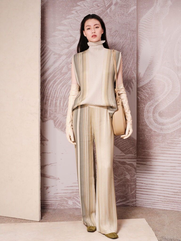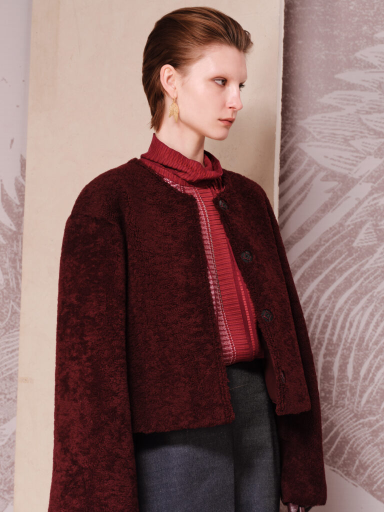 Le travail textile joue sur les contrastes : soie fluide aux reflets métalliques, laine scintillante, velours côtelé texturé et shearling durable créent un vestiaire luxueux et sensoriel, où chaque texture convoque une perception différente du mouvement. L’alliance de laine et de lin, subtilement travaillée pour évoquer le denim, incarne cette fusion entre passé et futur.