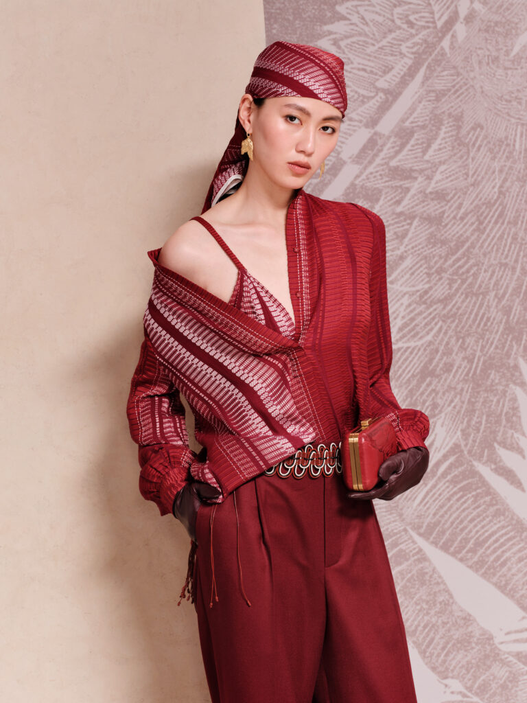 L’hybridation ne s’arrête pas aux coupes et aux matières. Marios Schwab ressuscite une technique ancestrale : la gravure sur bois appliquée sur la soie. Cette méthode, longtemps oubliée, permet d’imprimer la silhouette de la Chimère d’Arezzo sur certaines pièces phares de la collection, donnant à la soie signature spathoto une dimension presque talismanique.
