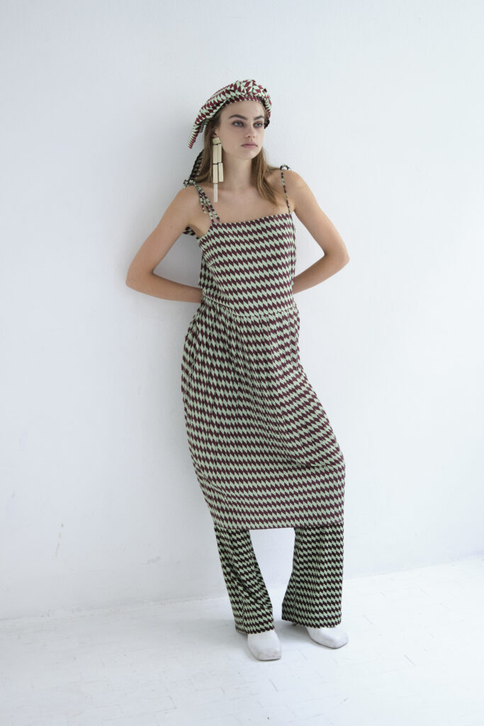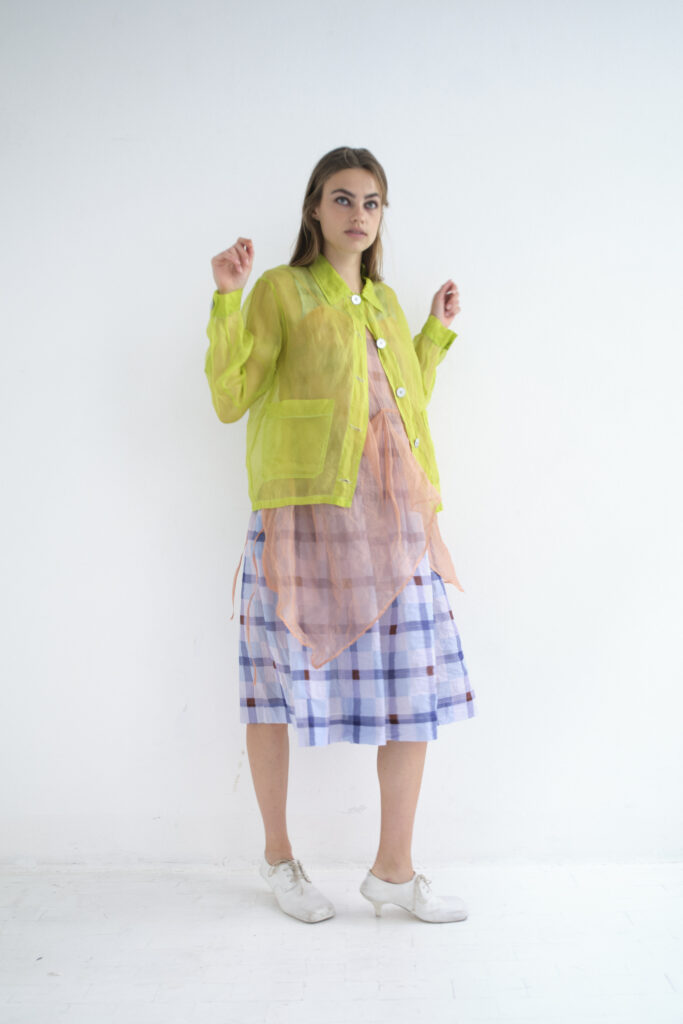 • Motifs classiques comme le vichy et le chevron, revisités grâce à la transparence du tulle, du coton mousseline froissé et des plis superposés.