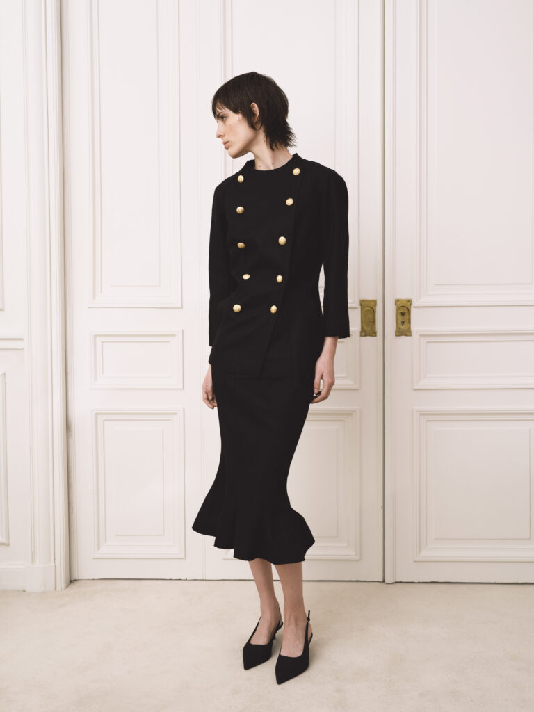 Chez Junko Shimada, le tailleur est un manifeste, une seconde peau qui insuffle une allure affûtée et aérienne. La jupe tulipe et la veste peplum redessinent une féminité affranchie, donnant aux femmes un port altier, un mouvement de plumes invisibles qui fait d’elles des créatures insaisissables.