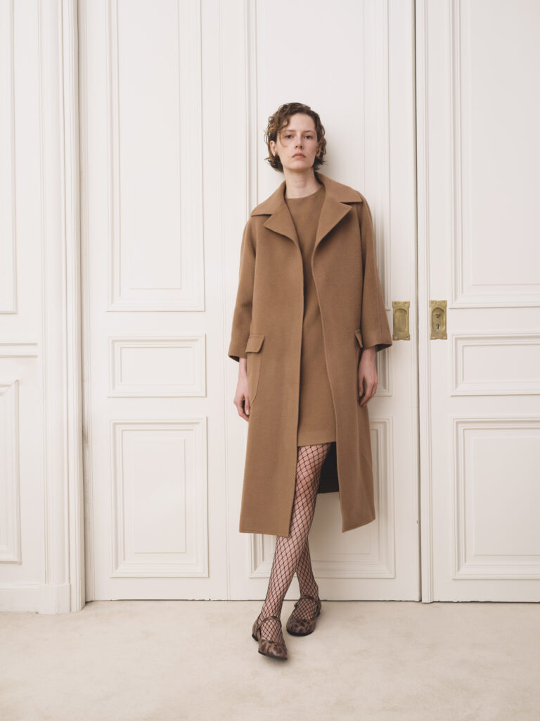 - Des mailles tartan en alpaga se fondent dans un dégradé de beiges et de camels, évoquant une transition subtile entre la ville et la nature domptée.