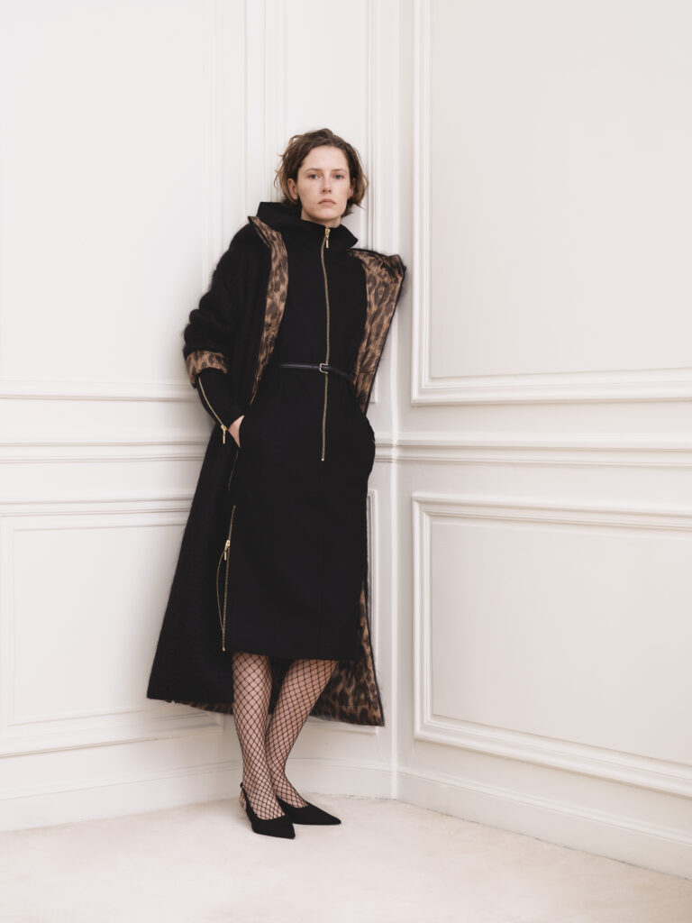 Ce motif fauve s’impose en fil rouge, s’enroulant autour d’une jupe matelassée, fusionnant avec un blouson oversize ou s’étirant en un manteau doublé de mohair noir, tel un camouflage félin prêt à bondir dans l’effervescence nocturne de la ville.