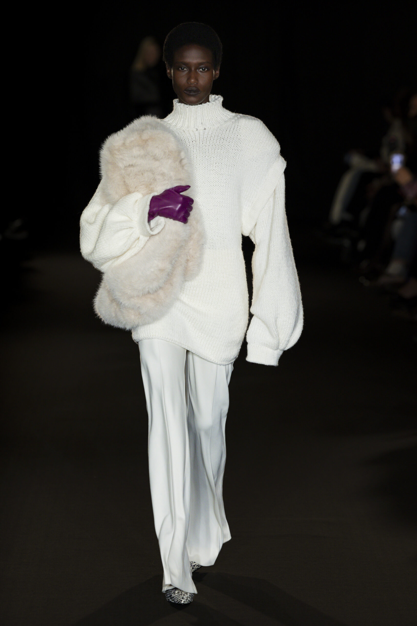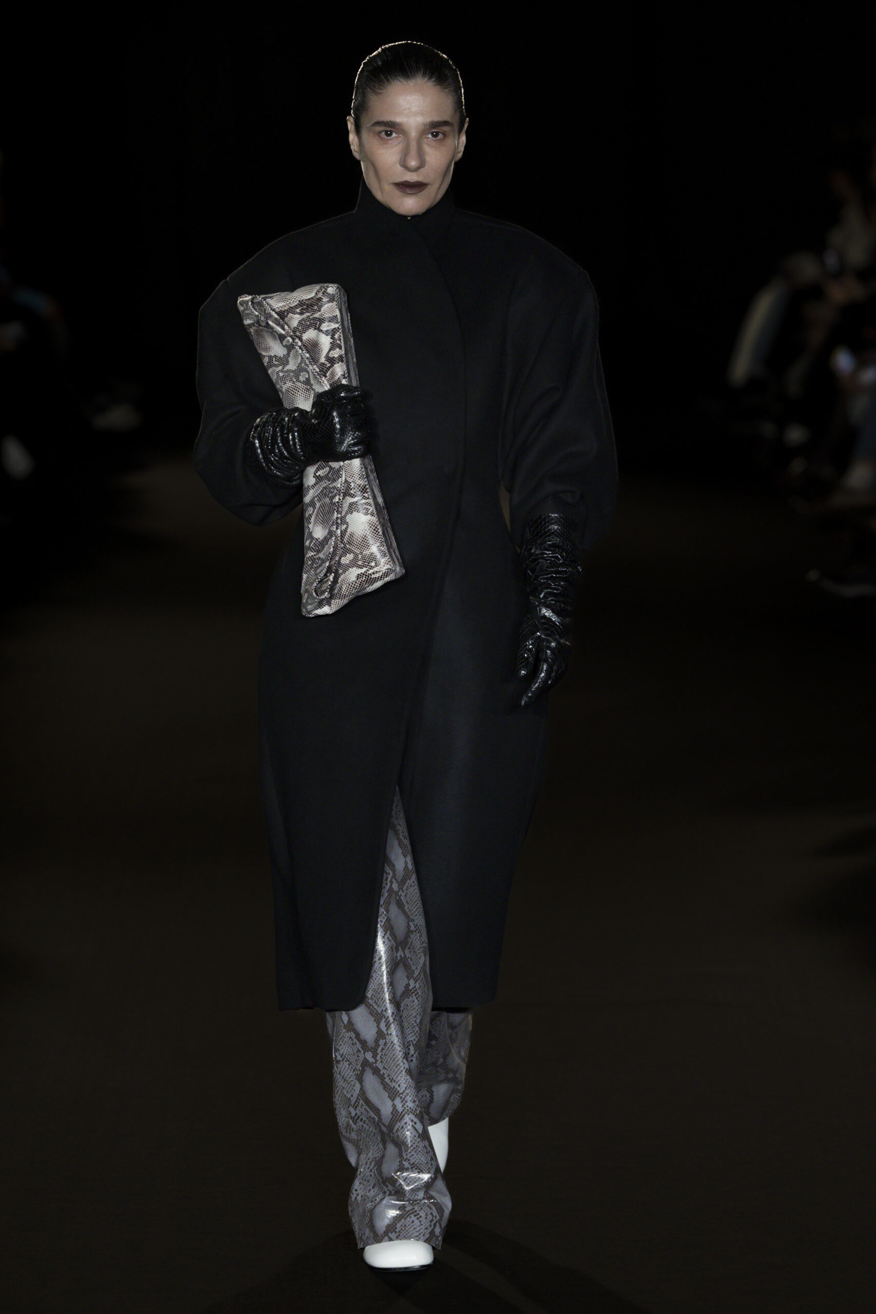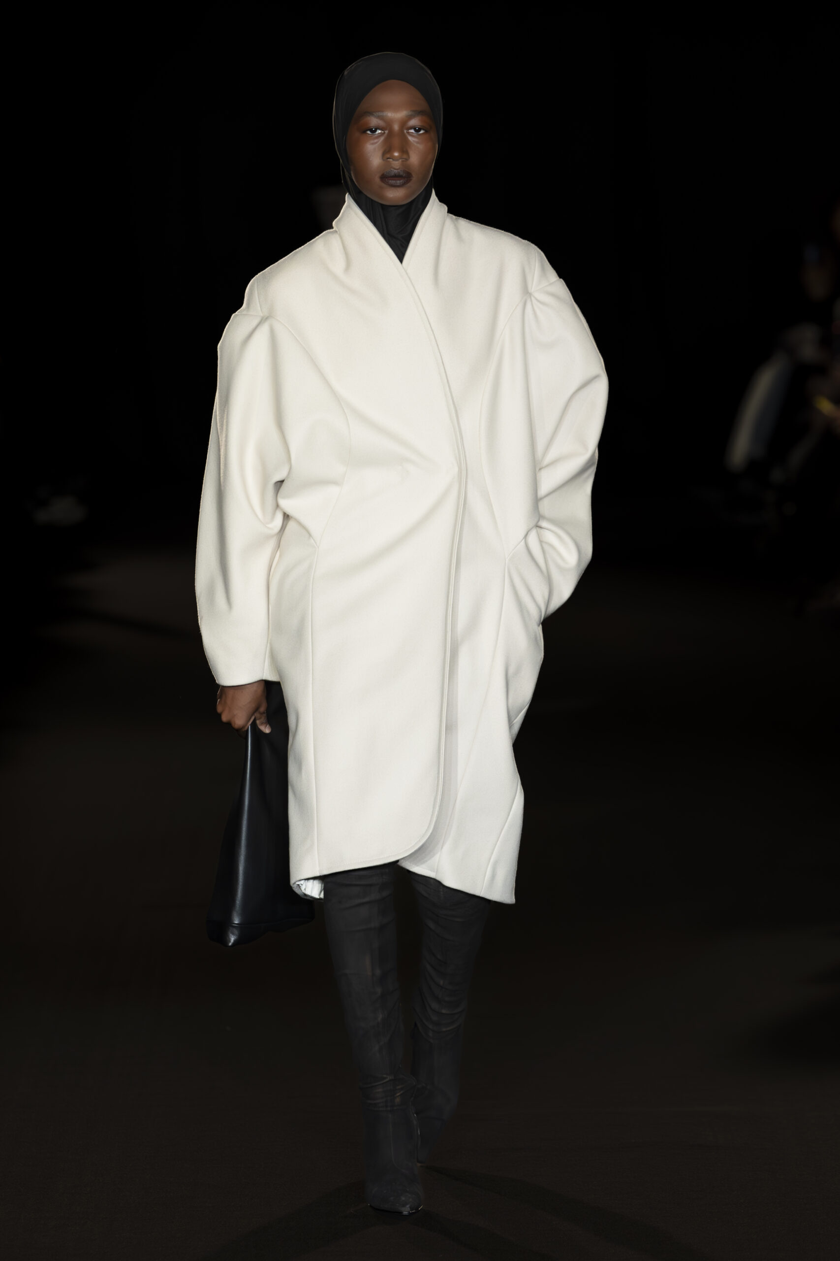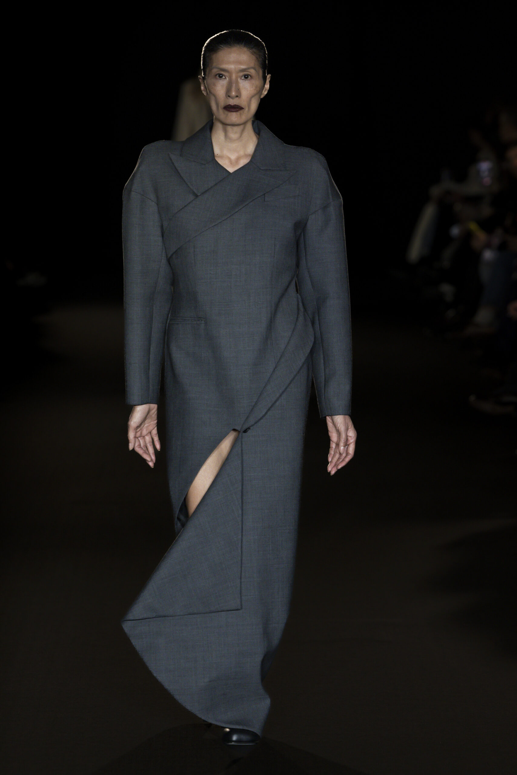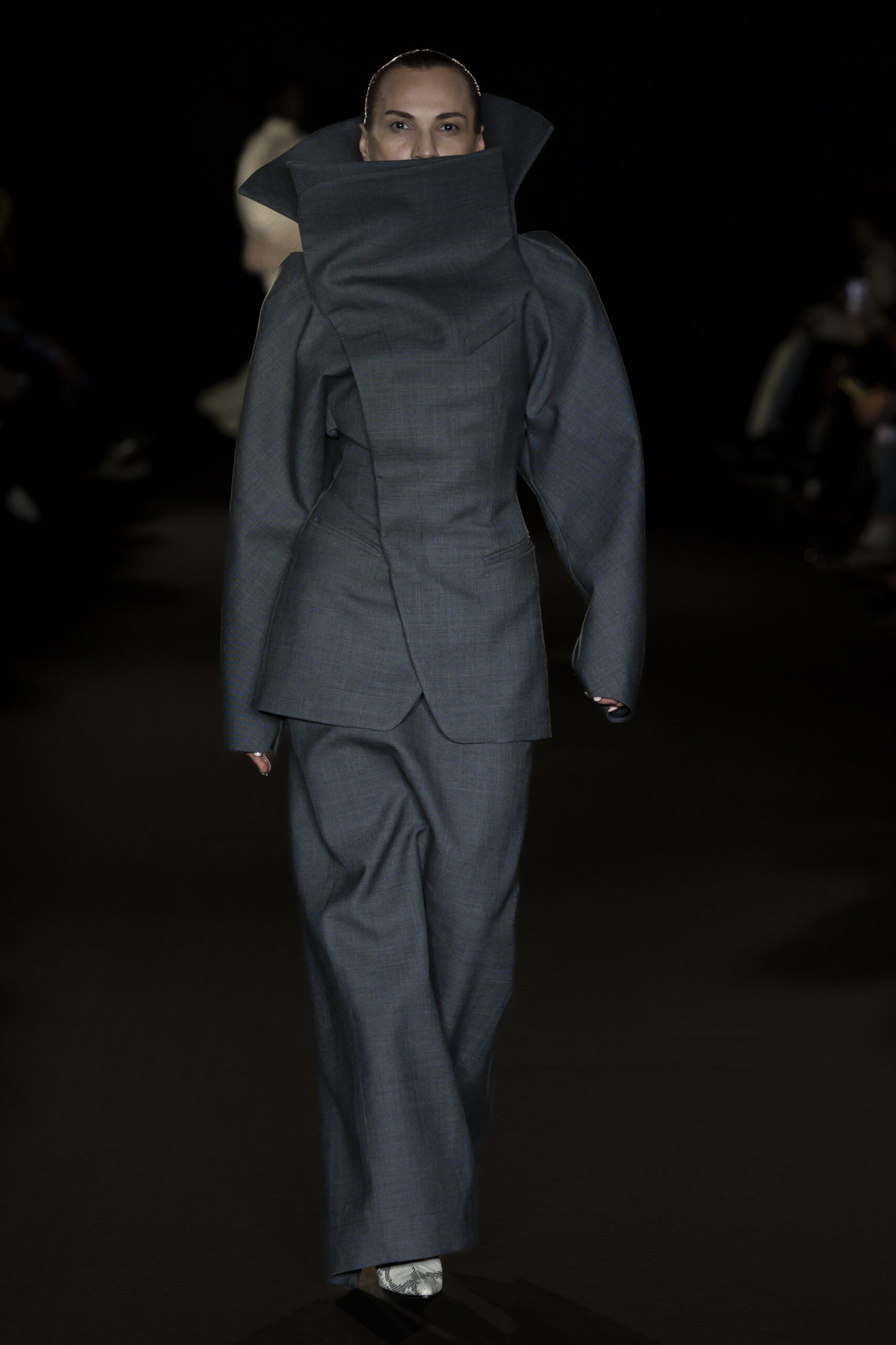 • Le cachemire et la laine adoucissent l’ensemble, drapés dans des volumes amples, contrastant avec la rigidité du tailoring.
