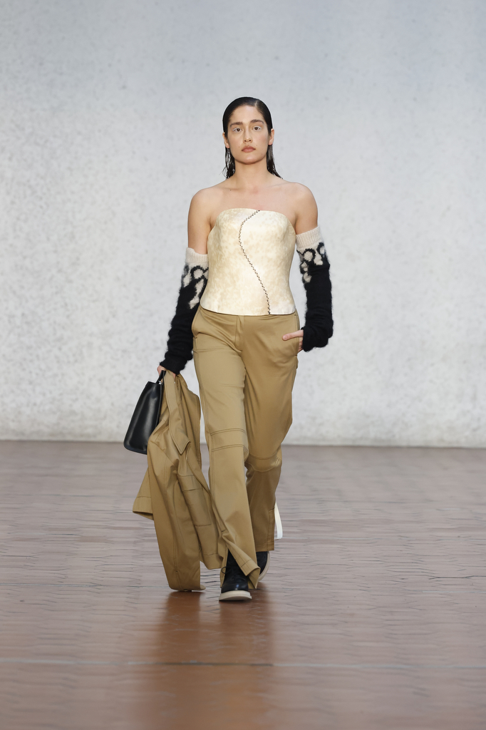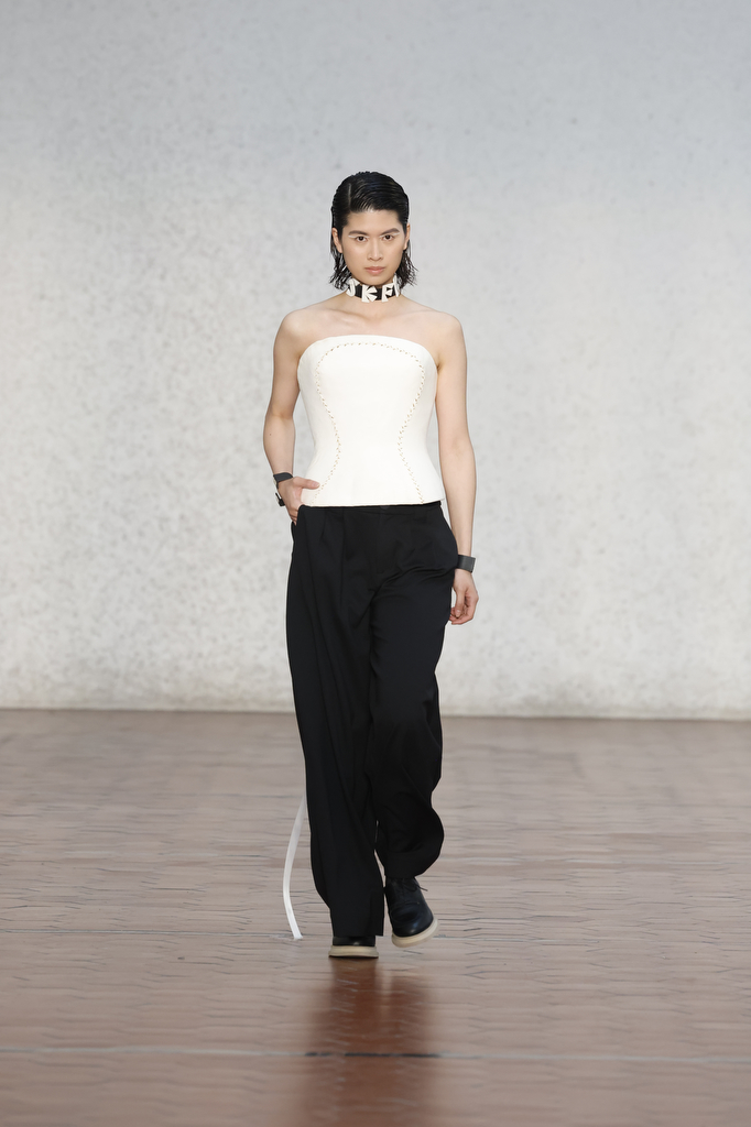- Des bustiers sculptés à partir de véritables fragments de pelotes basques recyclées, transformant un objet du sport en élément de design avant-gardiste.