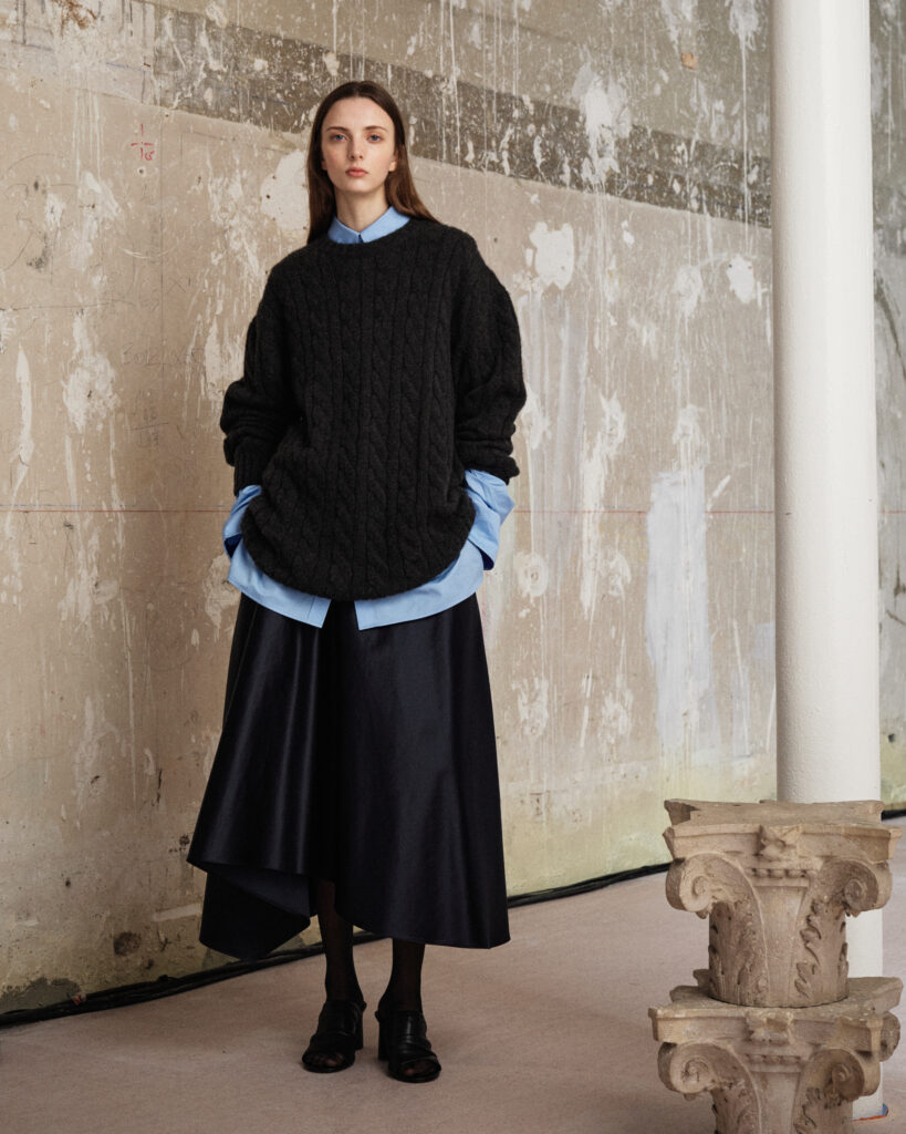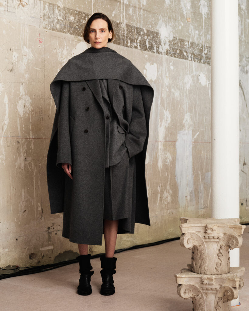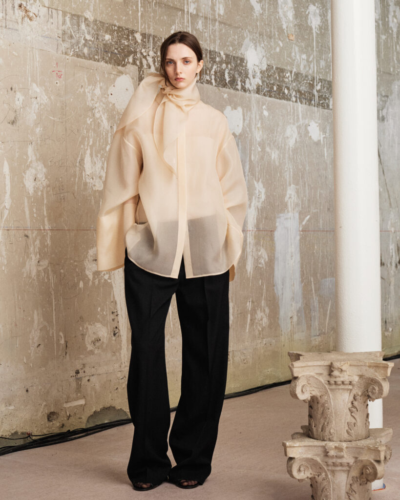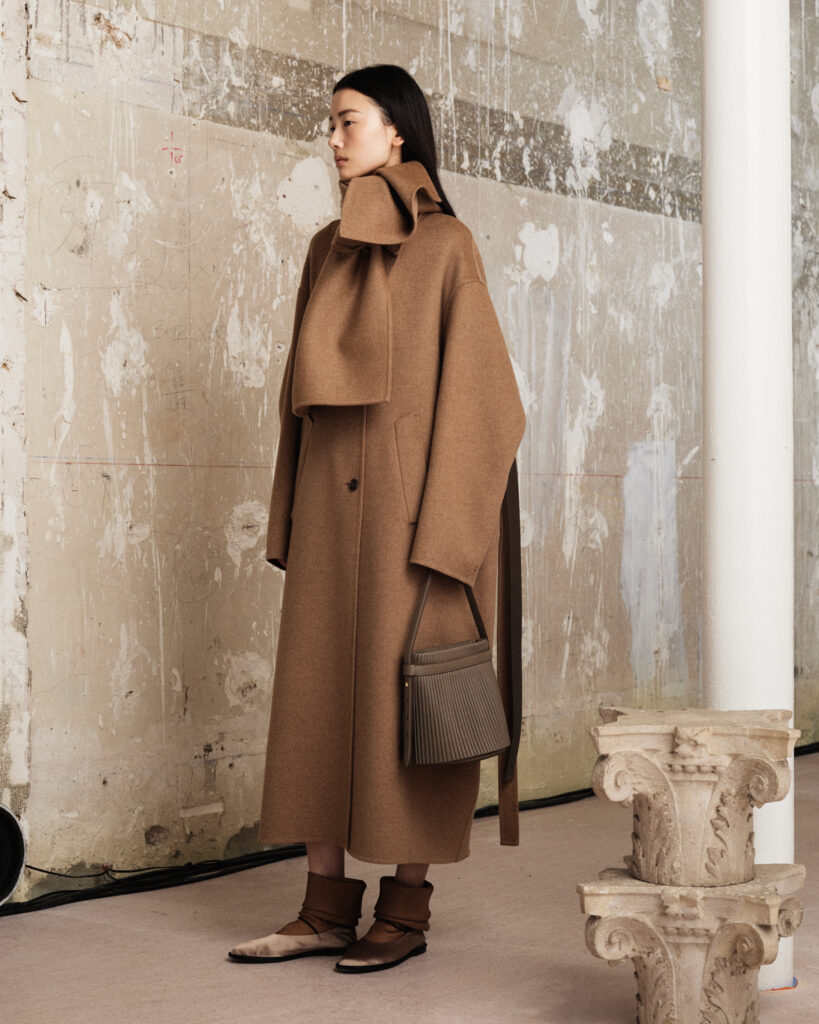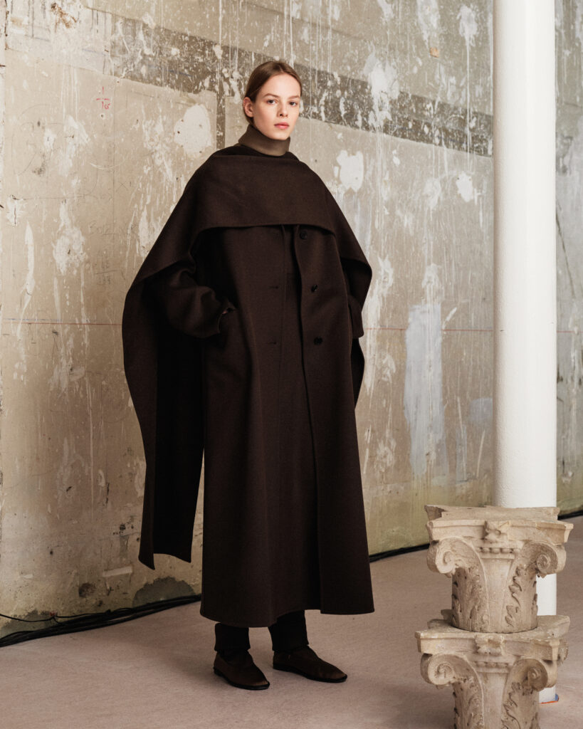 La mise en scène de la collection reproduit un intérieur épuré et chaleureux, où les vêtements prennent vie dans un univers de poésie et de sérénité.