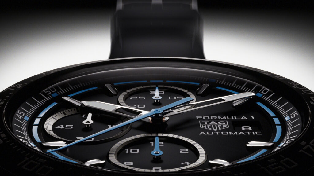 Détails ergonomiques : Index et aiguilles inspirés des lignes aérodynamiques, surmontés de Super-LumiNova® pour une lisibilité optimale.