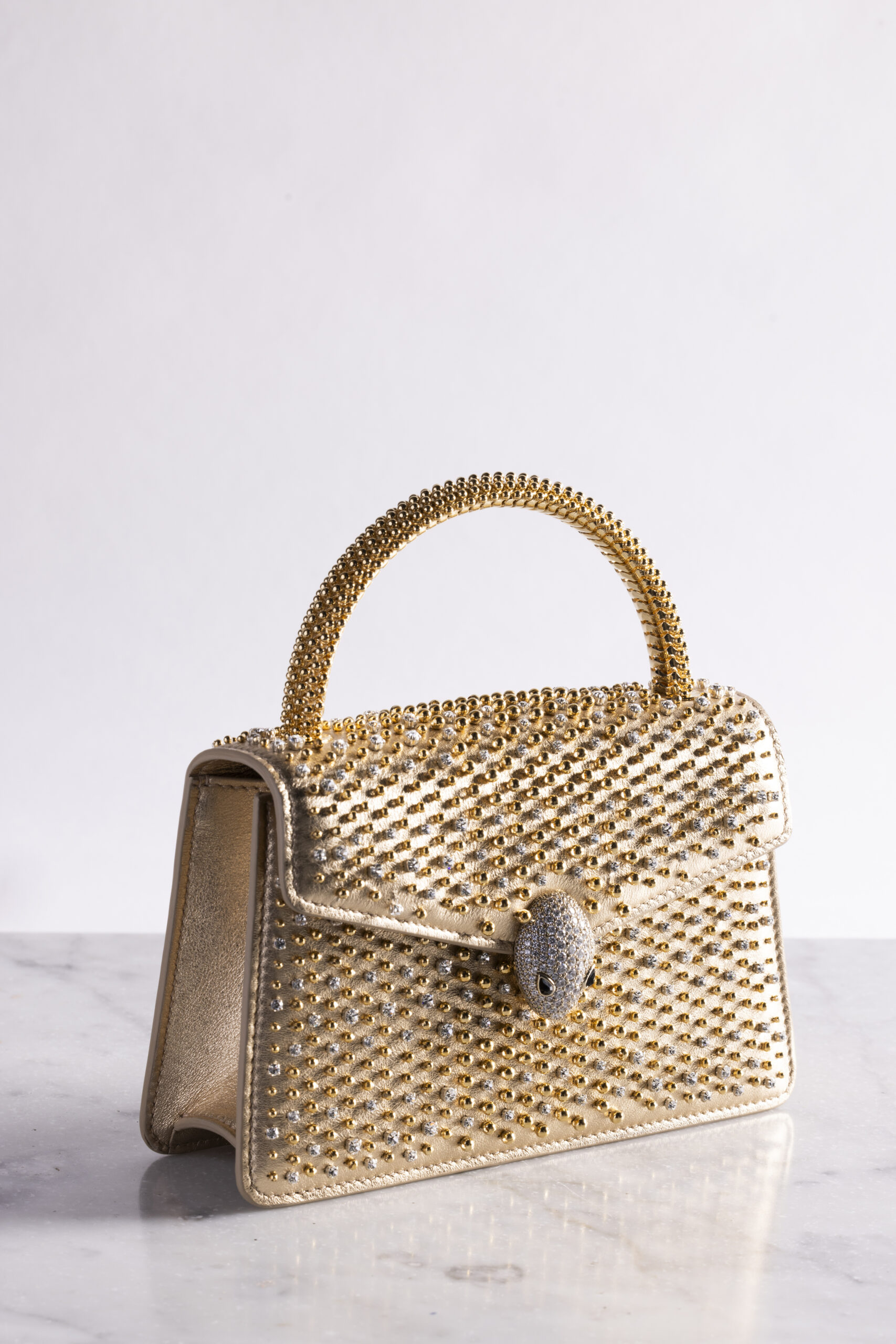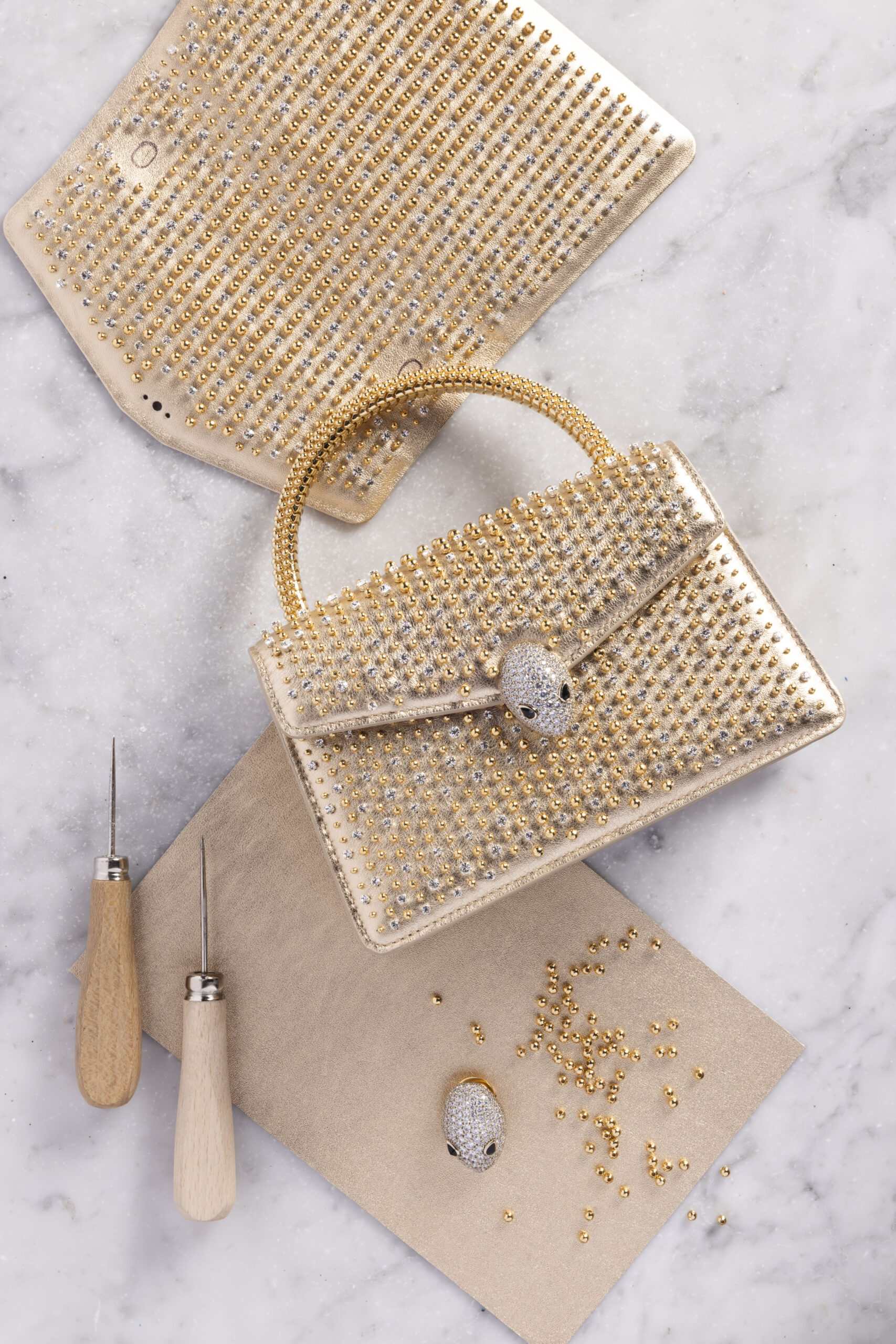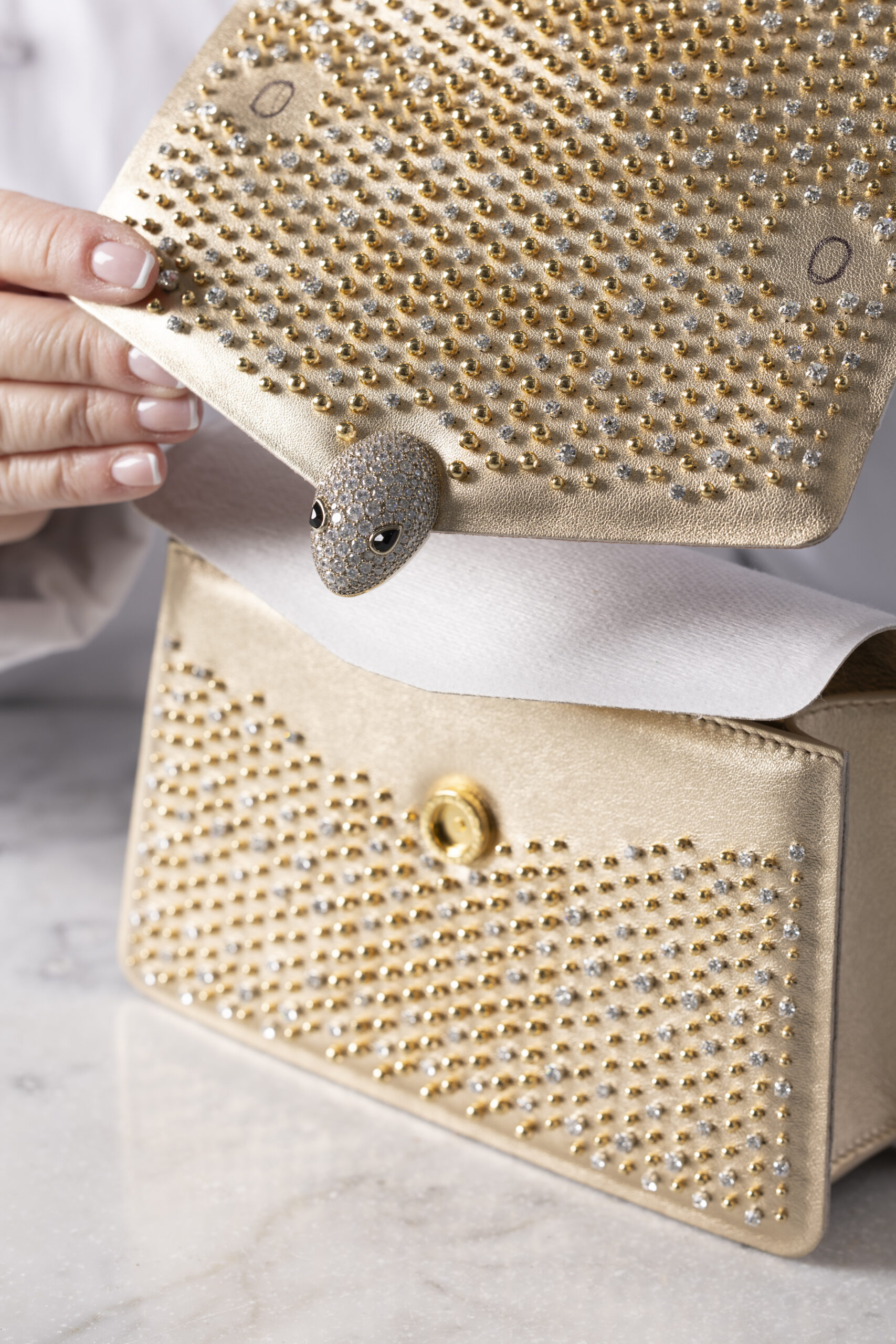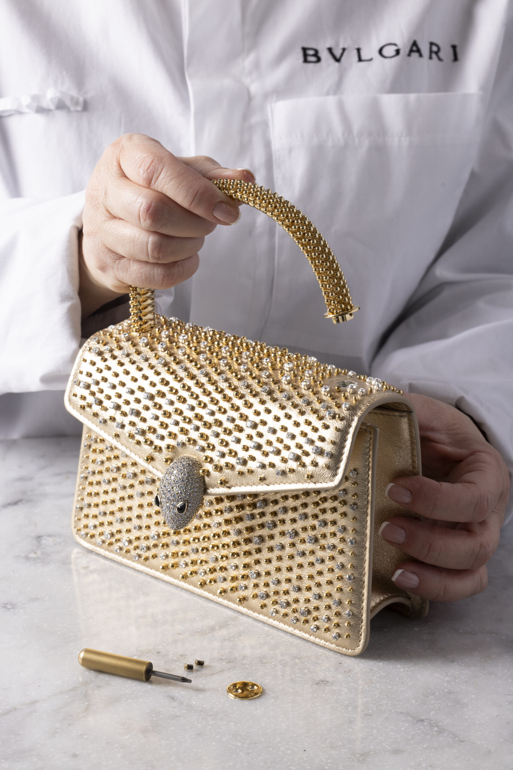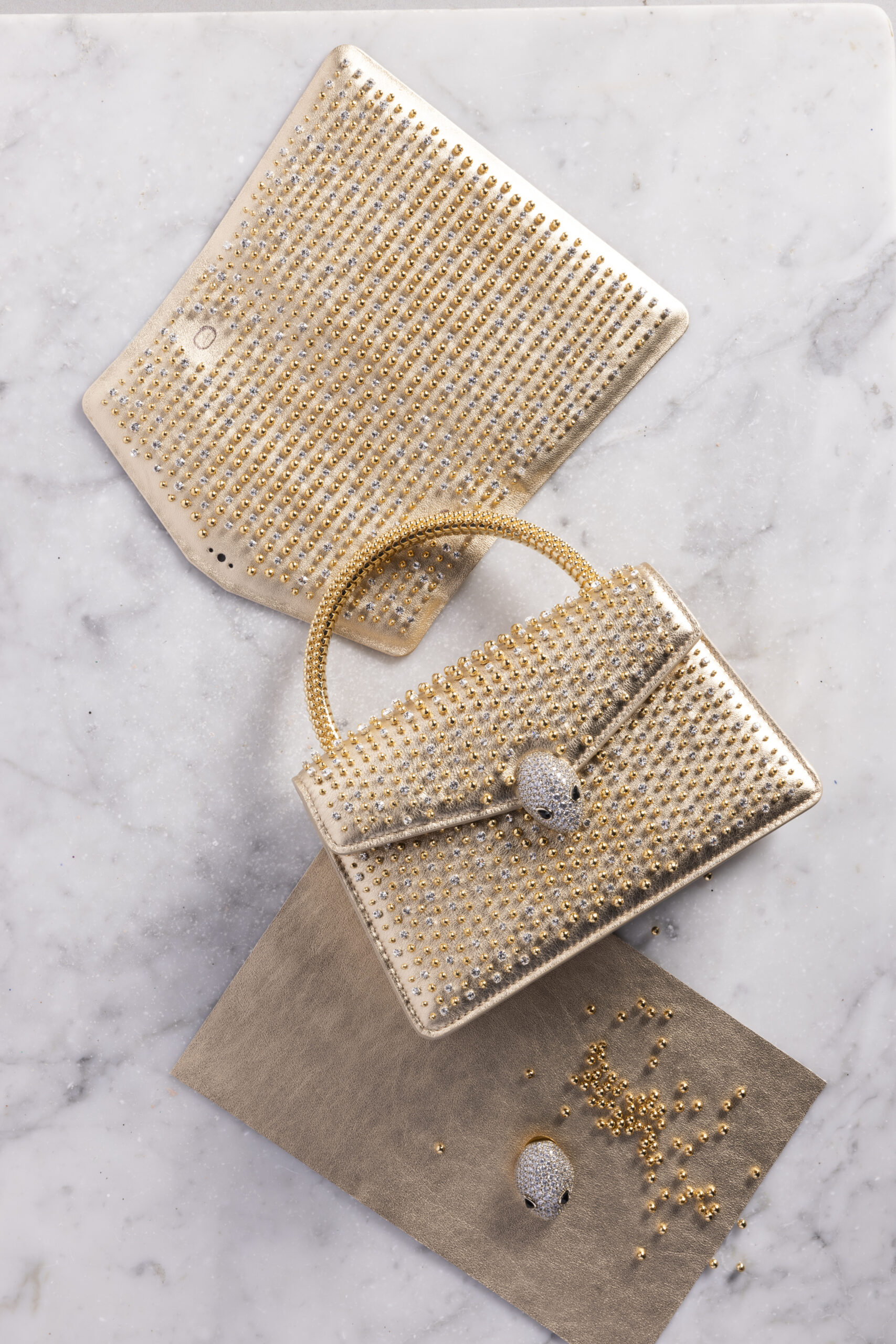 Le sac Serpenti Pallini, quant à lui, est un chef-d’œuvre de savoir-faire. La poignée exclusive, composée de 55 éléments métalliques ornés de billes assemblées à la main, crée une impression de mouvement unique. Le corps du sac en cuir de veau doré Liquid Metal est recouvert de près de 1260 perles et pierres coniques plaquées or, entièrement brodées à la main, témoignant de l’expertise artisanale de Bvlgari.