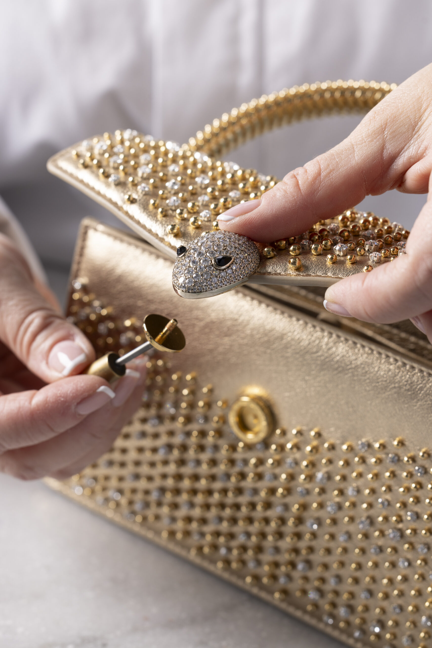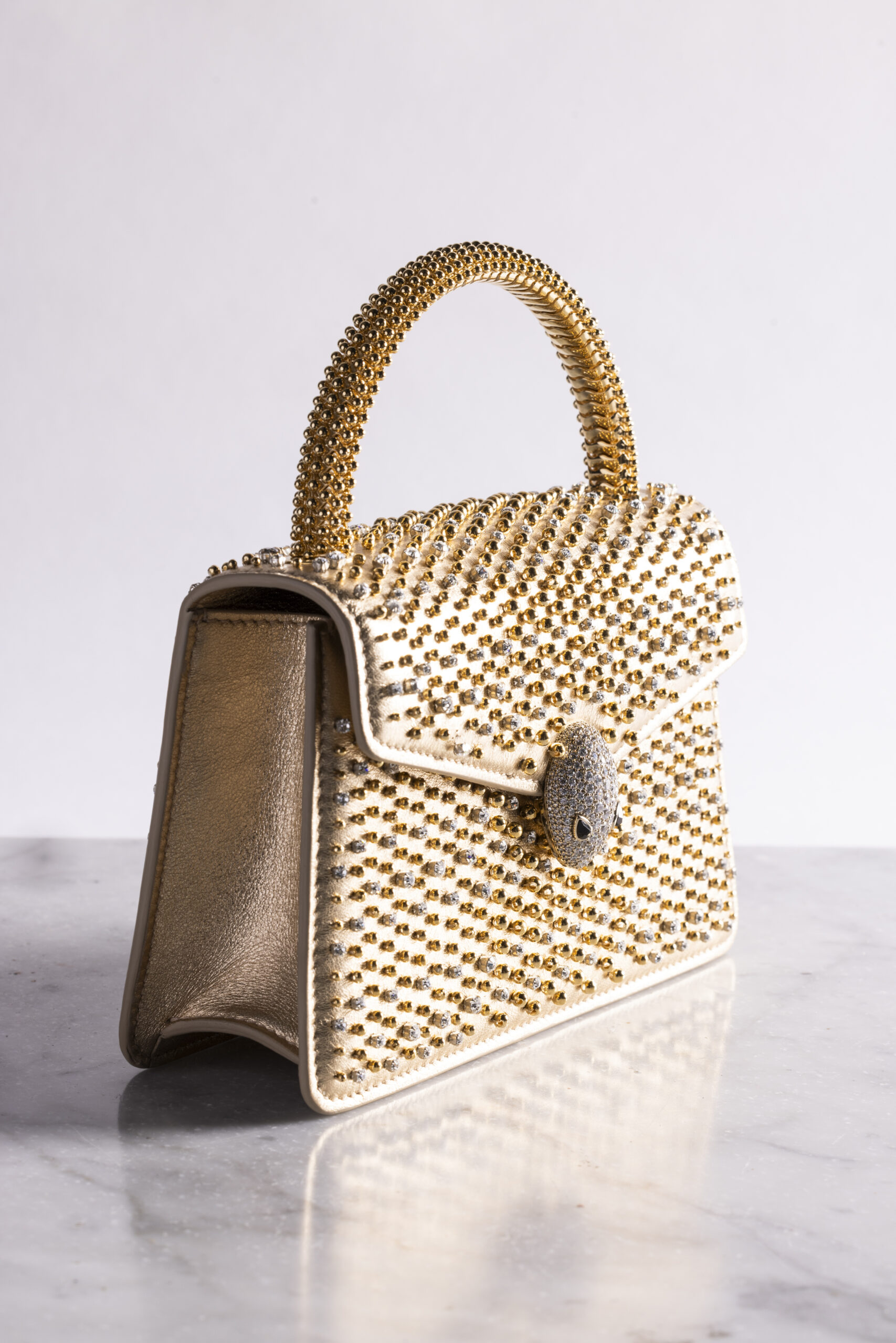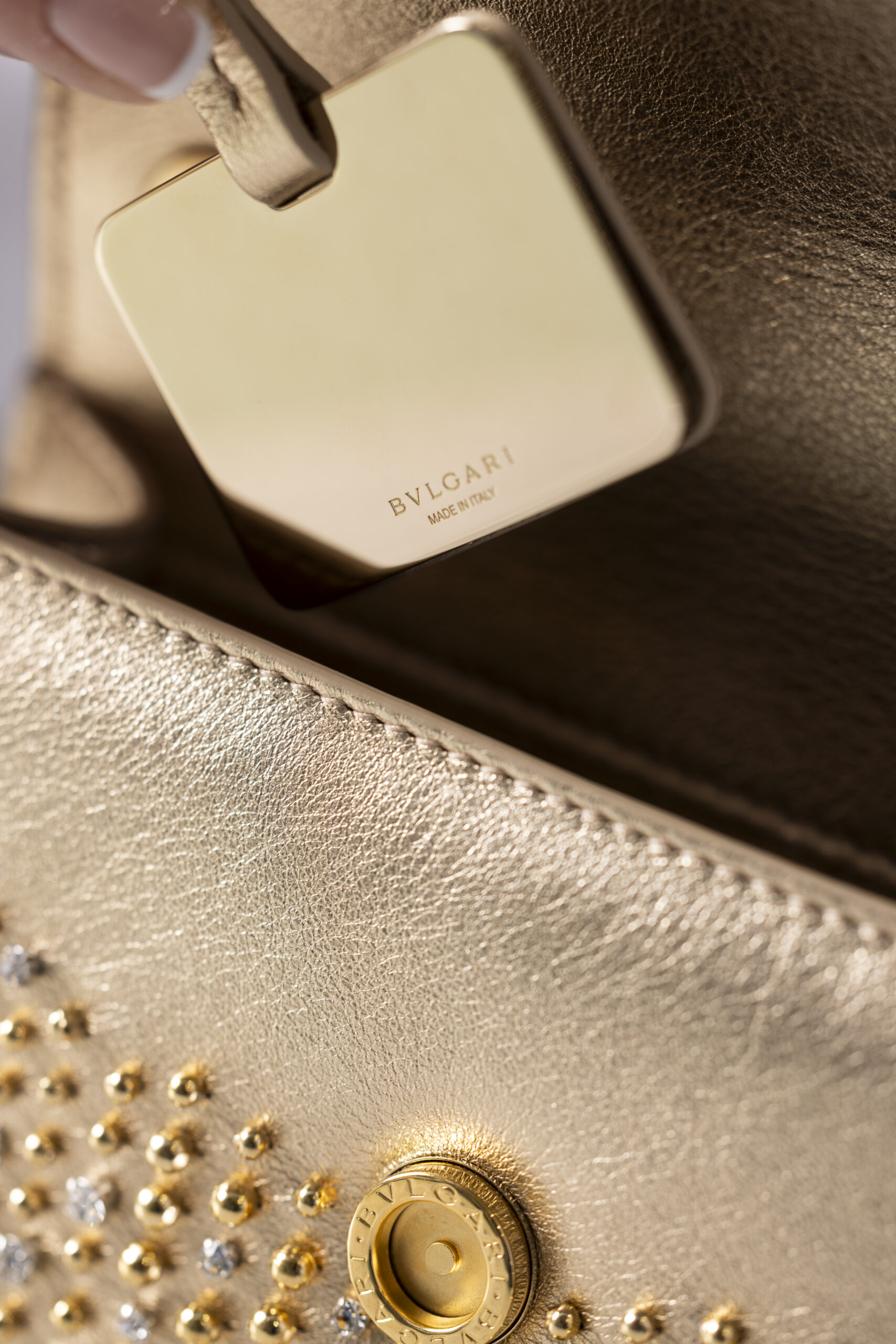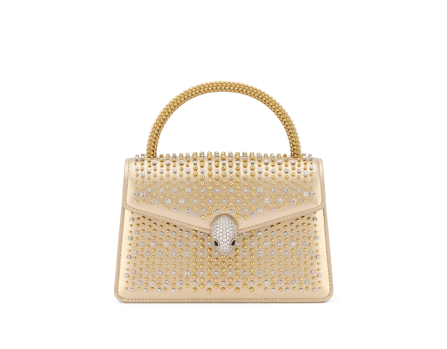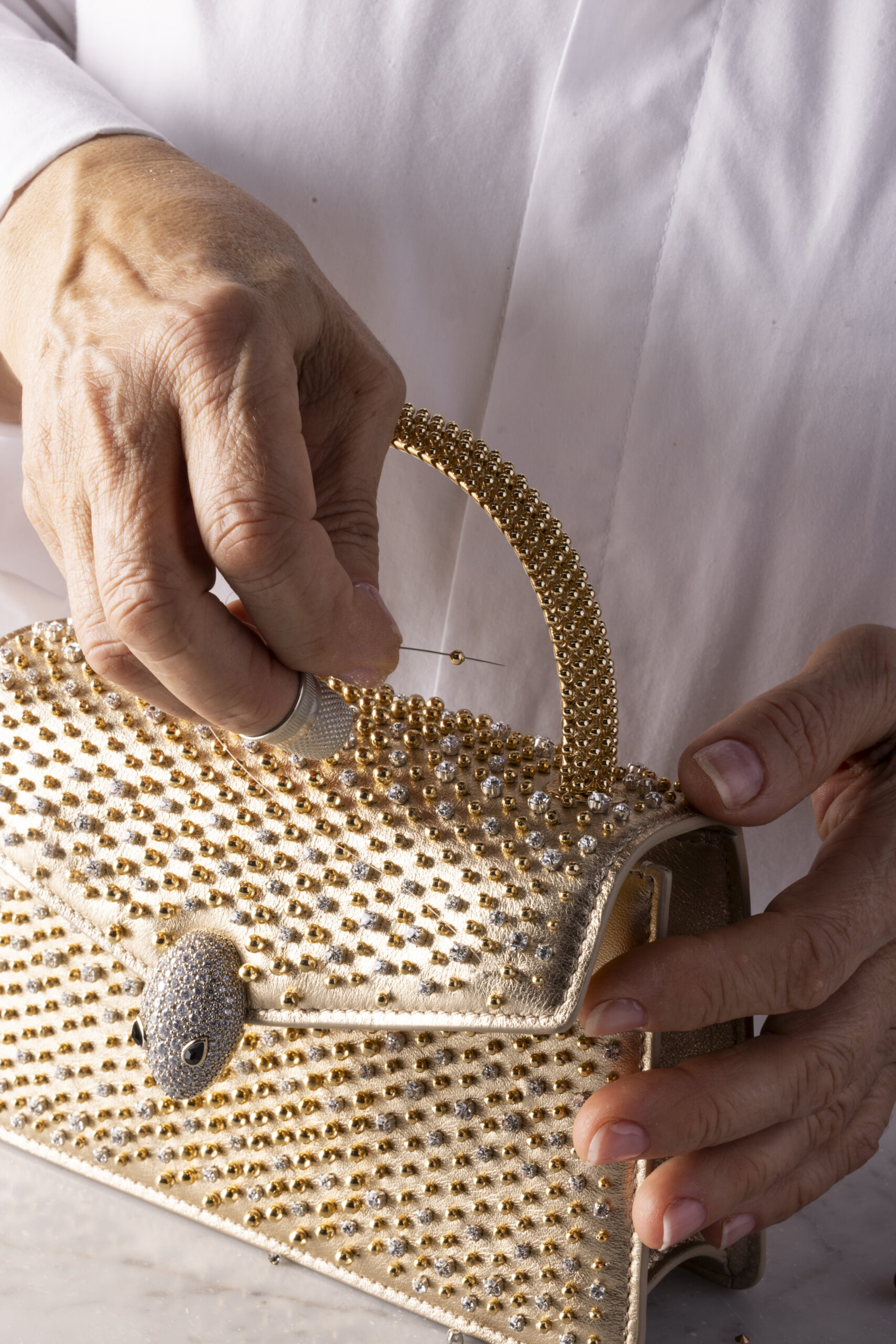 Le sac Serpenti Pallini, quant à lui, est un chef-d’œuvre de savoir-faire. La poignée exclusive, composée de 55 éléments métalliques ornés de billes assemblées à la main, crée une impression de mouvement unique. Le corps du sac en cuir de veau doré Liquid Metal est recouvert de près de 1260 perles et pierres coniques plaquées or, entièrement brodées à la main, témoignant de l’expertise artisanale de Bvlgari.
