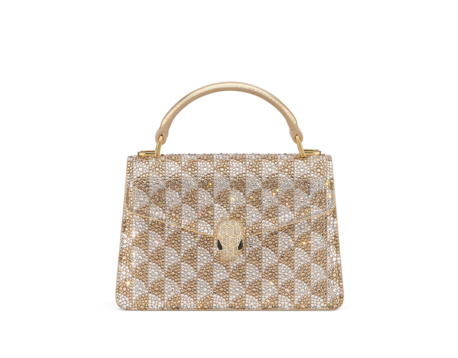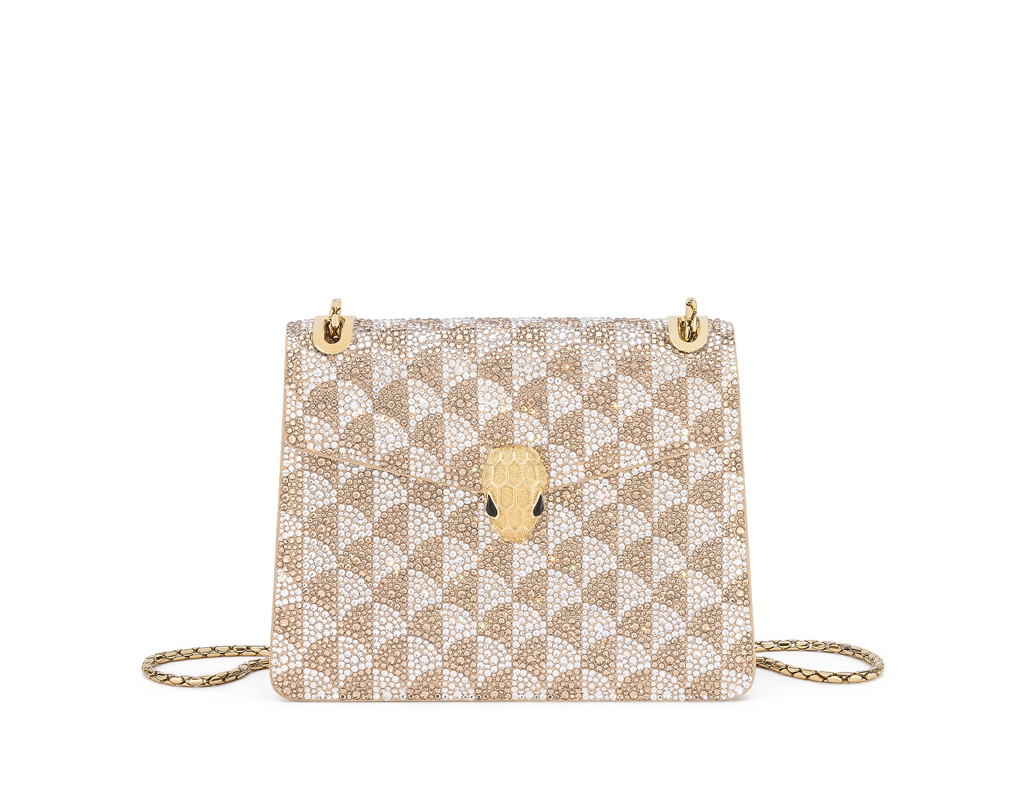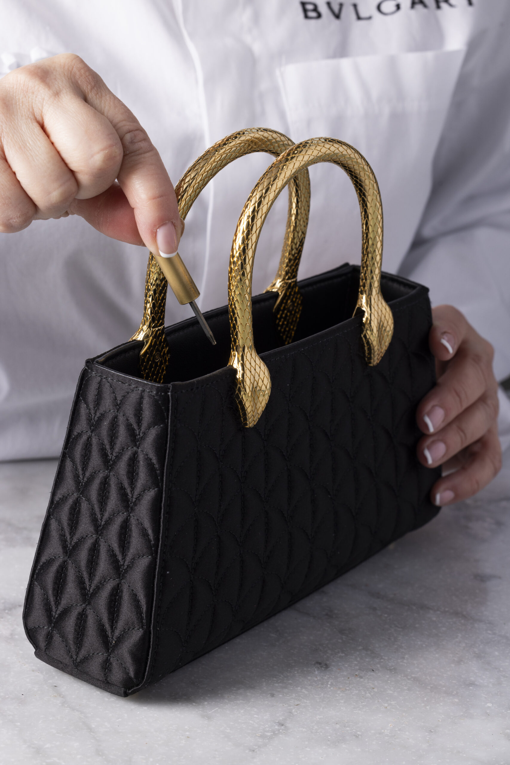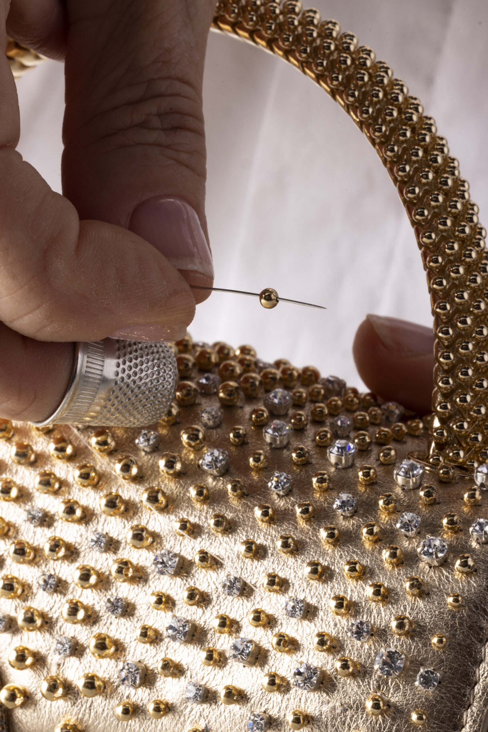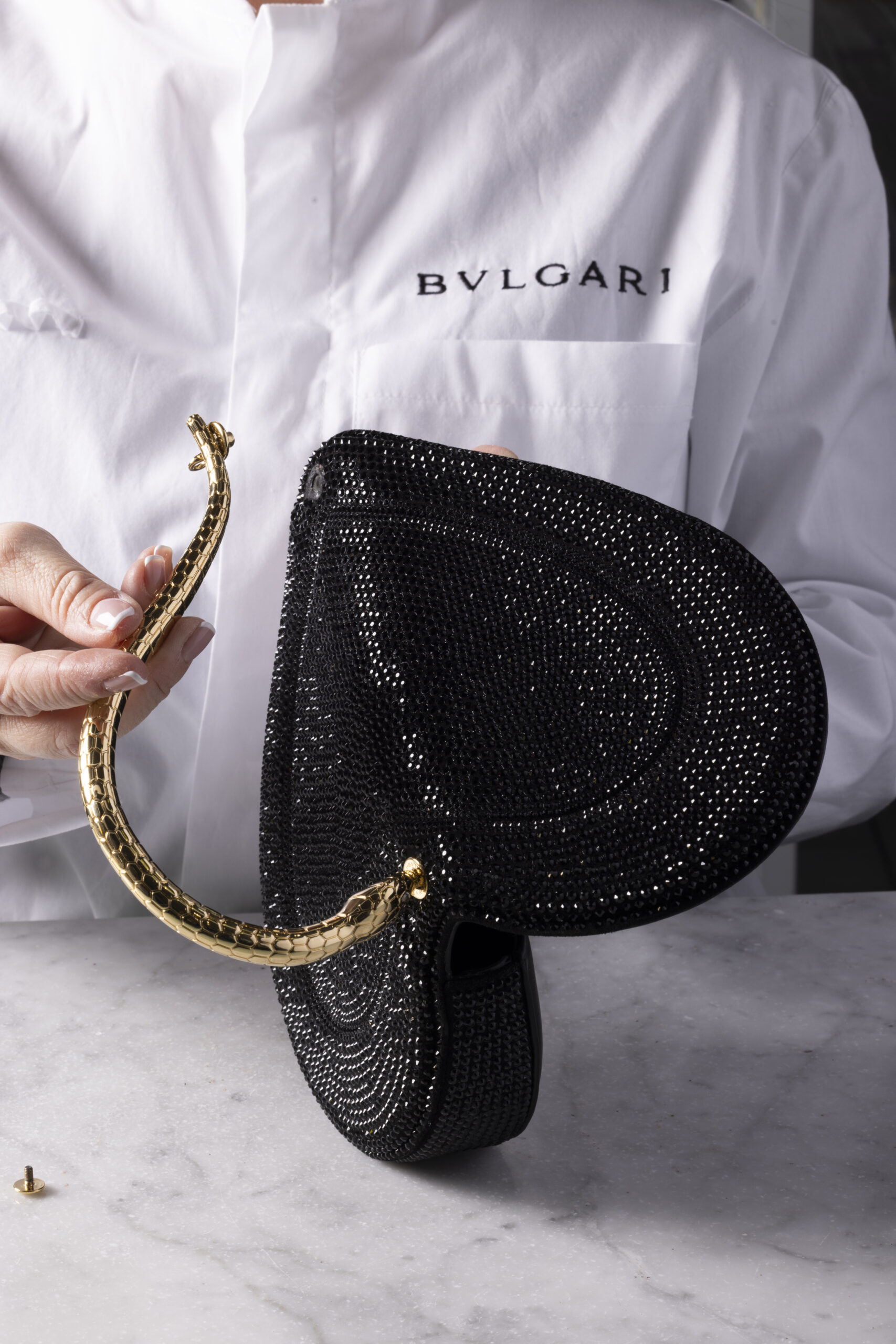 Le sac Serpenti Pallini, quant à lui, est un chef-d’œuvre de savoir-faire. La poignée exclusive, composée de 55 éléments métalliques ornés de billes assemblées à la main, crée une impression de mouvement unique. Le corps du sac en cuir de veau doré Liquid Metal est recouvert de près de 1260 perles et pierres coniques plaquées or, entièrement brodées à la main, témoignant de l’expertise artisanale de Bvlgari.