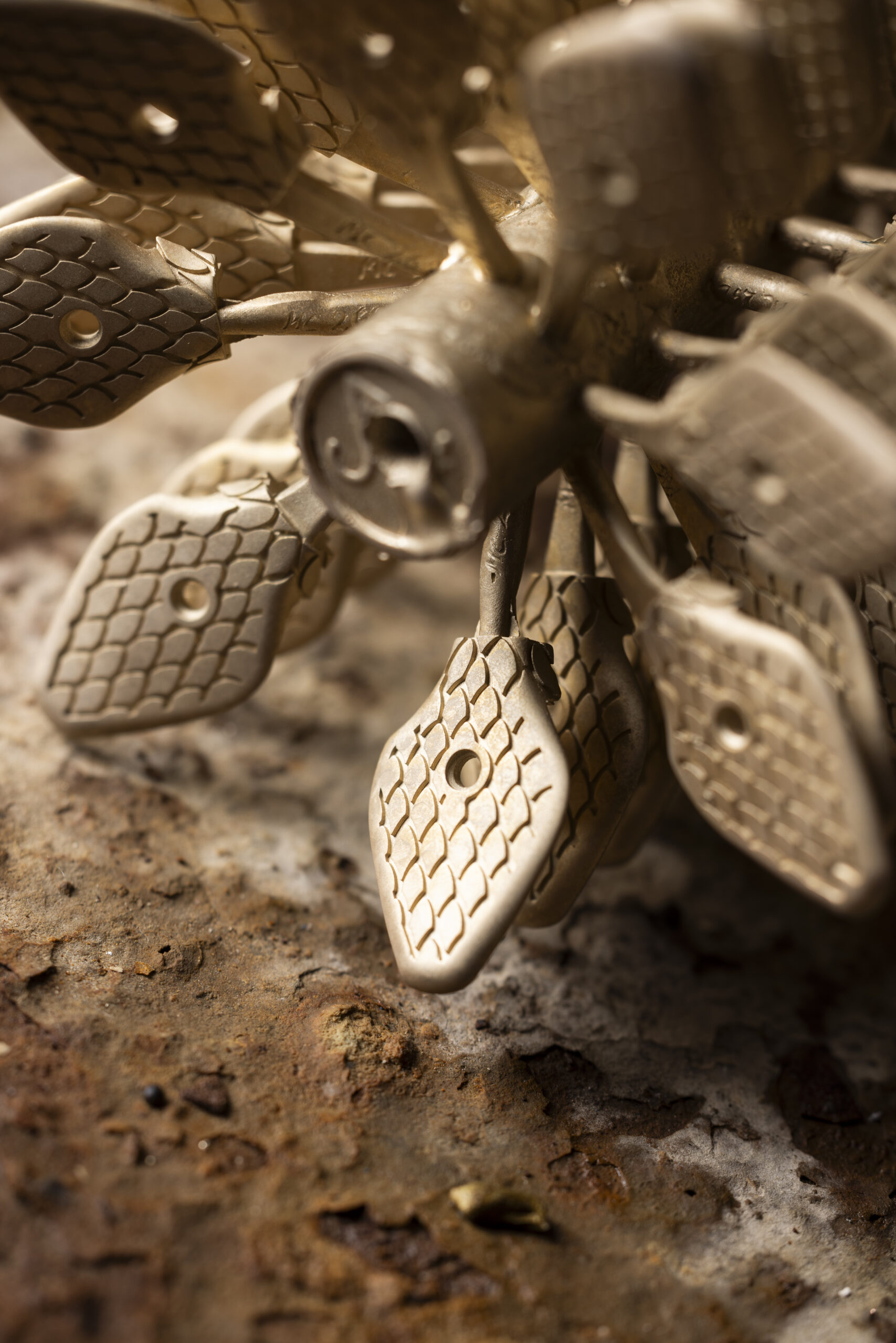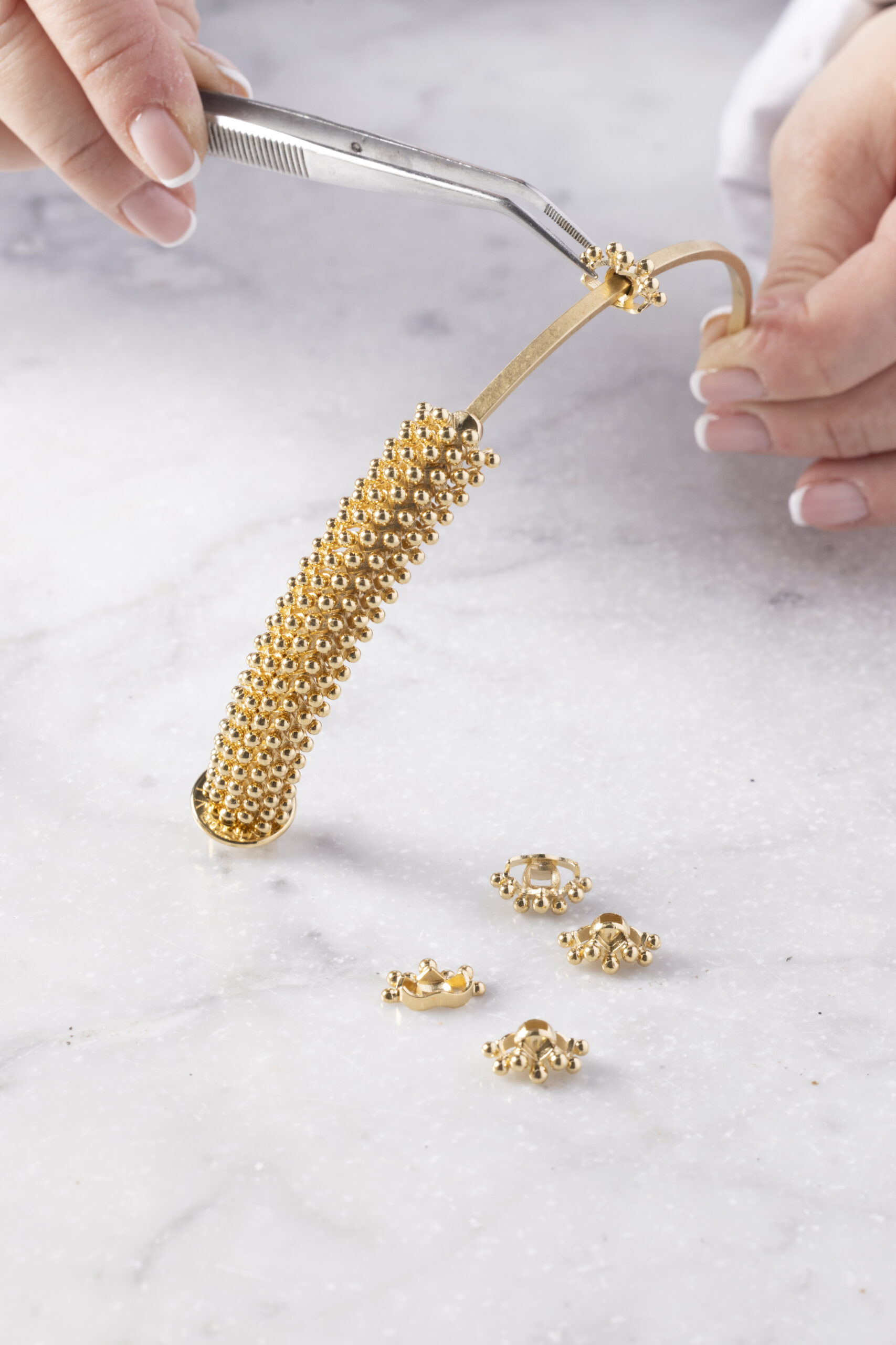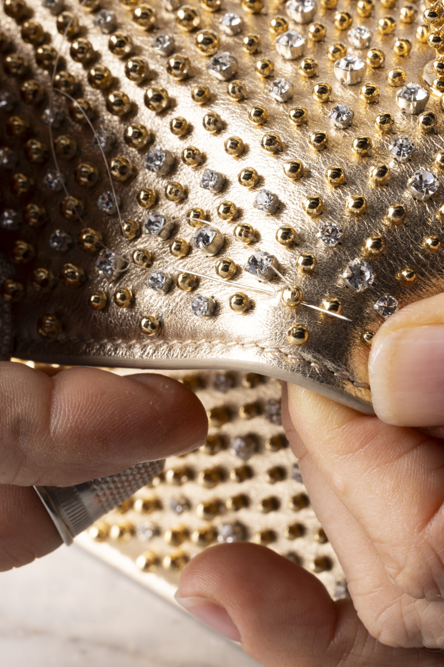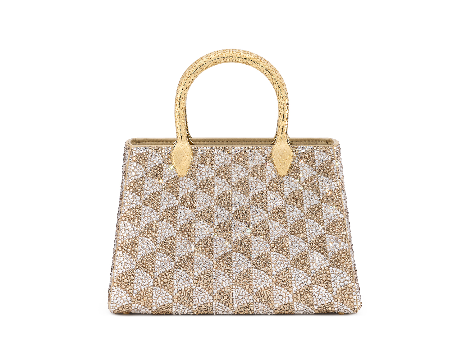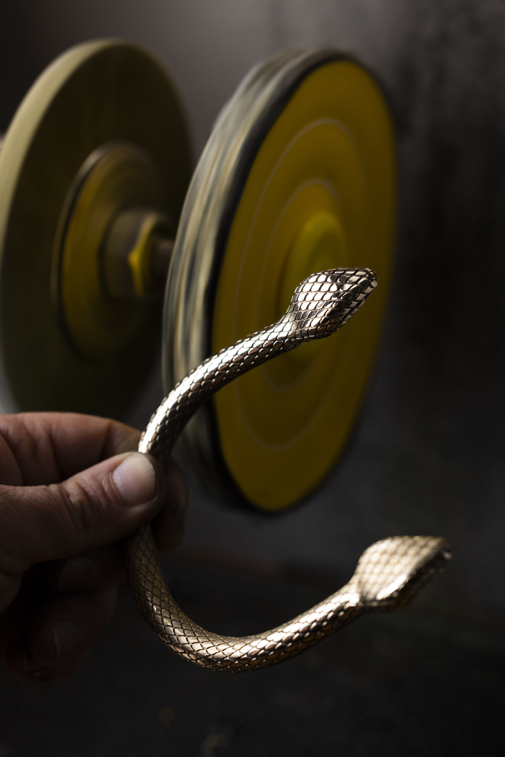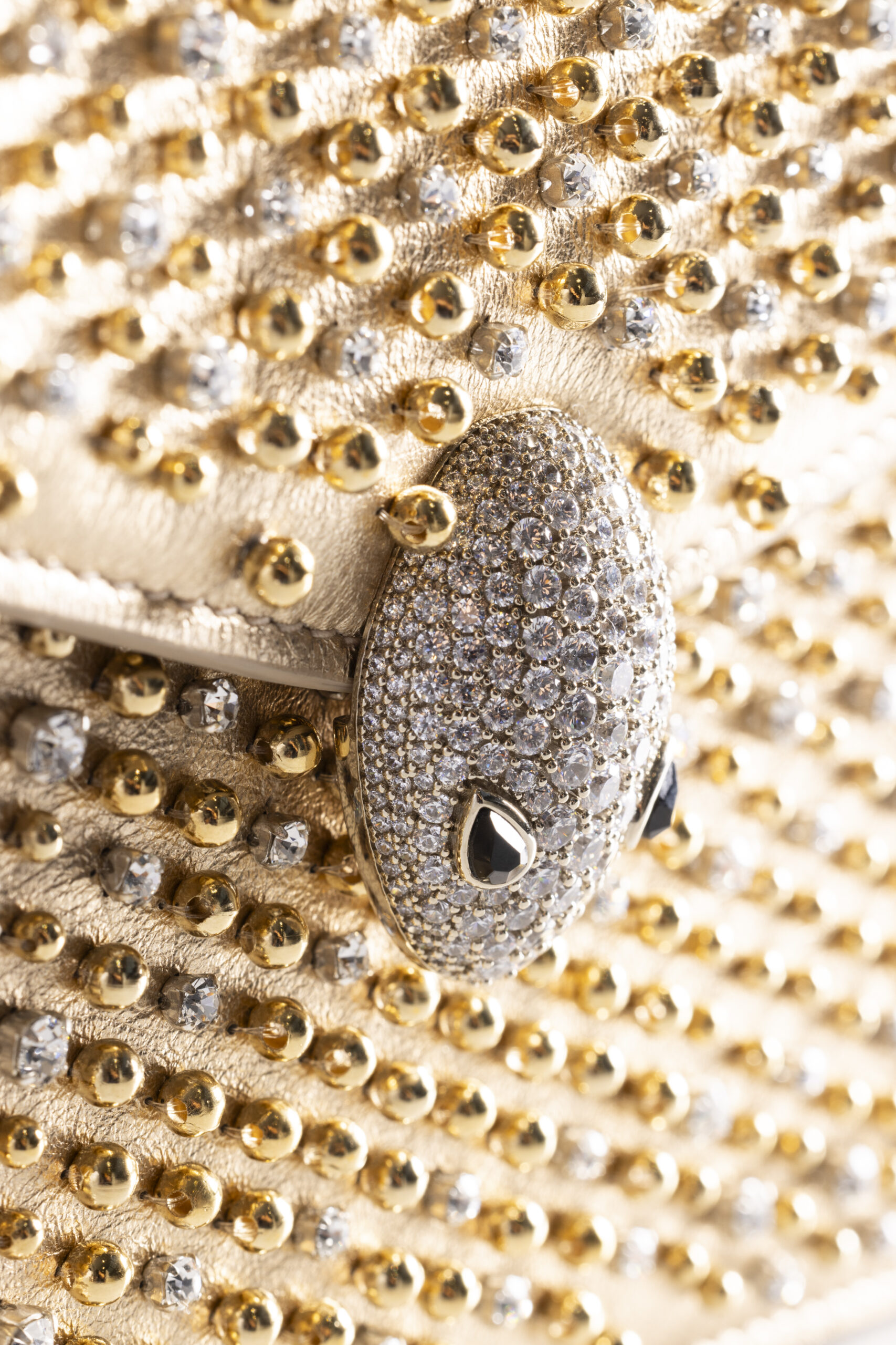 Le sac Serpenti Pallini, quant à lui, est un chef-d’œuvre de savoir-faire. La poignée exclusive, composée de 55 éléments métalliques ornés de billes assemblées à la main, crée une impression de mouvement unique. Le corps du sac en cuir de veau doré Liquid Metal est recouvert de près de 1260 perles et pierres coniques plaquées or, entièrement brodées à la main, témoignant de l’expertise artisanale de Bvlgari.