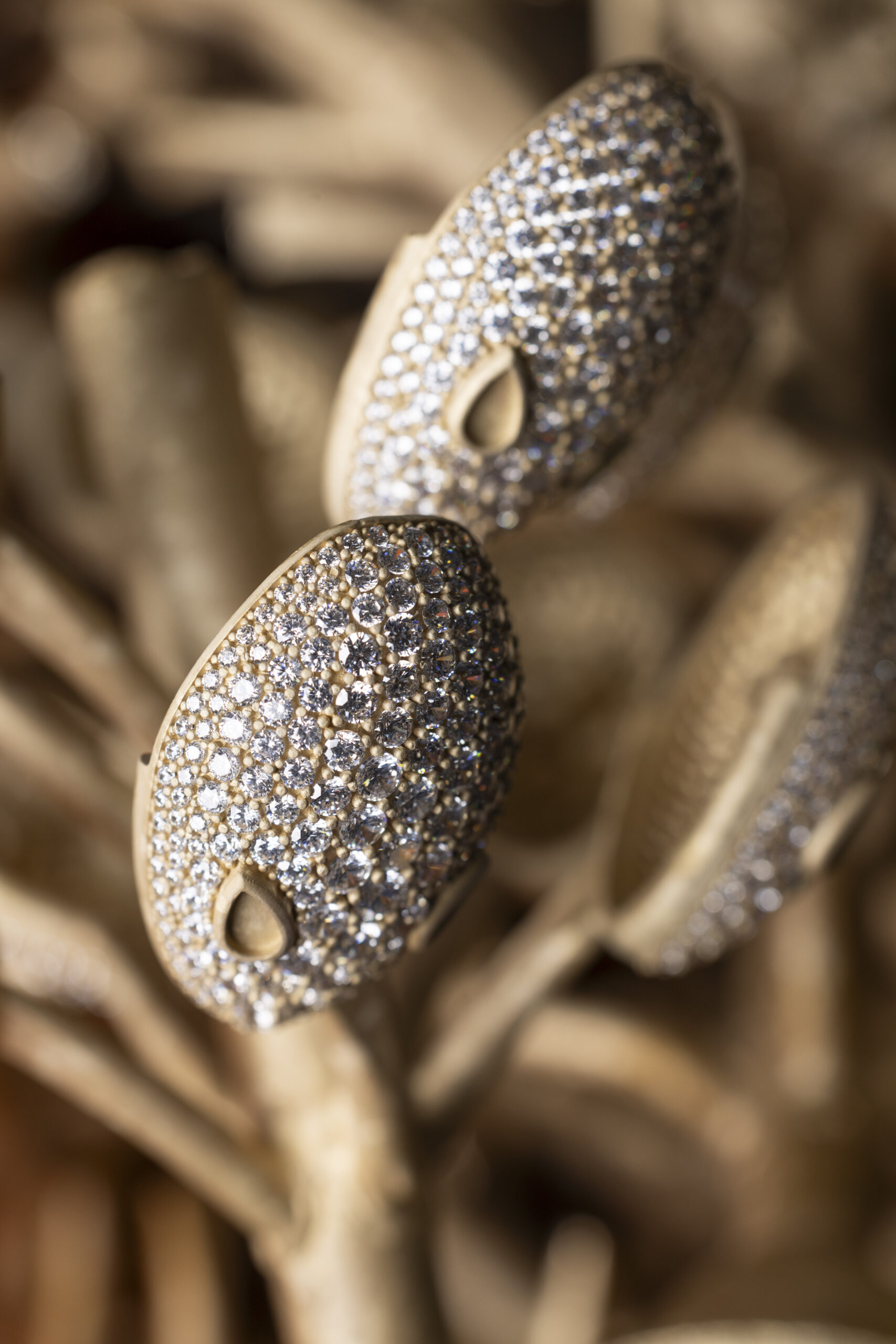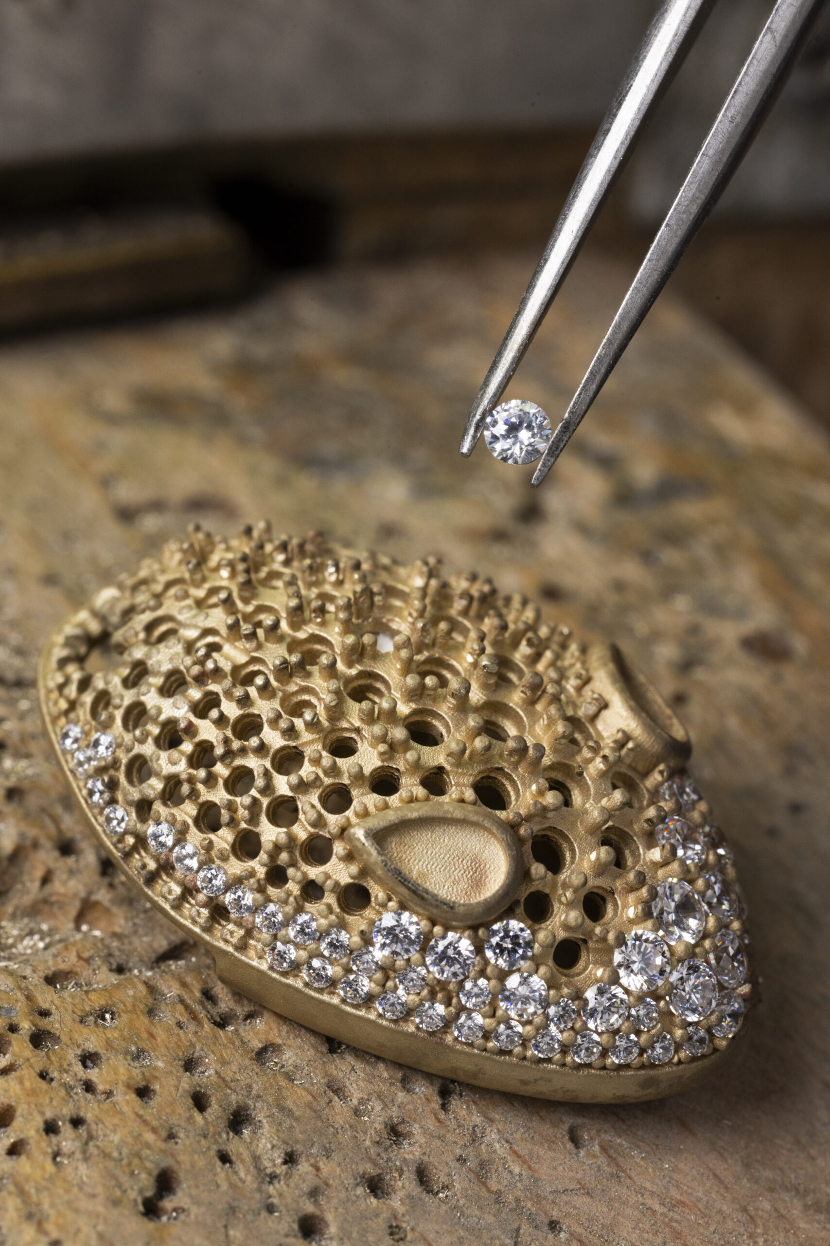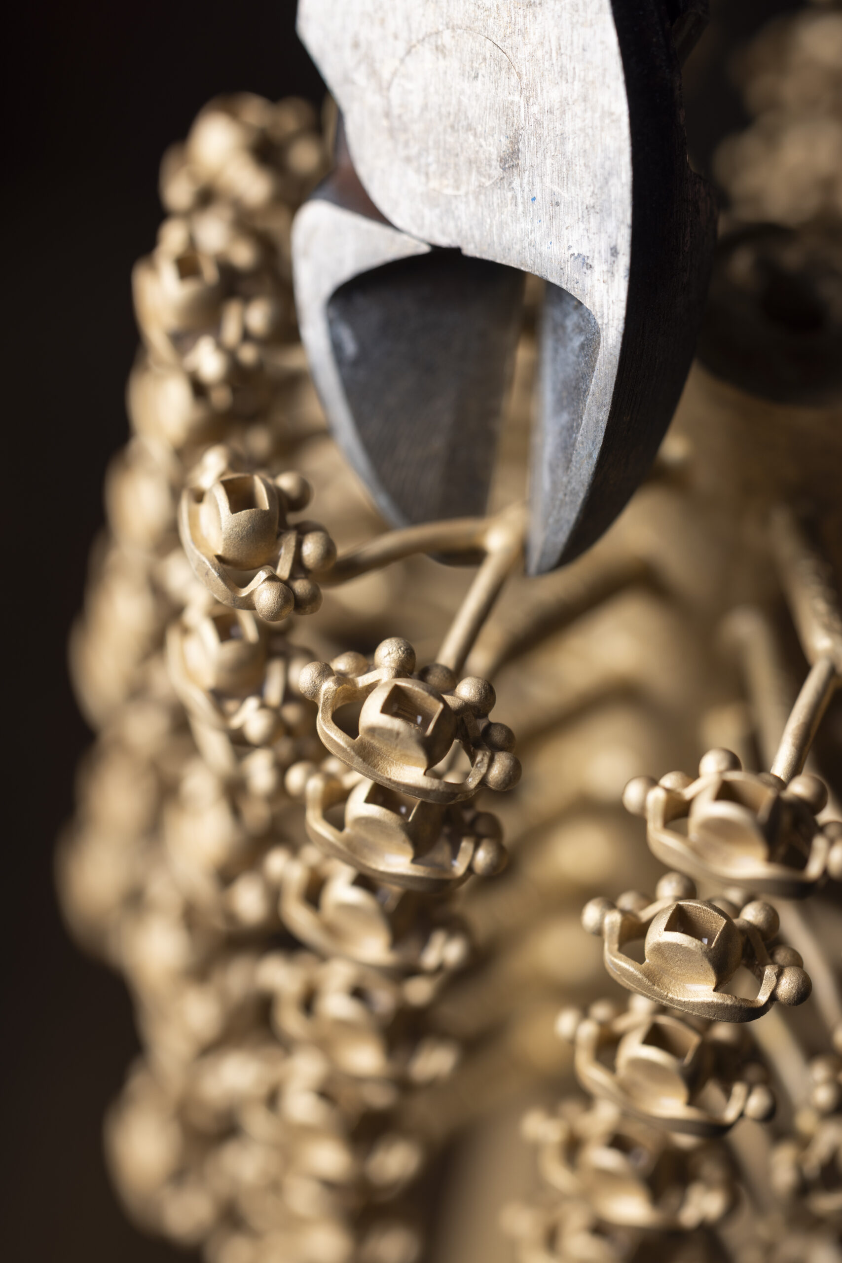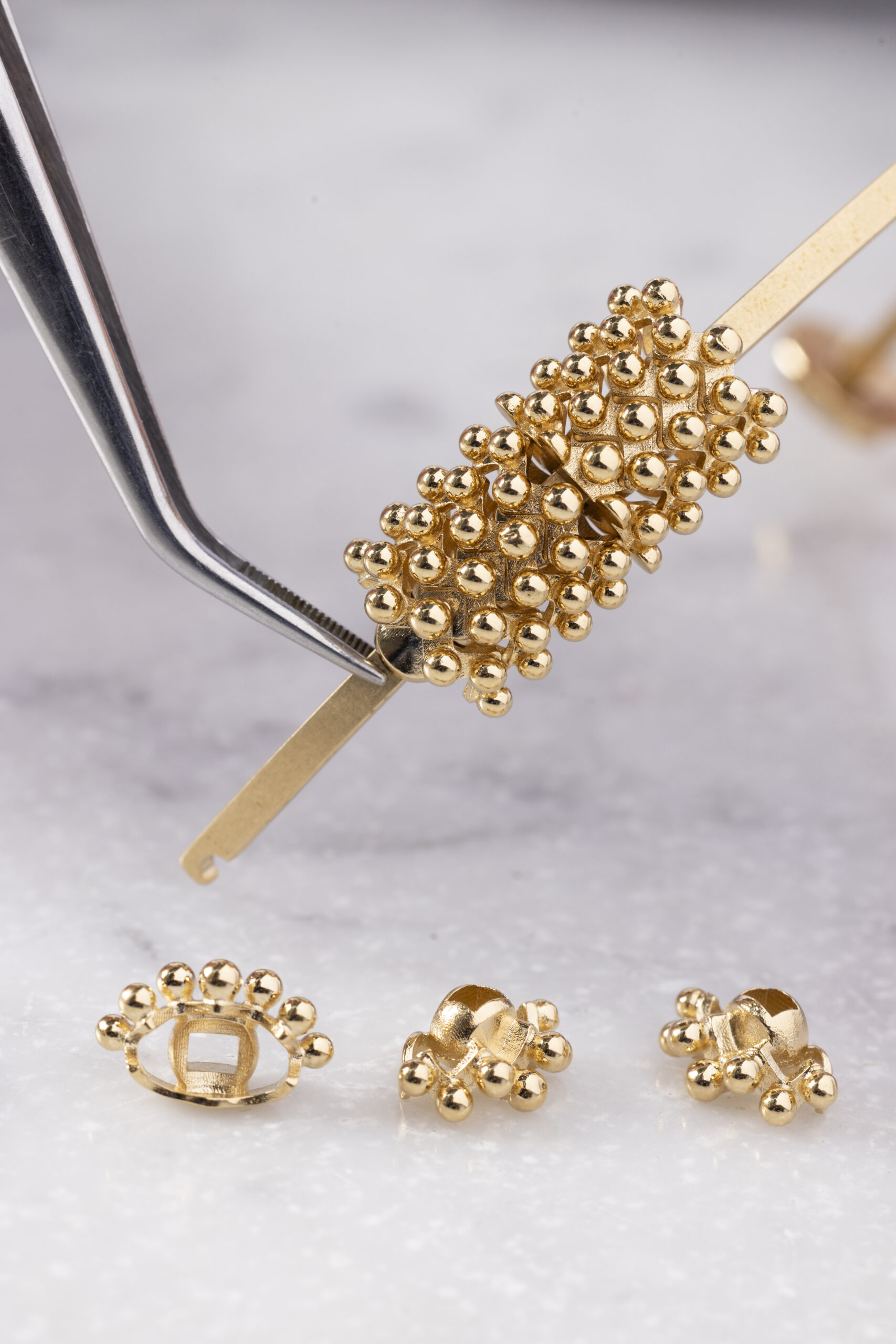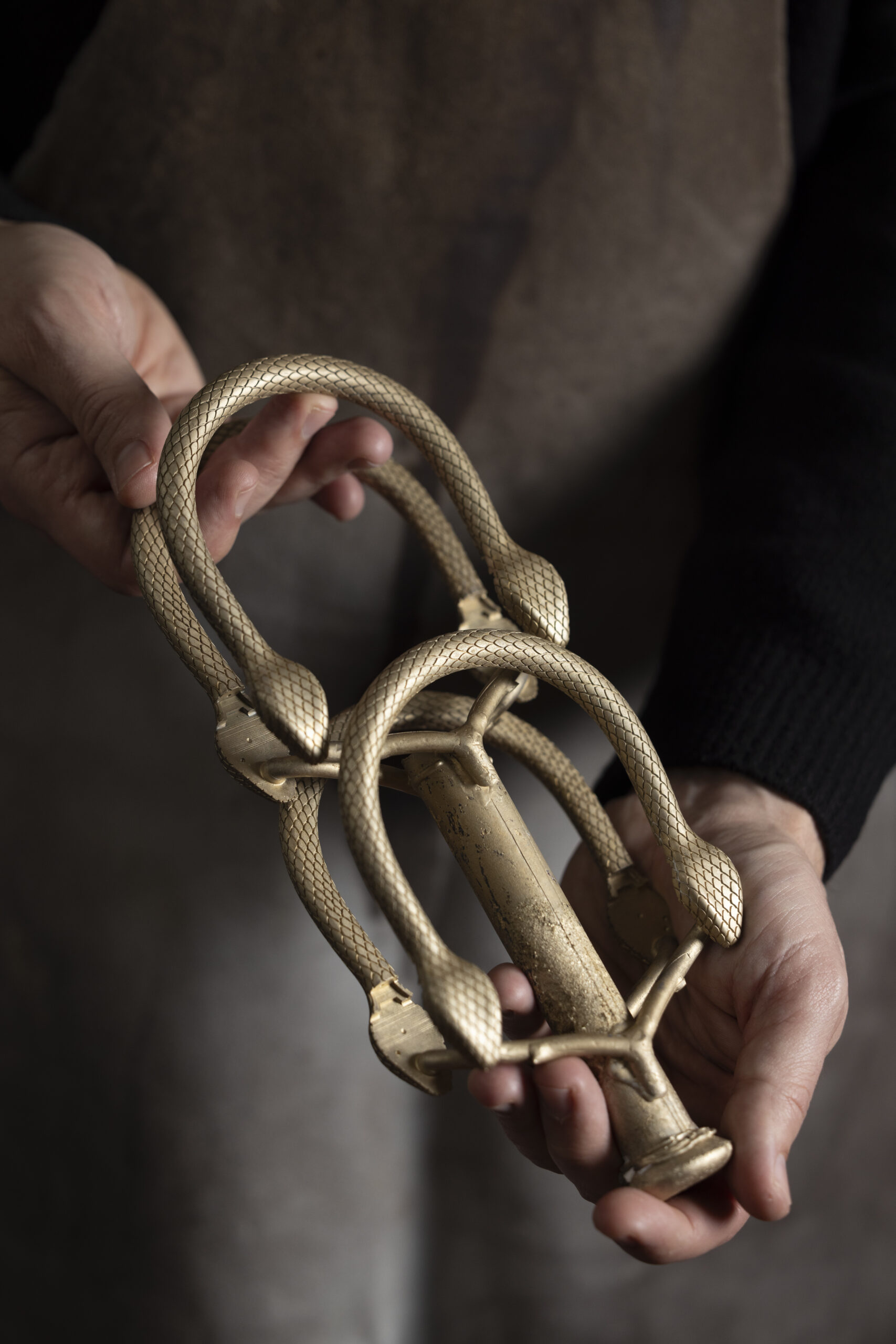 Le sac Serpenti Pallini, quant à lui, est un chef-d’œuvre de savoir-faire. La poignée exclusive, composée de 55 éléments métalliques ornés de billes assemblées à la main, crée une impression de mouvement unique. Le corps du sac en cuir de veau doré Liquid Metal est recouvert de près de 1260 perles et pierres coniques plaquées or, entièrement brodées à la main, témoignant de l’expertise artisanale de Bvlgari.