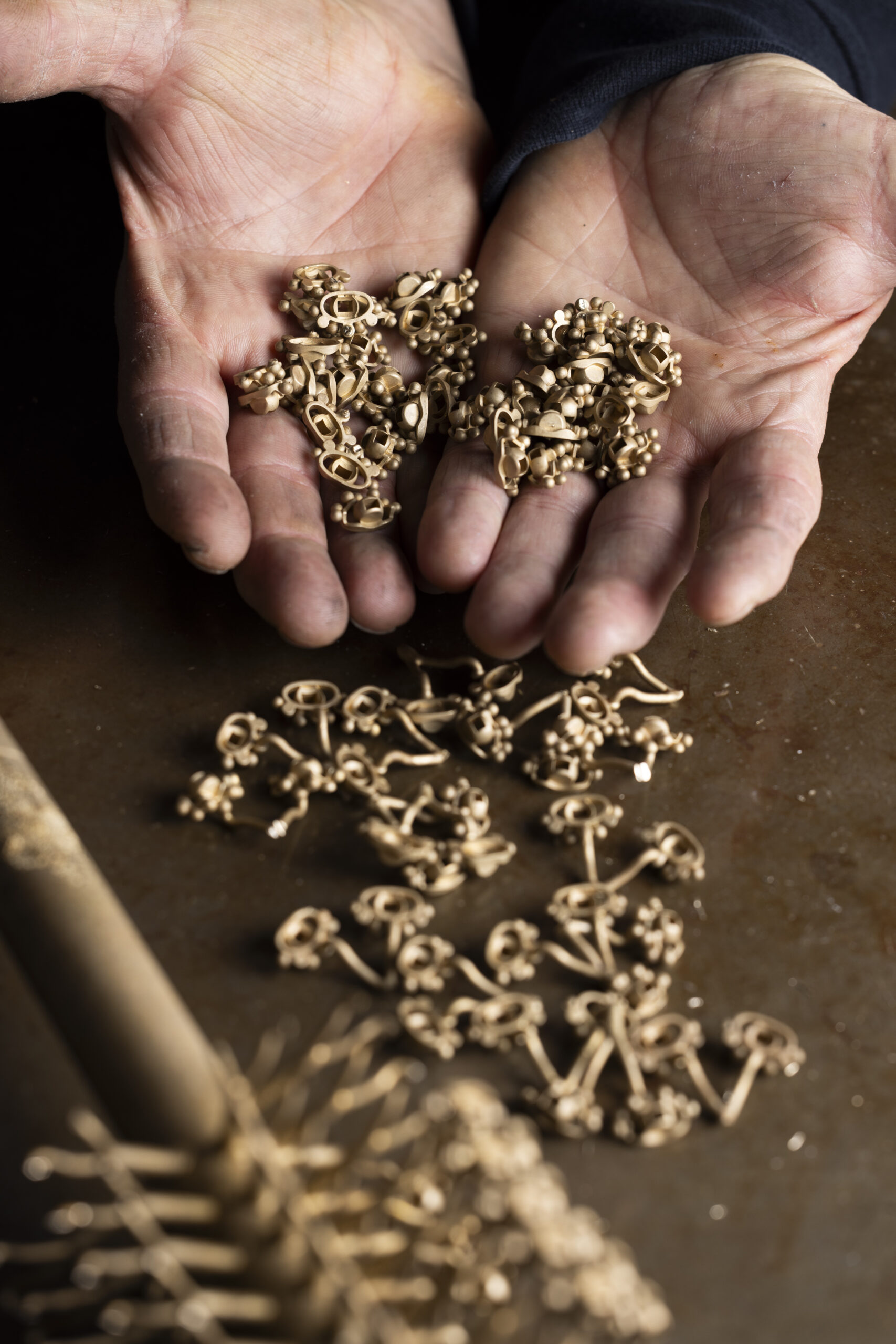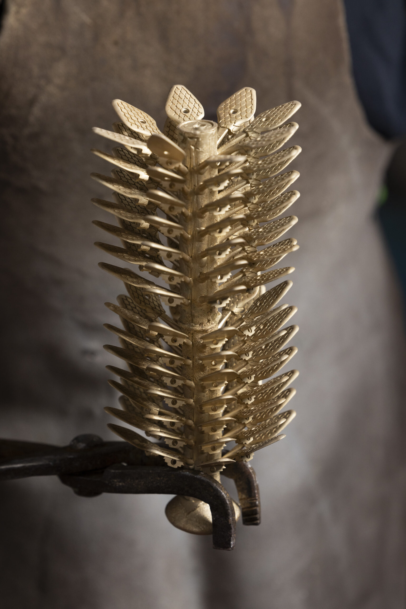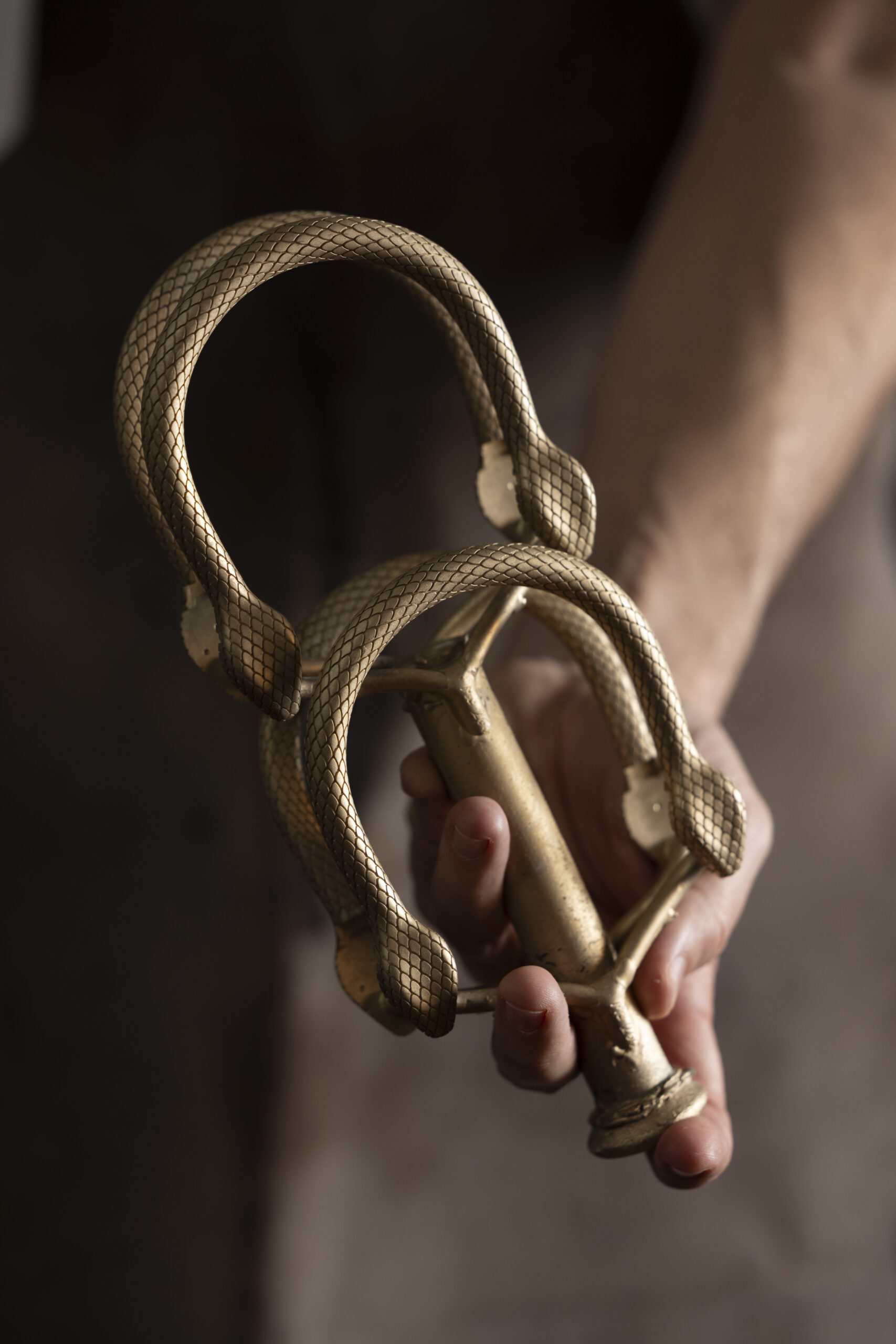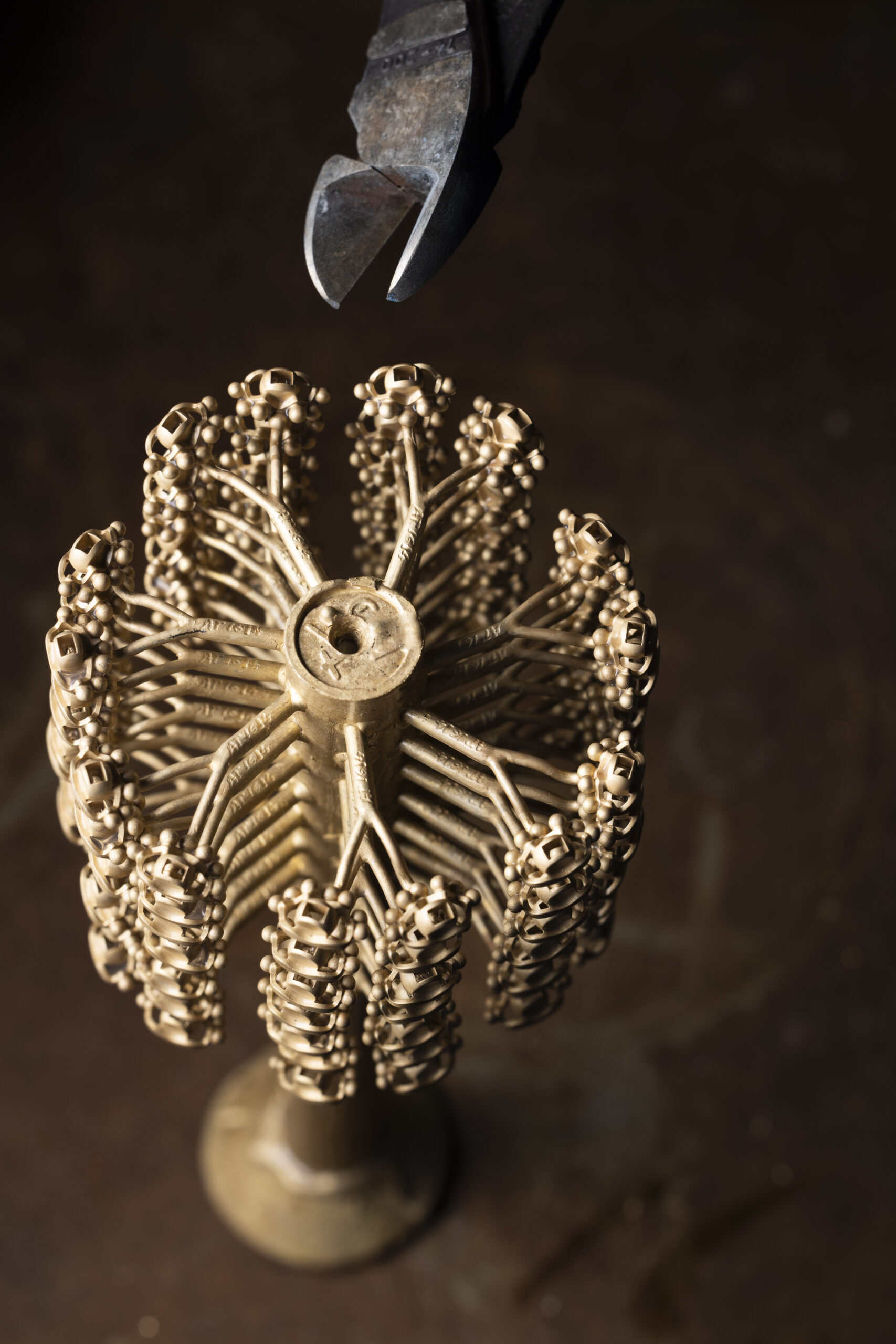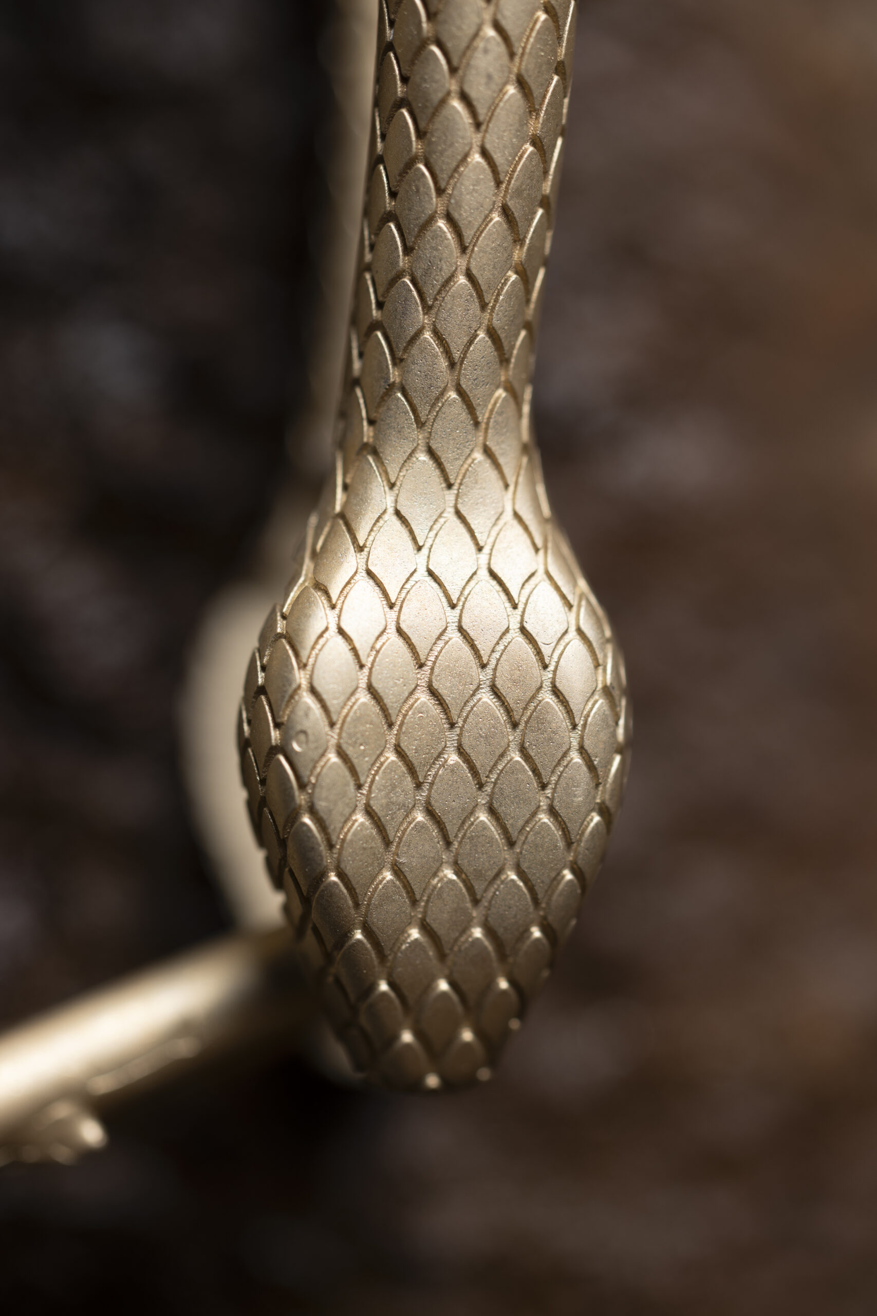 Le sac Serpenti Pallini, quant à lui, est un chef-d’œuvre de savoir-faire. La poignée exclusive, composée de 55 éléments métalliques ornés de billes assemblées à la main, crée une impression de mouvement unique. Le corps du sac en cuir de veau doré Liquid Metal est recouvert de près de 1260 perles et pierres coniques plaquées or, entièrement brodées à la main, témoignant de l’expertise artisanale de Bvlgari.