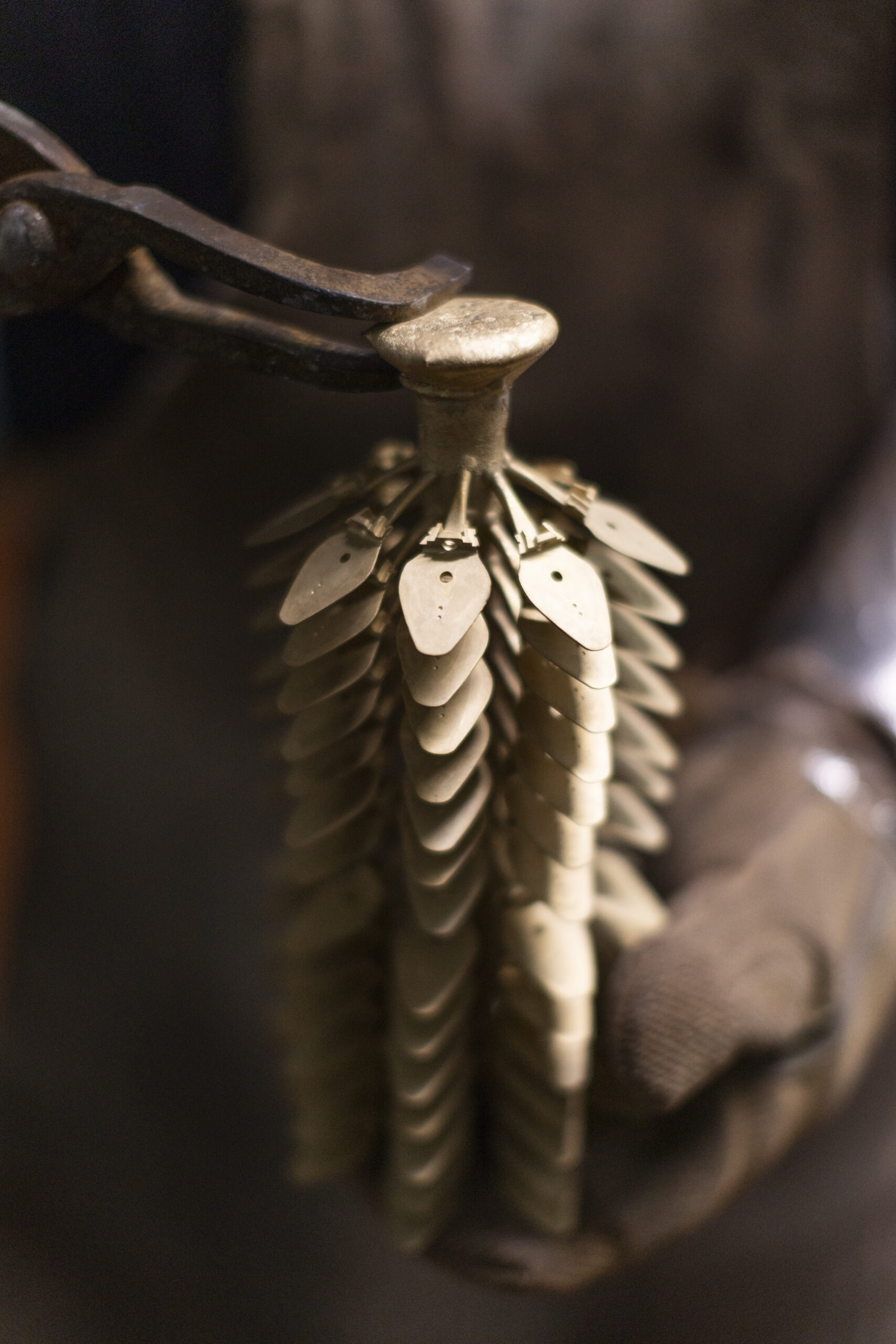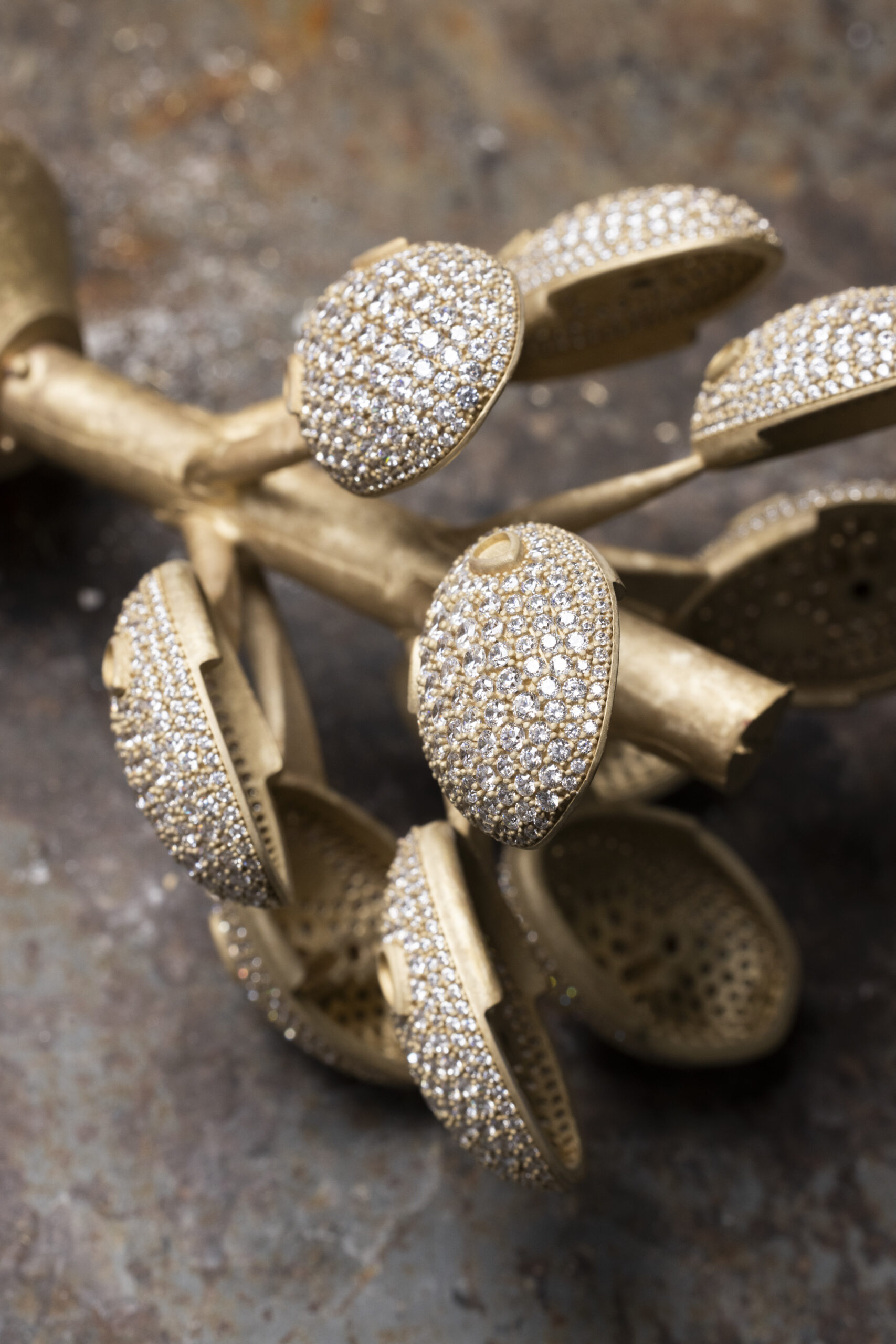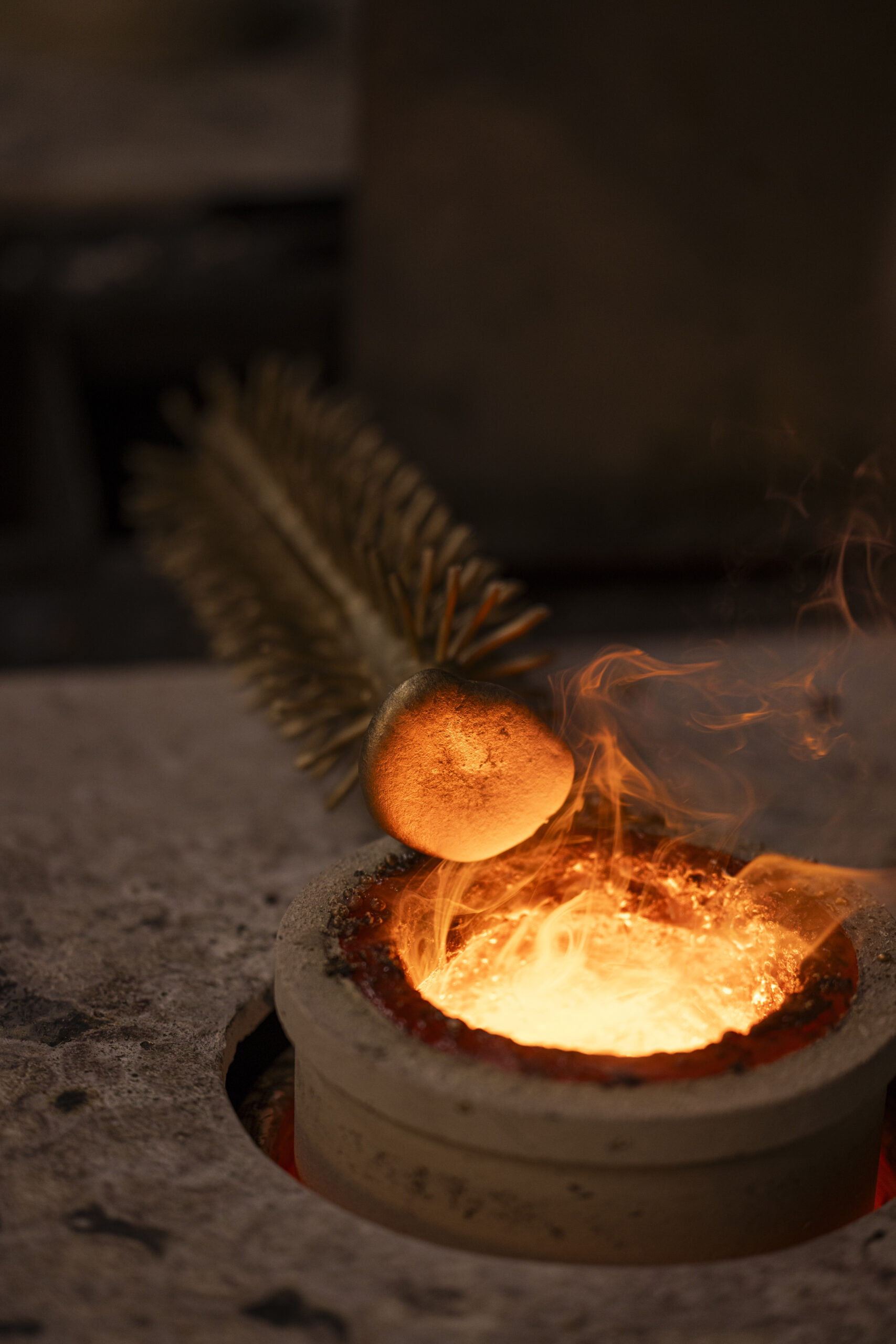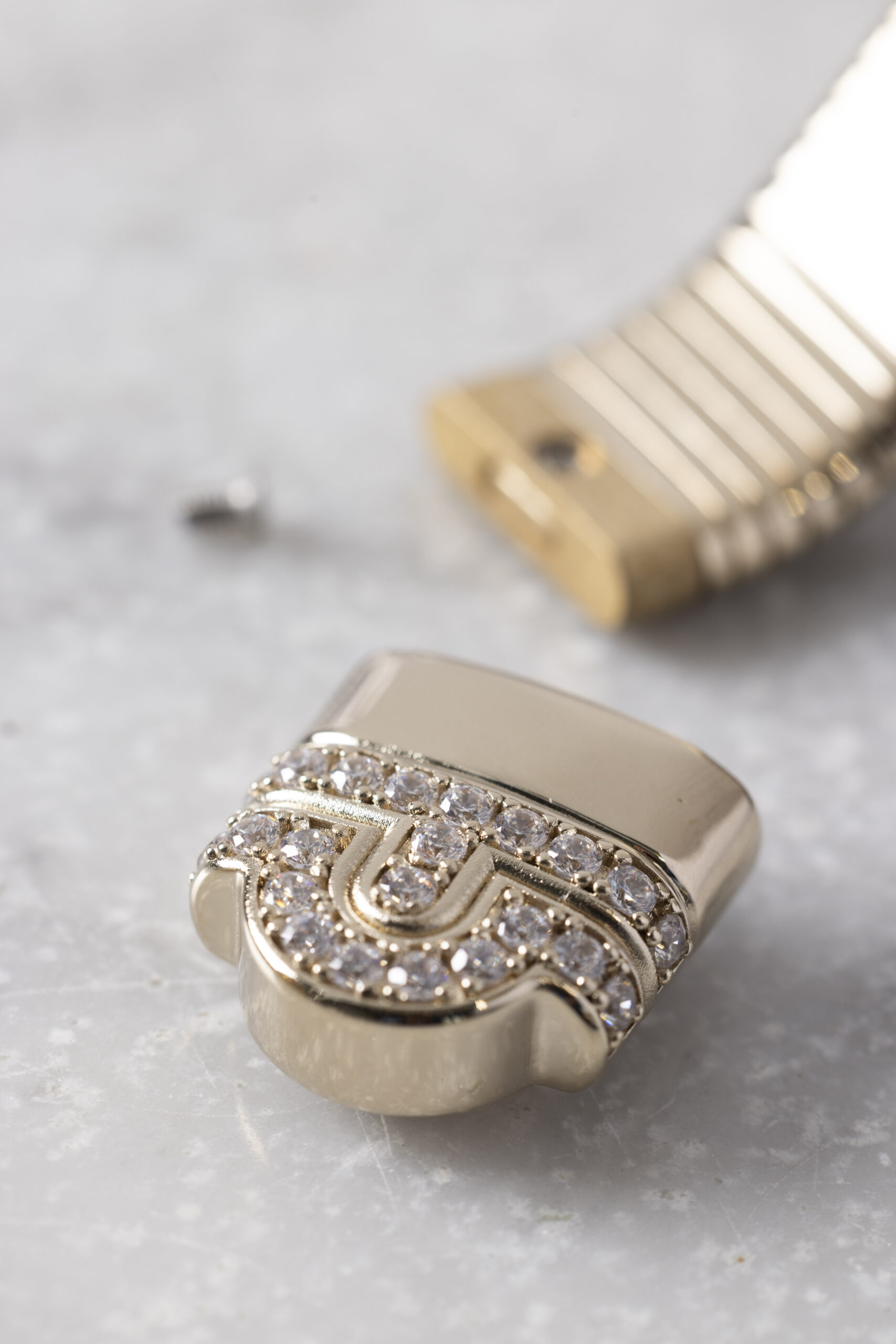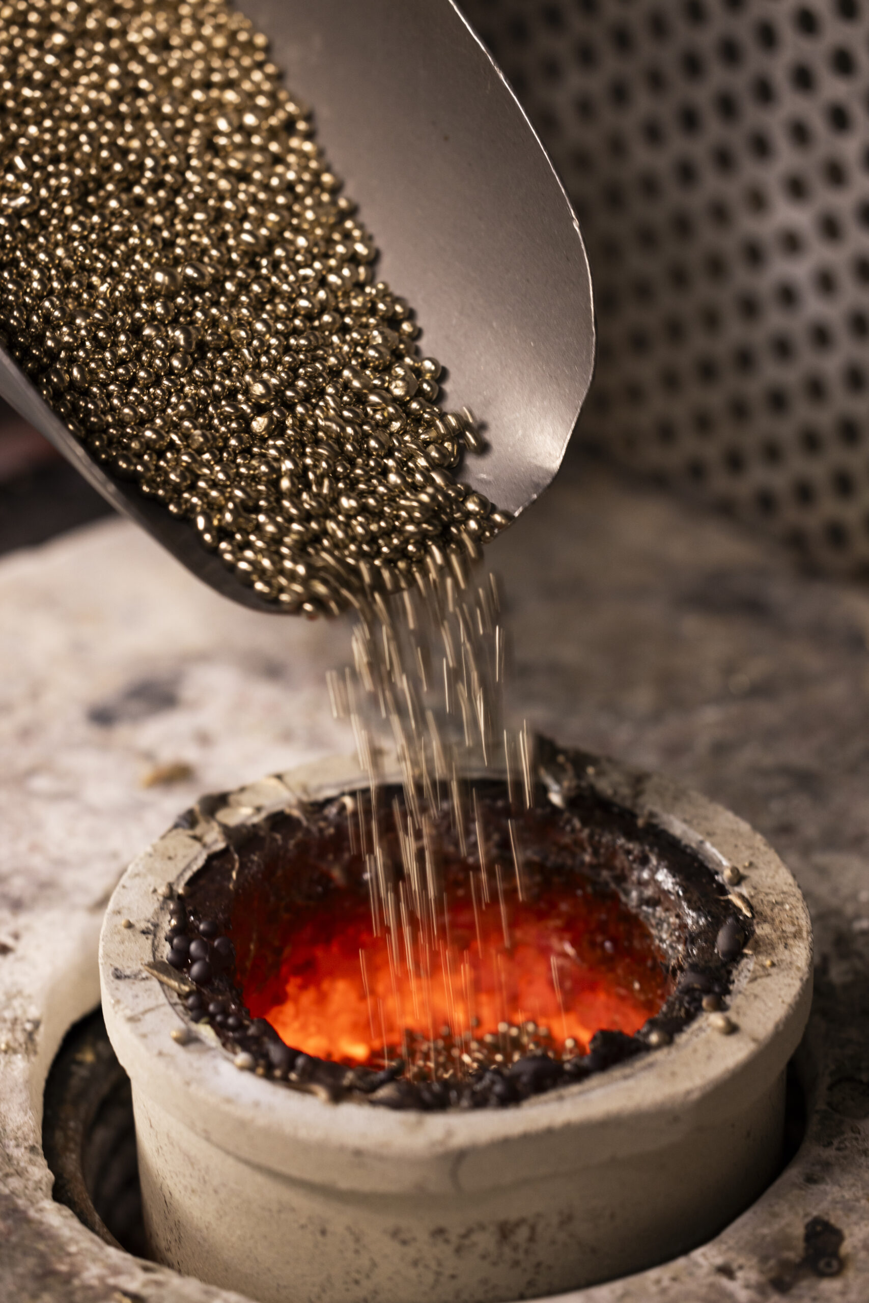 Le sac Serpenti Pallini, quant à lui, est un chef-d’œuvre de savoir-faire. La poignée exclusive, composée de 55 éléments métalliques ornés de billes assemblées à la main, crée une impression de mouvement unique. Le corps du sac en cuir de veau doré Liquid Metal est recouvert de près de 1260 perles et pierres coniques plaquées or, entièrement brodées à la main, témoignant de l’expertise artisanale de Bvlgari.